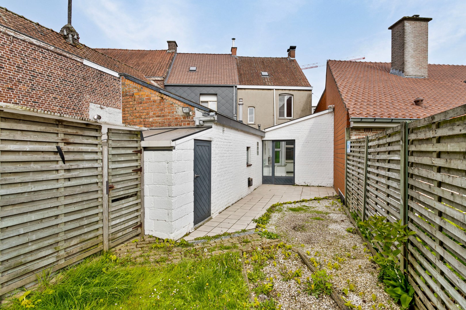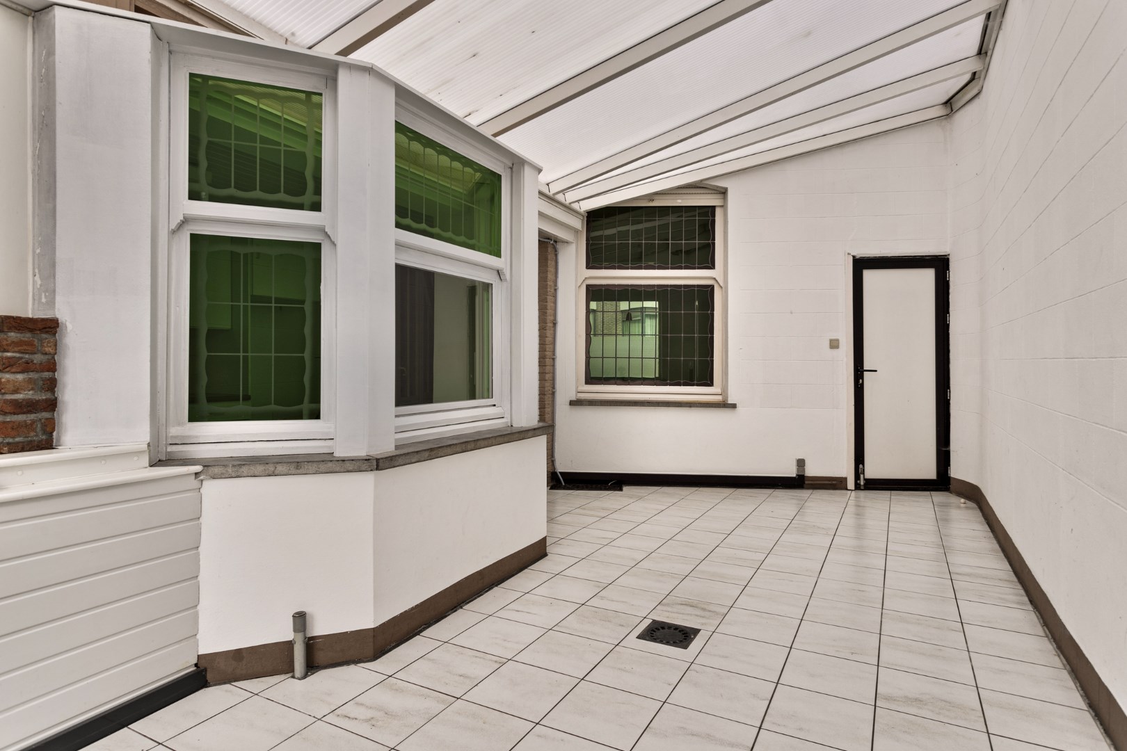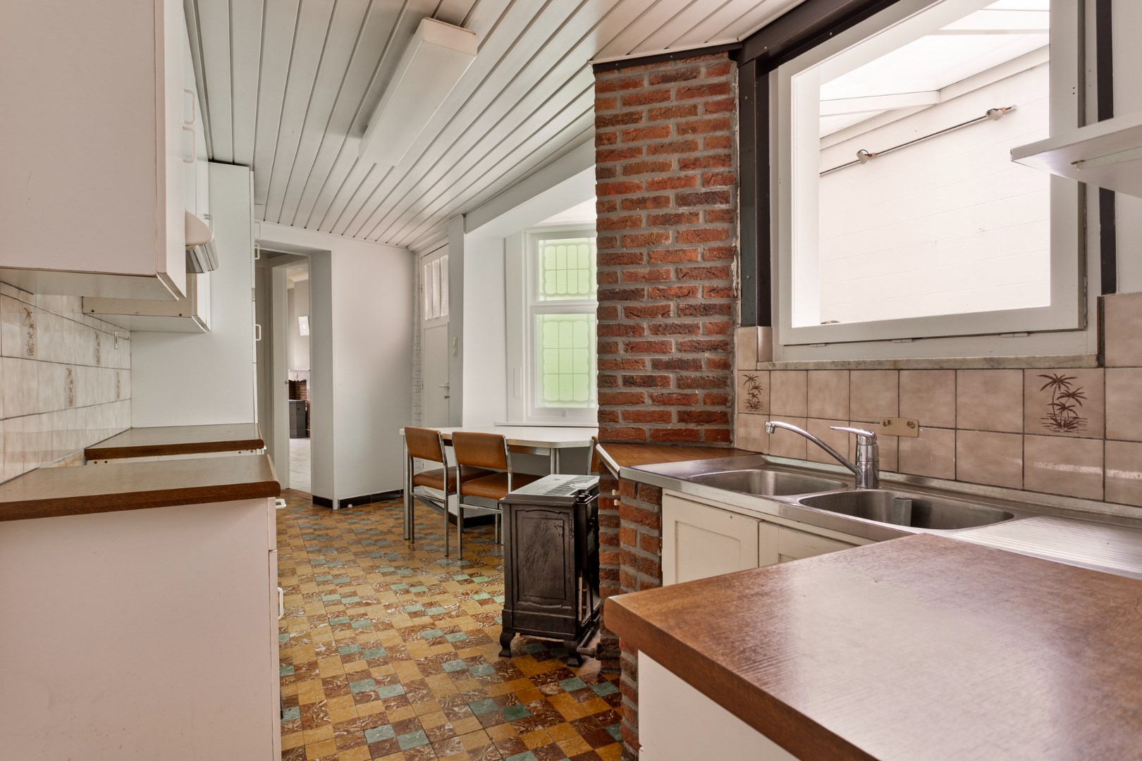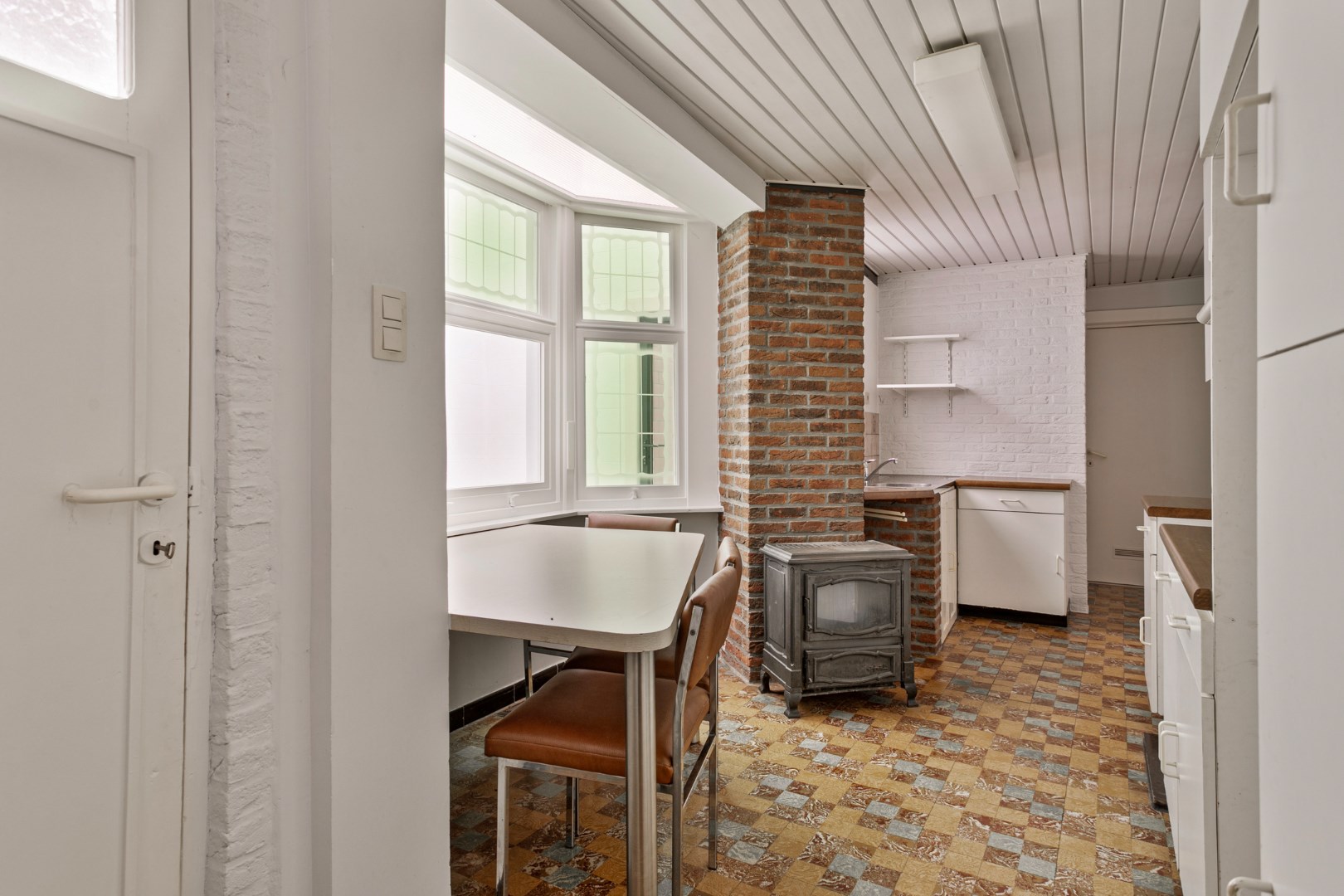 Ook de leefruimte heeft hoge plafonds en is door de grote ramen zeer lichtrijk. De keuken is achteraan gelegen en geeft via de mooi erker uit op de ruime veranda. van hieruit hebben we via de zijdeur toegang tot de straat. Een ideale verbinding dus om de straat te bereiken langs achter, zonder door heel de woning te moeten. Een grote troef!