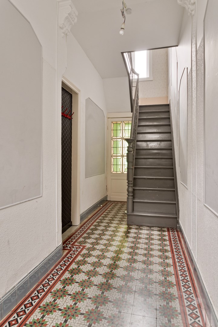 We komen binnen in de stijlvolle hal. De prachtige originele vloer, mouleren en de hoge plafond geven de woning heel wat cachet!