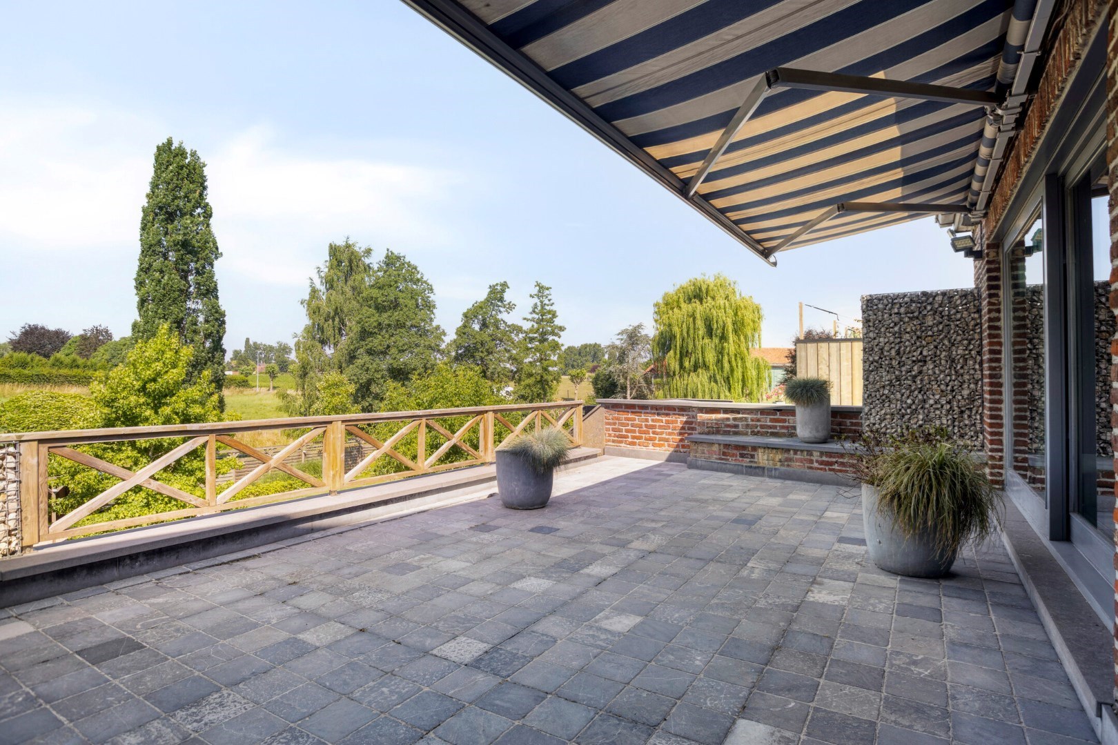 Op de 1e en 2e verdieping vinden we de woonst terug. Er is een prachtige, zeer ruime leefruimte met aangrenzend de keuken. We kunnen naar het gigantische terras met buitenkeuken. Van hieruit hebben we een mooi open zicht op de groene omgeving. Er is een trap die ons naar de mooie tuin leidt.