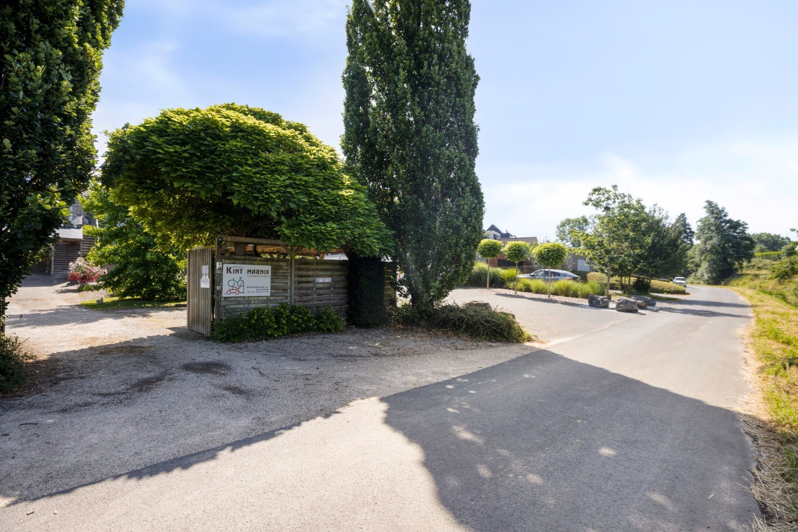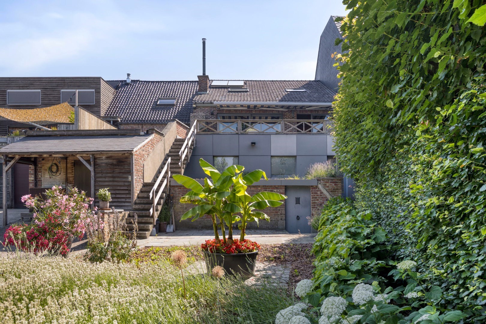 De tuin is bereikbaar via de garagestraat achteraan. Van hieruit kunnen we naar het terras en het atelier.