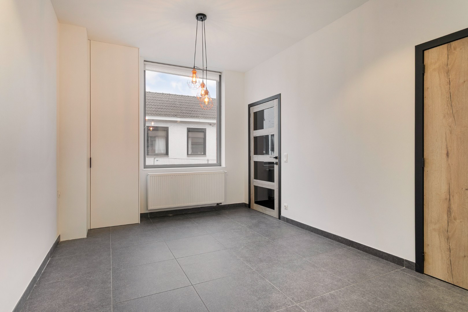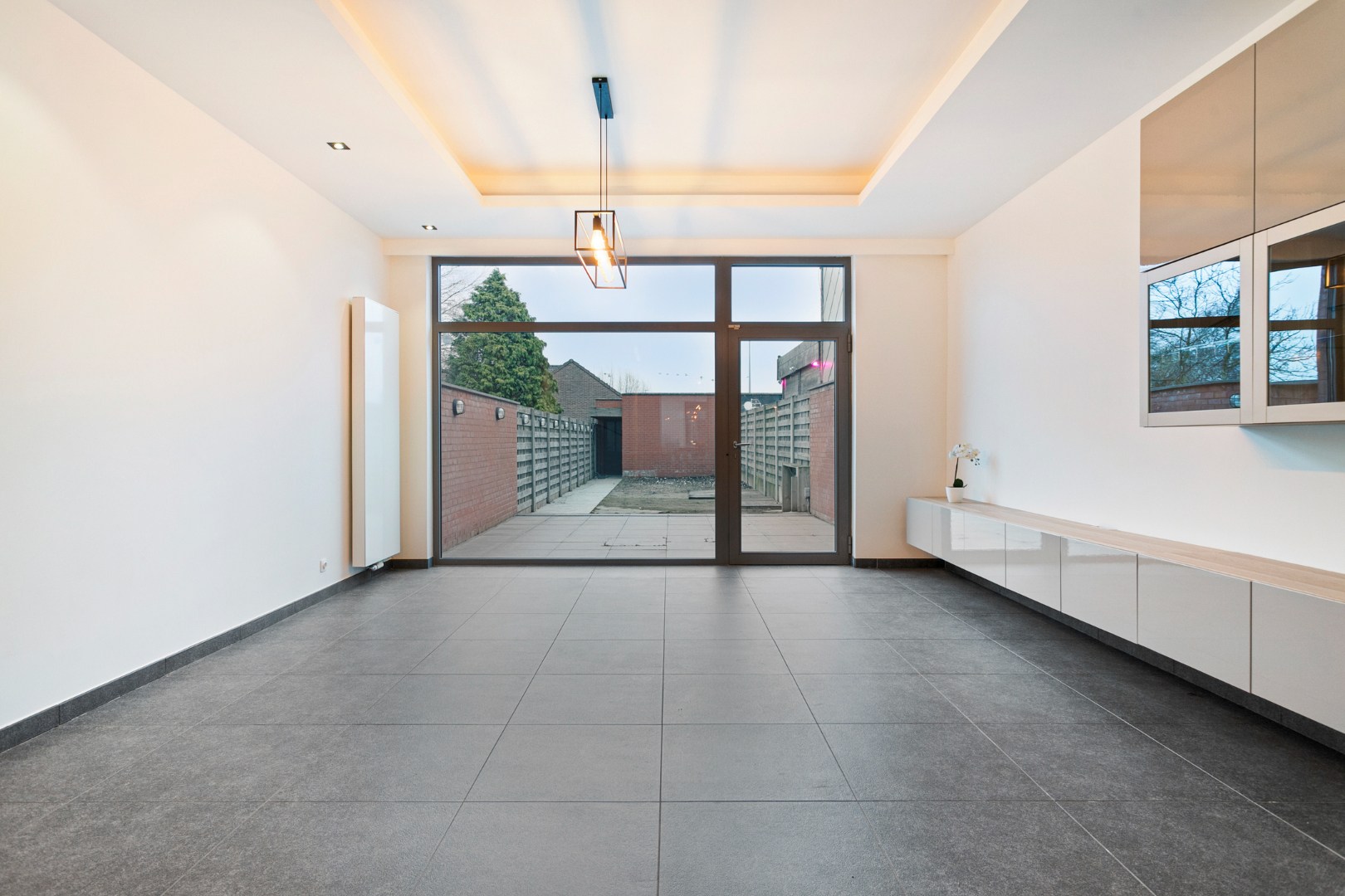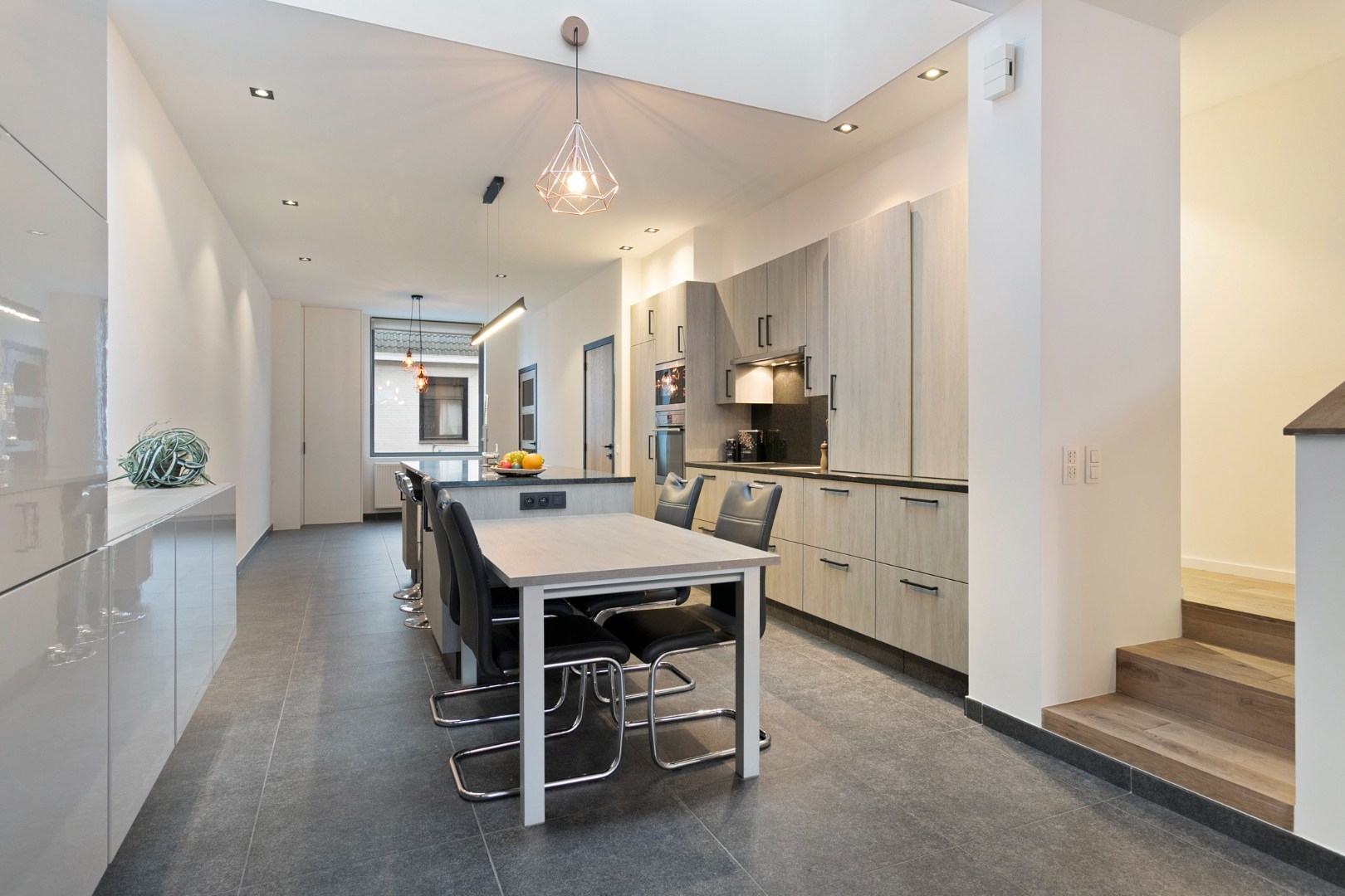 Deze woning bevindt zich op ‘Het Paradijs’ in Rekkem. Het is er heel rustig. De woning werd in 2011 prachtig gerenoveerd met hoogwaardige materialen. De voorgevel laat niet vermoeden dat er hierachter een heel grote benedenverdieping schuilgaat. We stappen de woning binnen en treffen in de inkomhal een gastentoilet. Via de mooie glazen deur gaan we vervolgens de leefruimte binnen. De leefruimte is één grote open ruimte die zich uitstrekt tot aan de achtergevel. Het keukengedeelte in het midden vormt een scheiding tussen het gedeelte langs de voorzijde waar bijvoorbeeld plaats is voor een buro en het salon langs de achterkant. De keuken met eiland en eettafel is heel mooi en zeer gerieflijk. De keuken is volledig ingericht met AEG-toestellen (vaatwas, koelkast met vriesvak, oven, microgolfoven en inductiekookplaat). Het aansluitend salon baadt dankzij het grote raam in het zonlicht. In de leefruimte zijn meerdere vaste kasten aangebracht die een mooi geheel vormen.