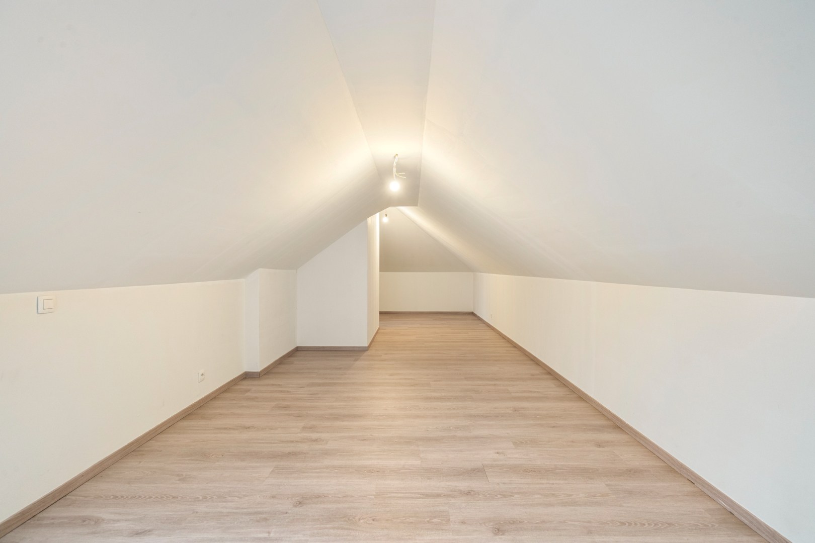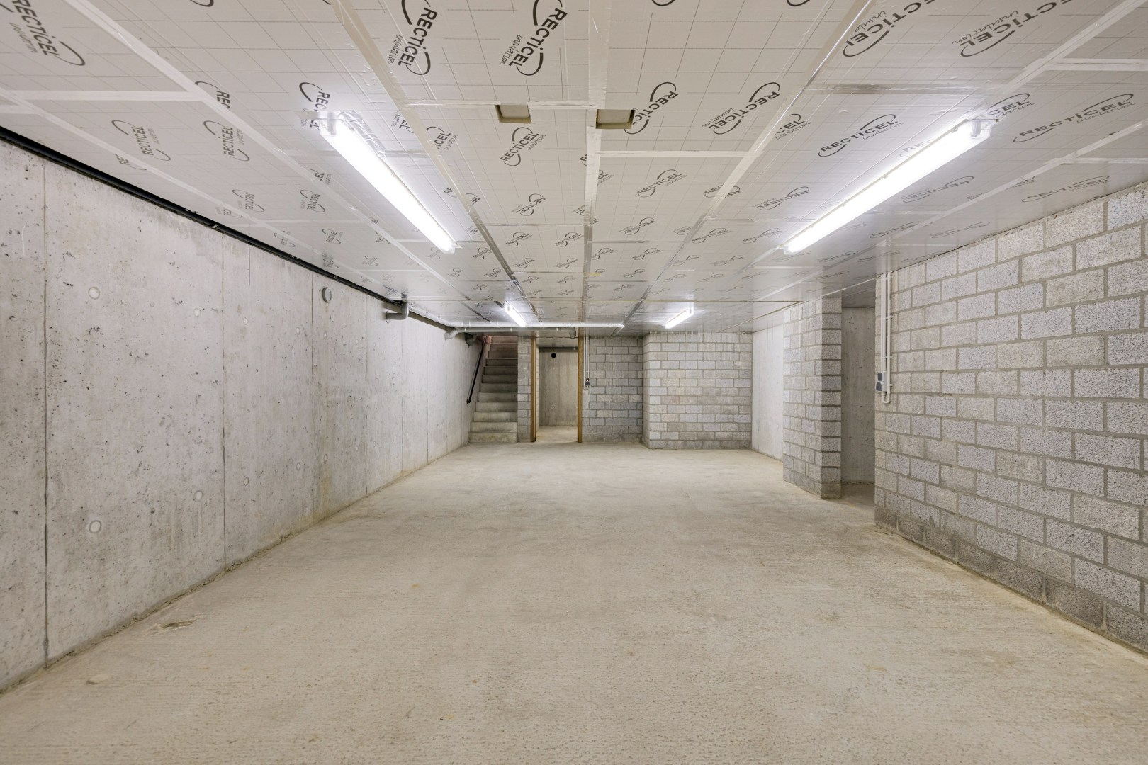 Achteraan is er de grote garage met elektrische poort. Via de garage kunnen we naar de kelder en de afgewerkte verdieping. Deze is bereikbaar ofwel via een valtrap in de hal of een vaste trap in de garage. Hier is het perfect mogelijk om 2 extra kamers in te richten.