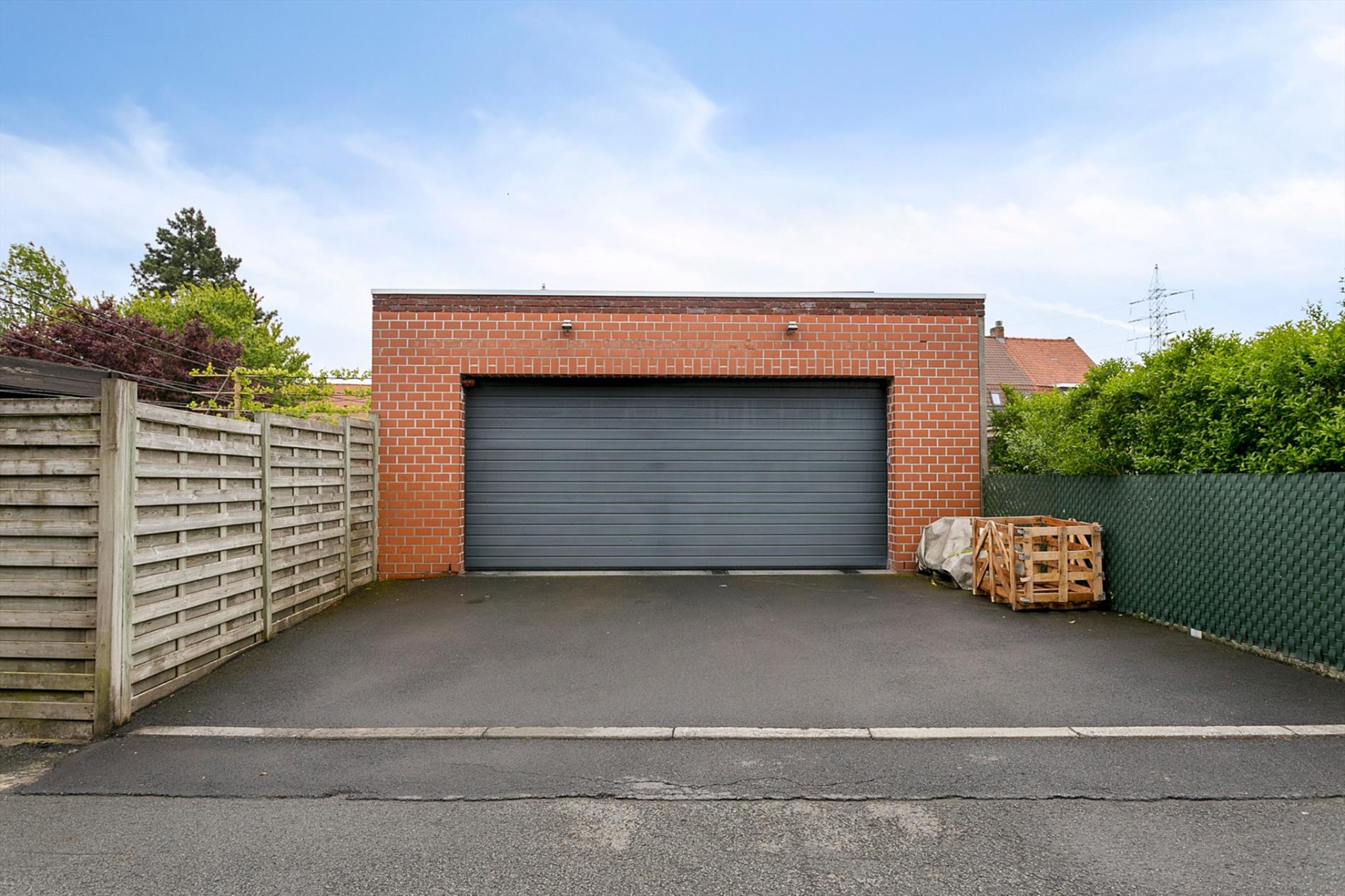 Aan de achterzijde van de woning is er een dubbele garage met elektrische sectionaalpoort. Ook hier is er nog een zee aan ruimte voor het bergen van wagens, fietsen of het uitoefenen van een zelfstandig beroep.