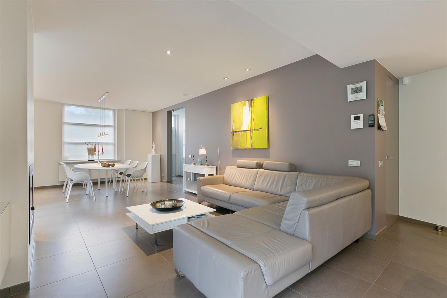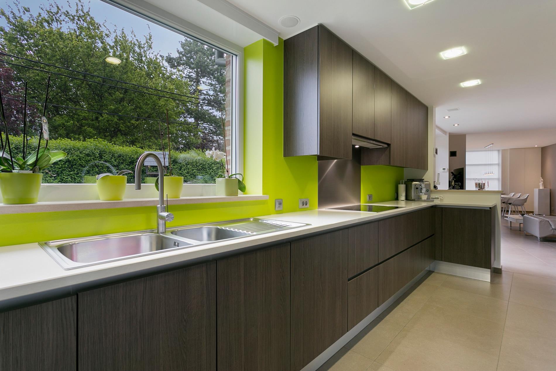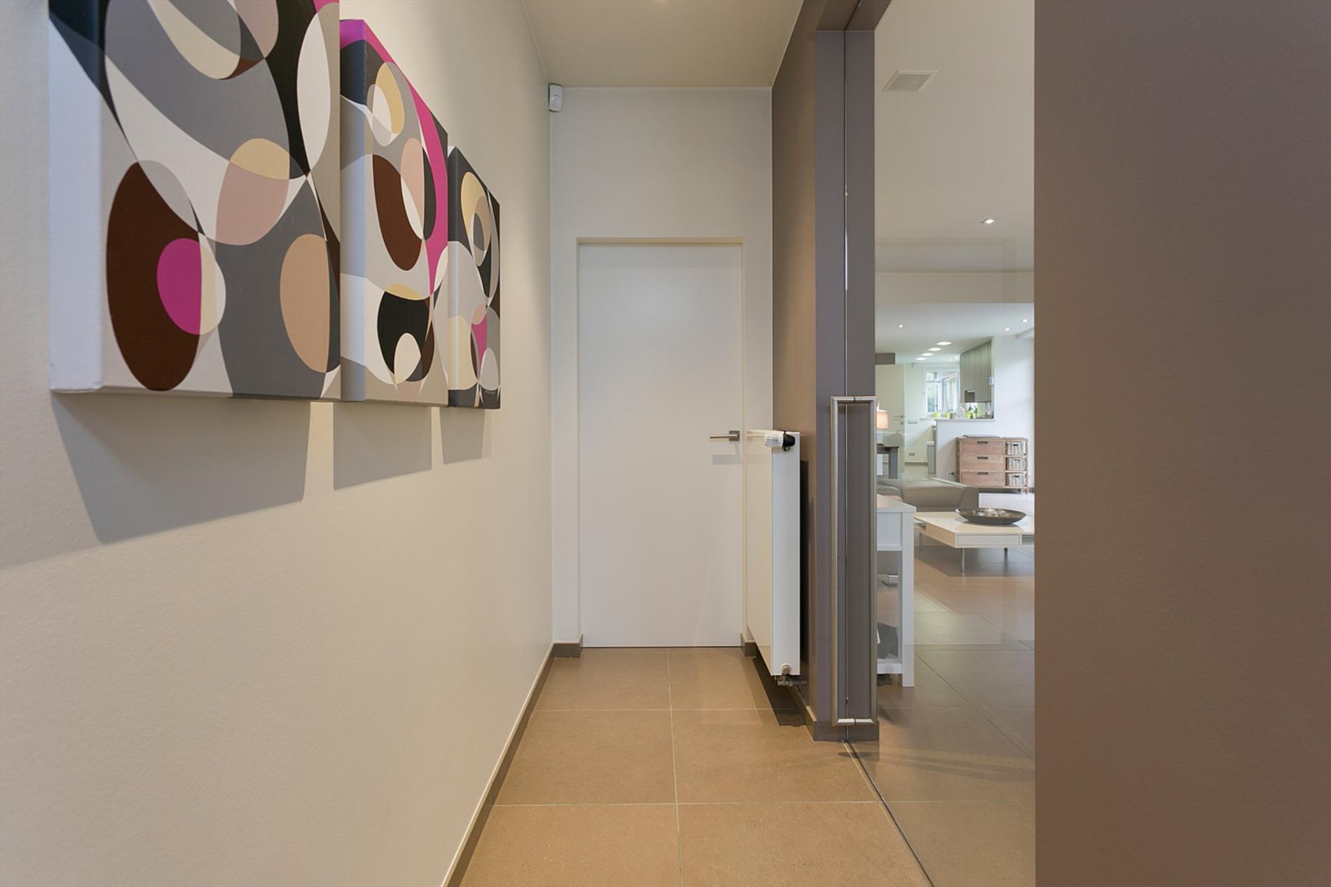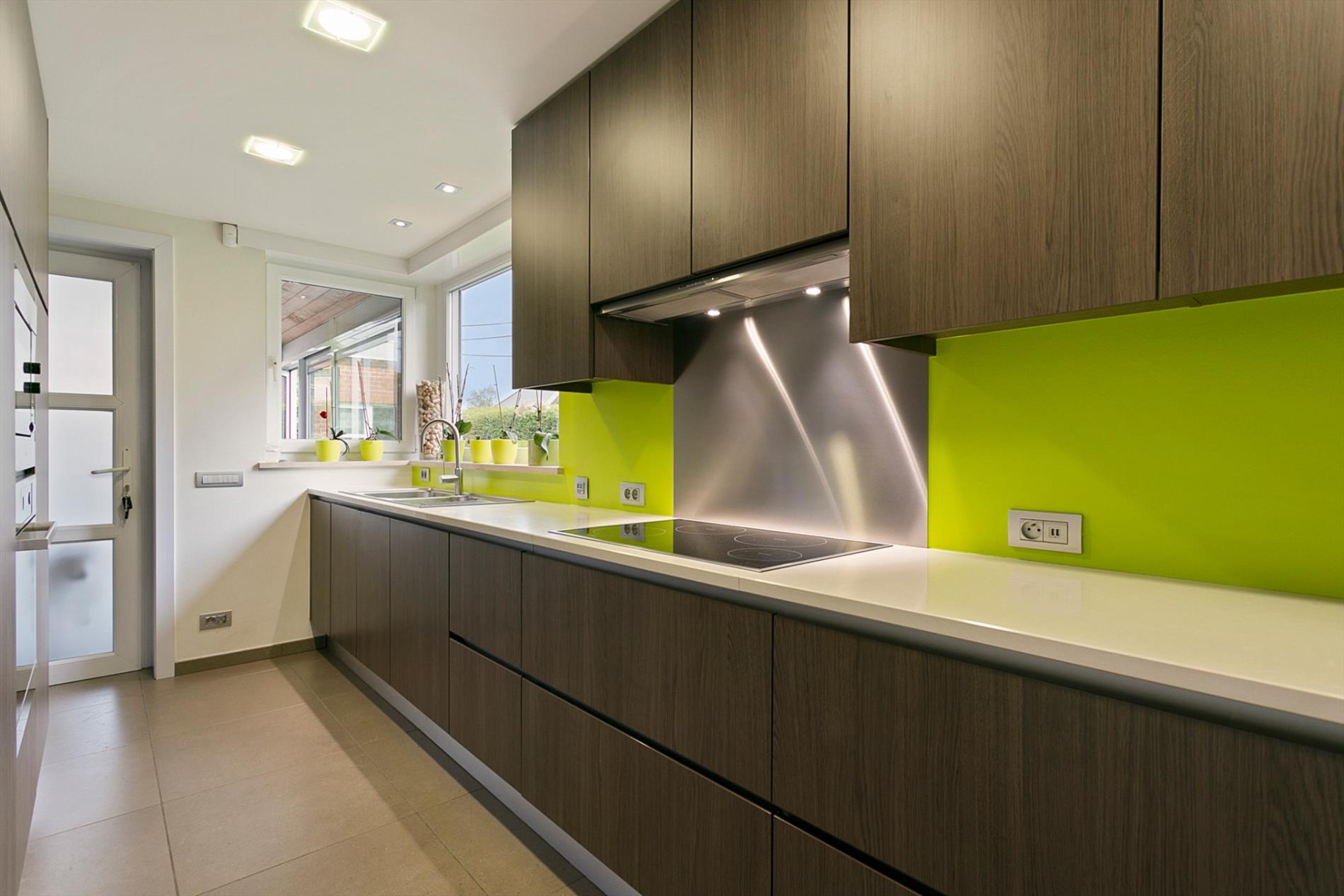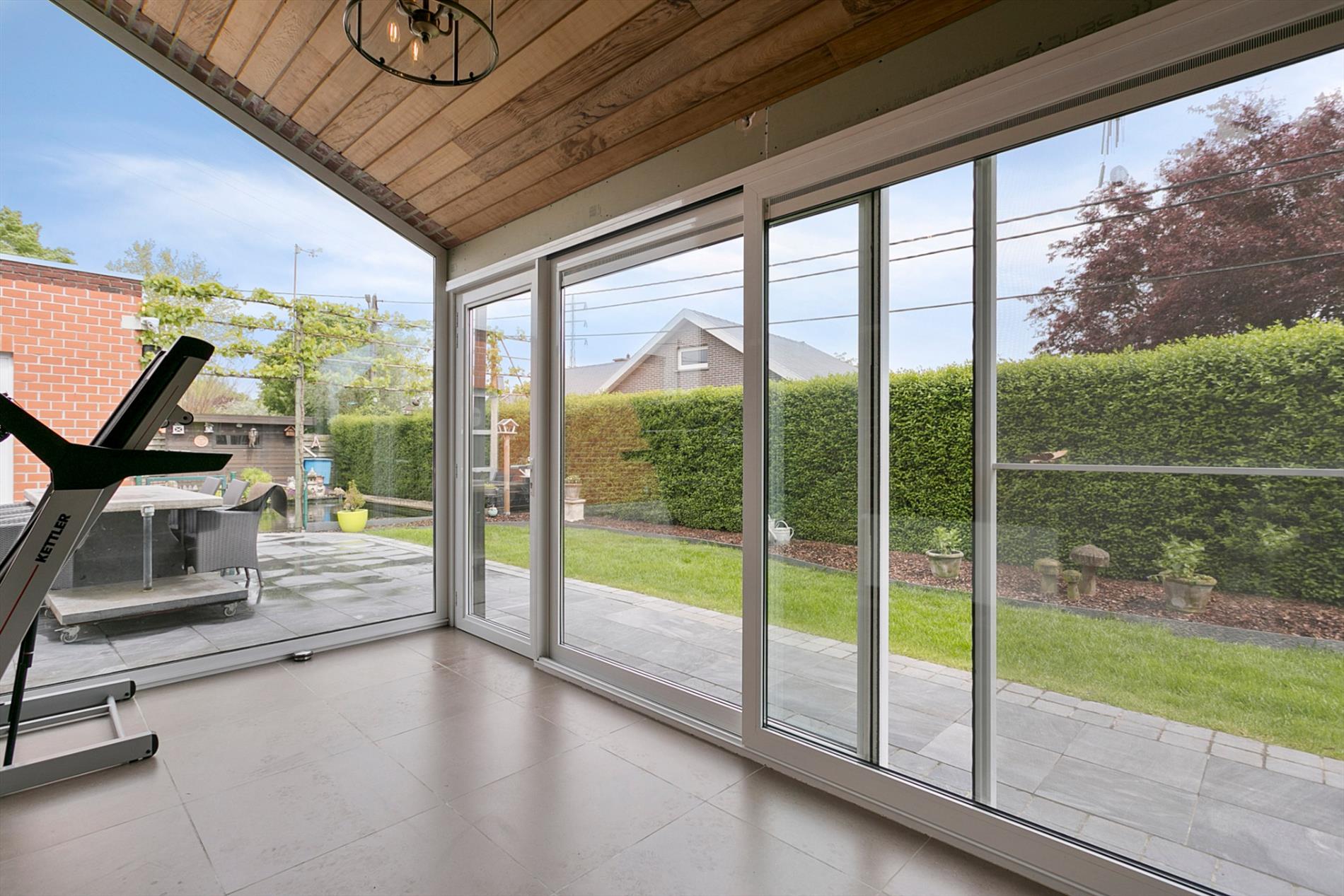 De voorgevel van deze woning met leuke voortuin verraadt reeds dat het hier om een uniek eigendom gaat. Alhoewel de verwachtingen hooggespannen zijn, overtreft de werkelijkheid alles. Reeds in de inkomhal geeft de mooie glazen deur zicht op de adembenemende living. Eenmaal binnen in de leefruimte worden we overweldigd door de ruimte en het licht. Niets kon laten vermoeden dat de living zo groot is. De mooie, witte hangkasten en de pellethaard zorgen voor extra gezelligheid terwijl we door de vele ramen een blik werpen op de piekfijn onderhouden tuin.