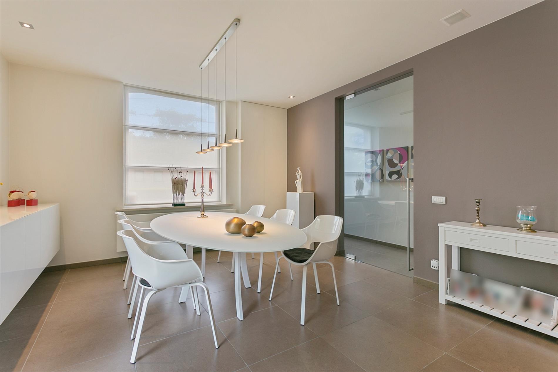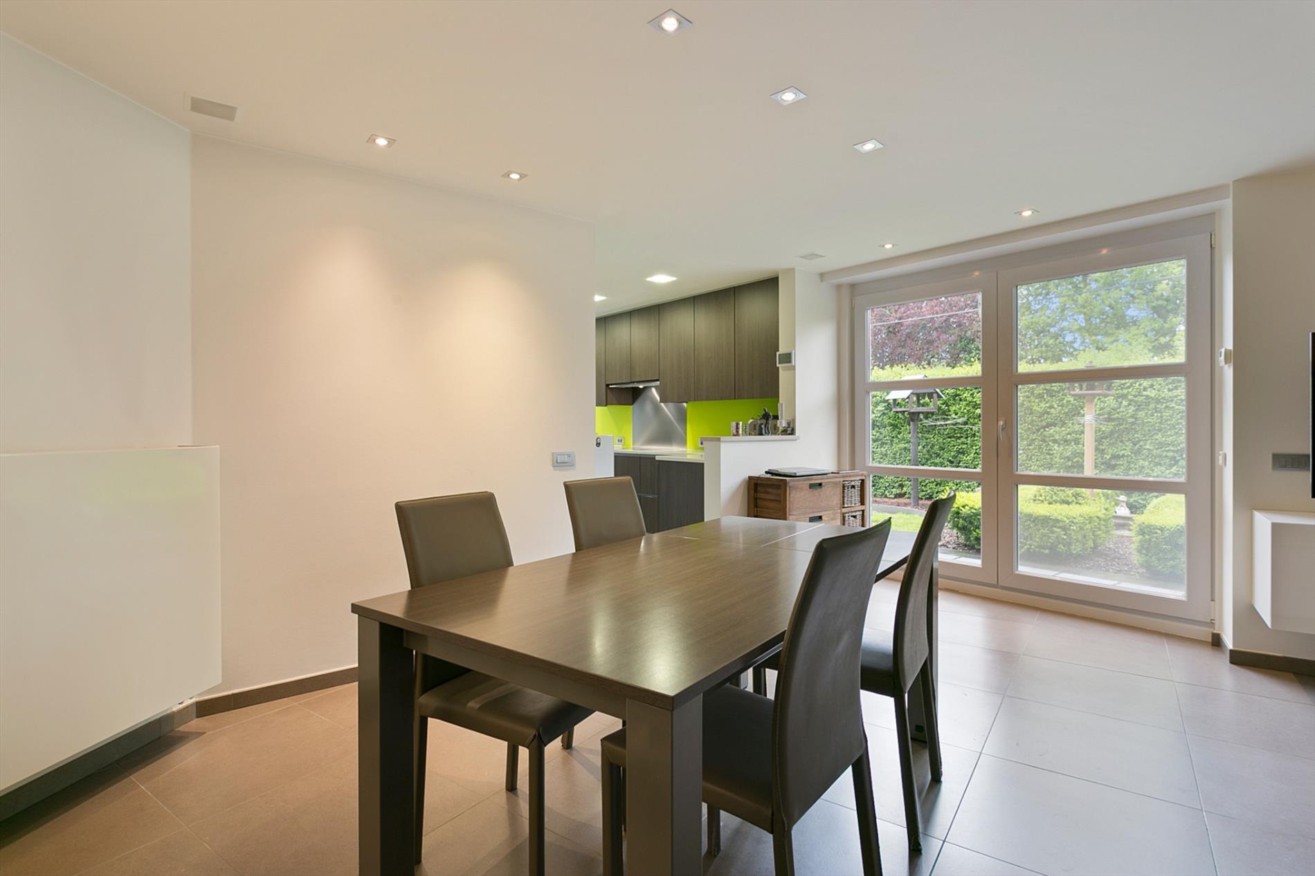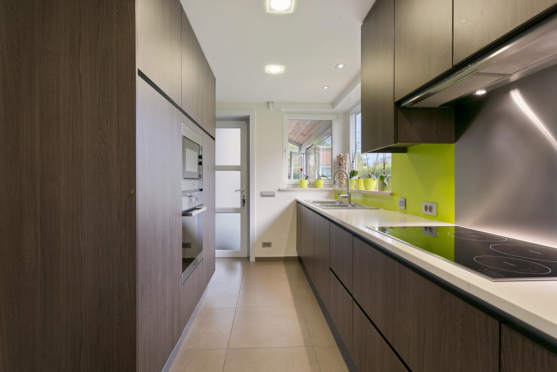De stijlvolle maatkeuken met composieten blad is uitgerust met alle toestellen. Ontbijten kan zowel in de ontbijthoek als in de aanpalende veranda waar het puur genieten is.