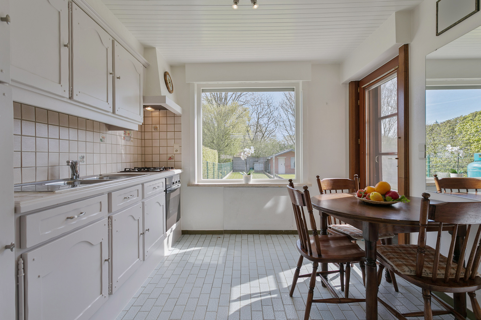 De praktische keuken sluit aan bij de leefruimte en is eveneens grenzend aan de tuin. Via de keuken kunnen we naar de garage die ruim genoeg is voor extra stockage, wasmachine,... Er is ook nog een extra douche in de garage. Vanuit de garage hebben we ook toegang tot de handige kelder.