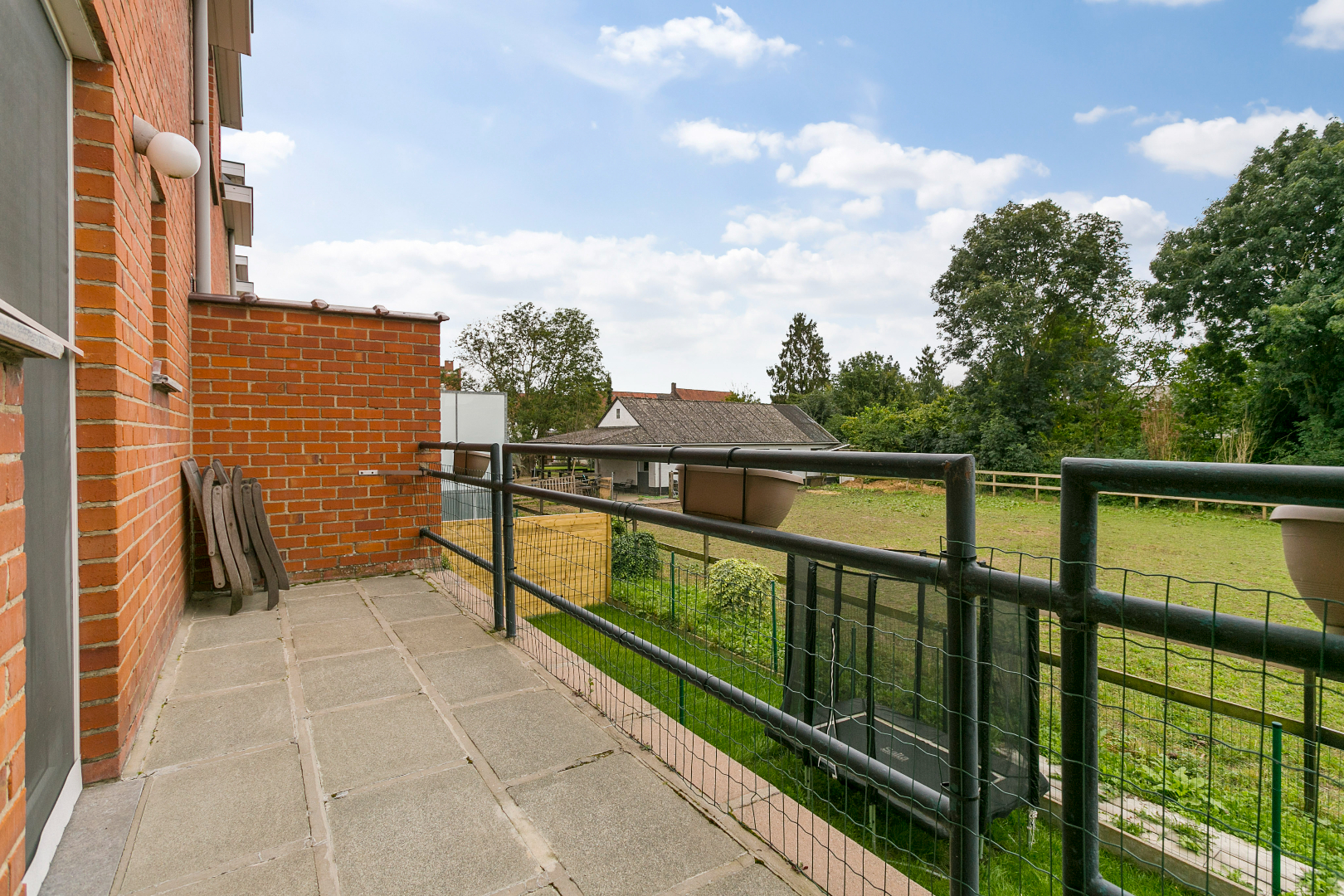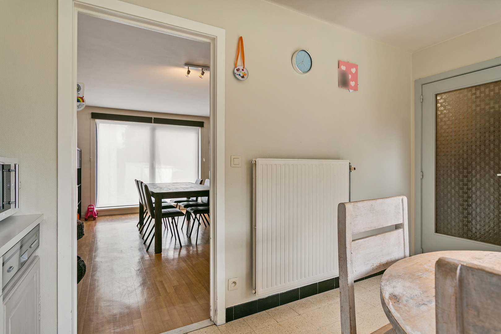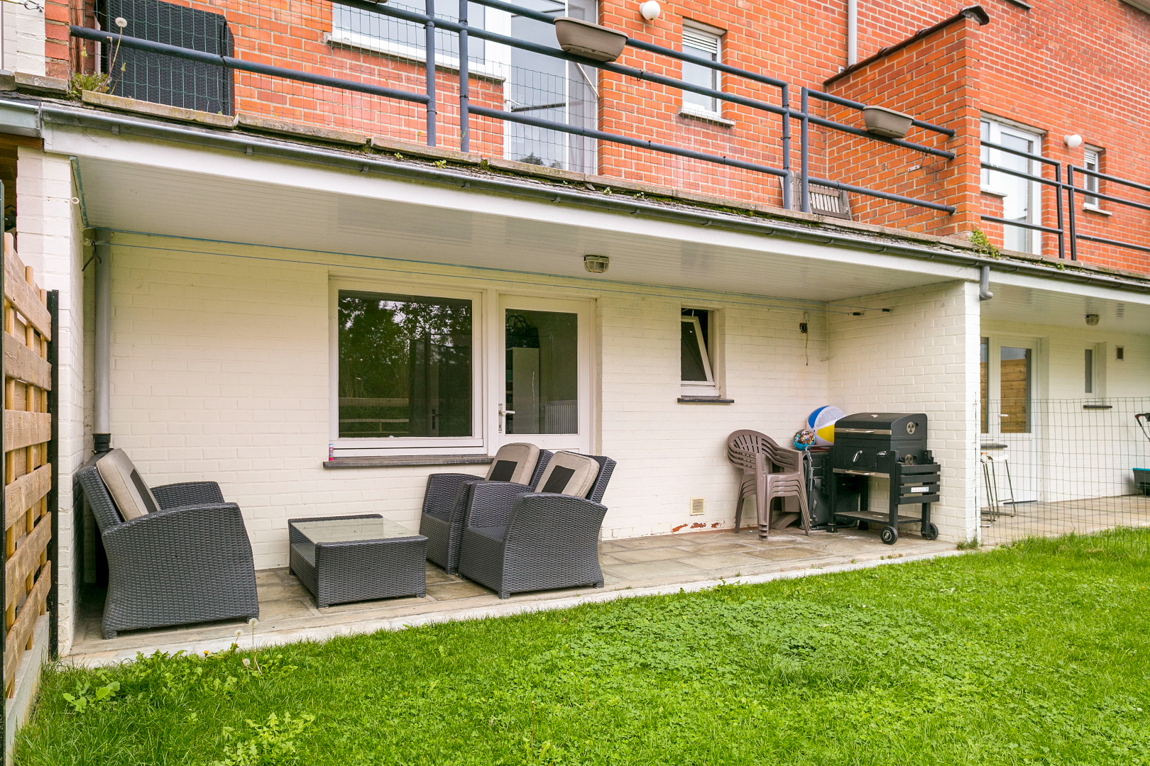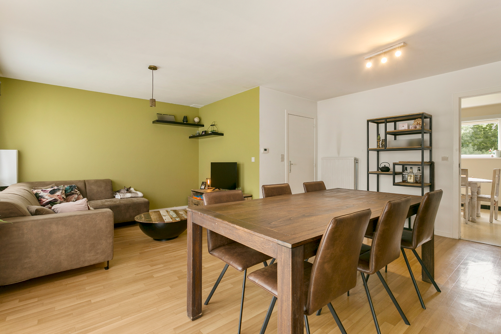 De 1e verdieping beschikt over een apart toilet, zeer gezellige living in L vorm met grote ramen en een keuken met eethoek. Aangrenzend is er het leuke zuid gericht terras. Van hieruit hebben we een mooi groen open zicht.