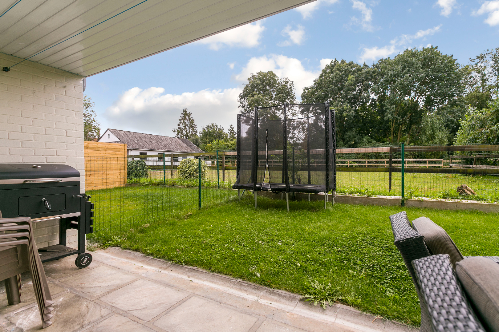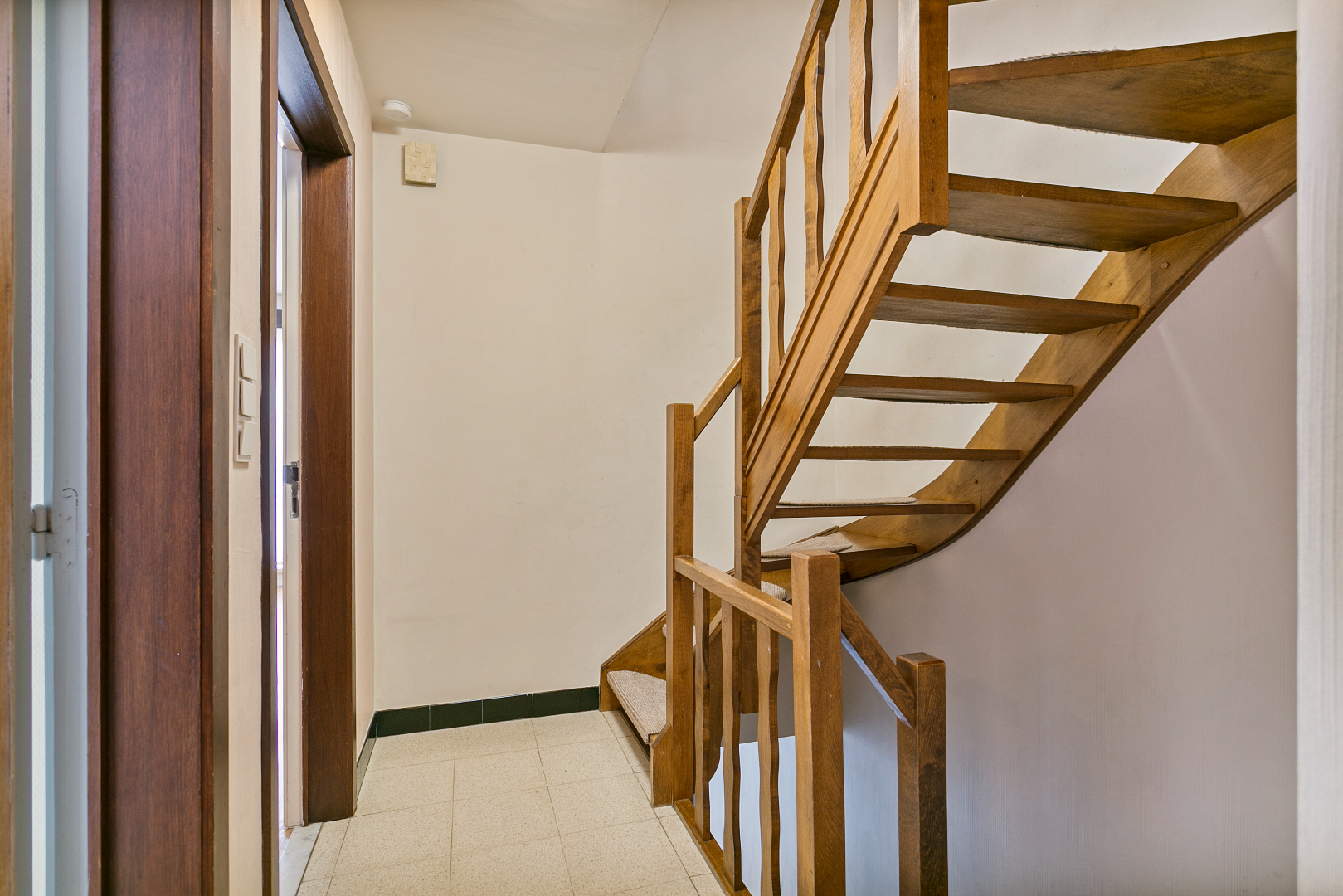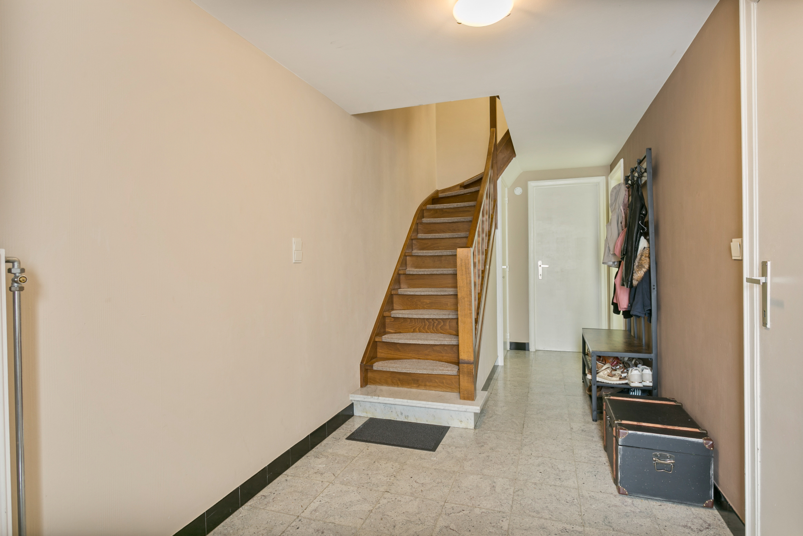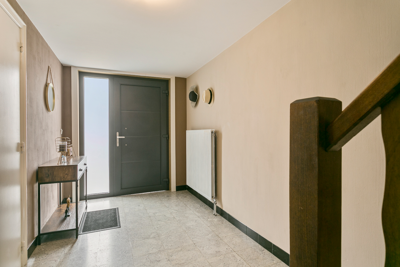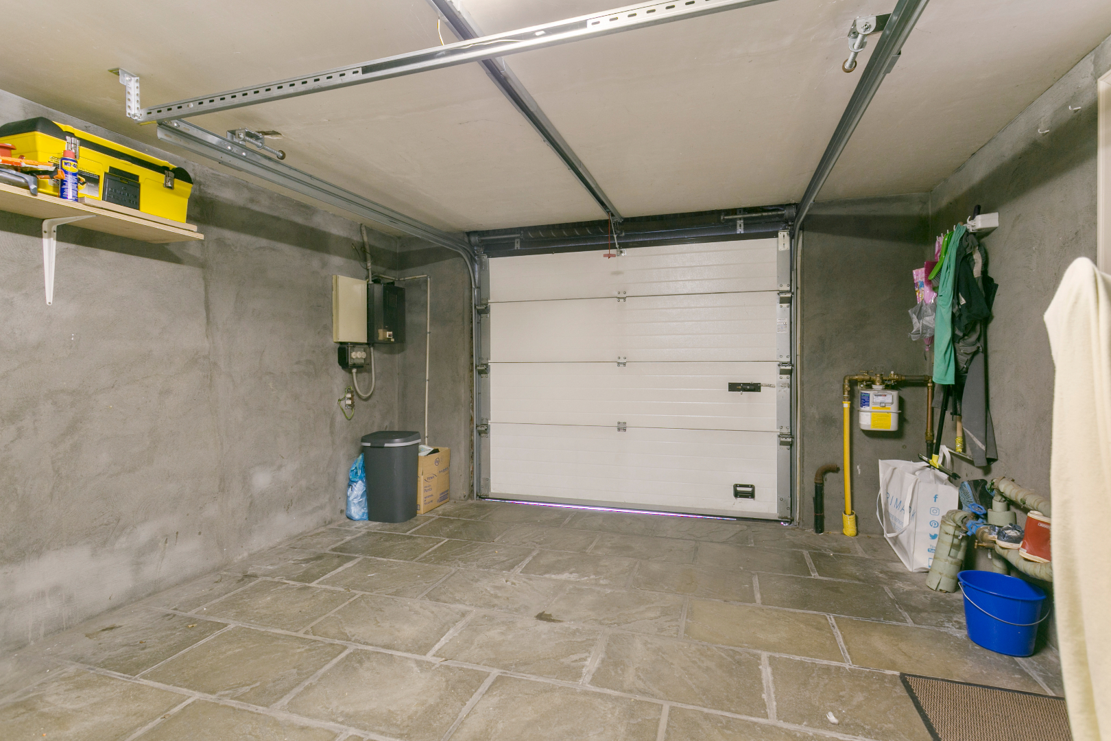 We betreden de woning via de ruime inkomhal. Rechts vinden we de garage met een elektrische sectionale poort. Achteraan is er een CV berging met aansluiting voor wasmachine en nog een grote aparte ruimte die kan dienst doen als bureel, hobbyruimte,... Langs hier is ook de gezellige tuin bereikbaar.