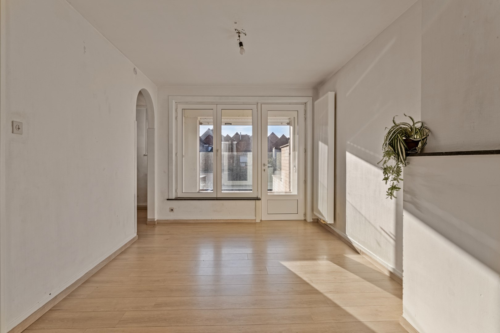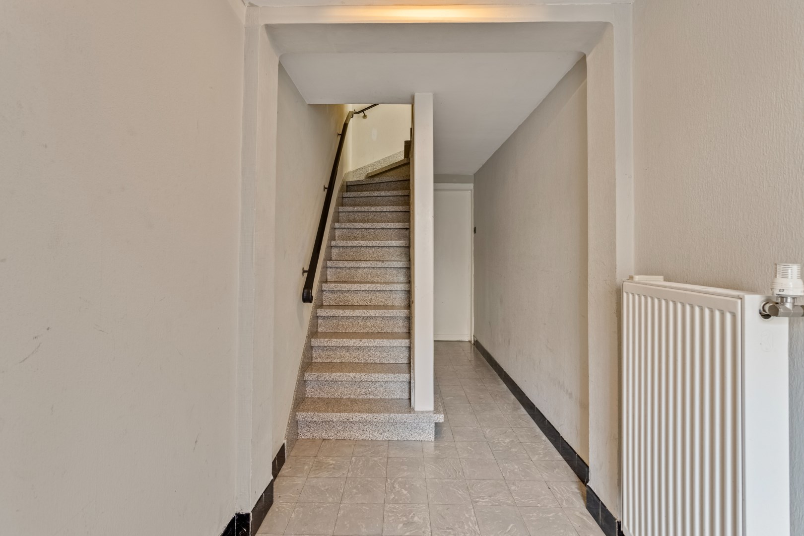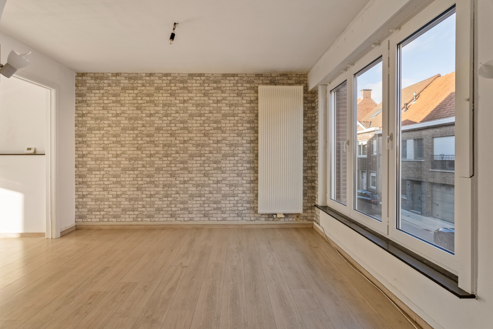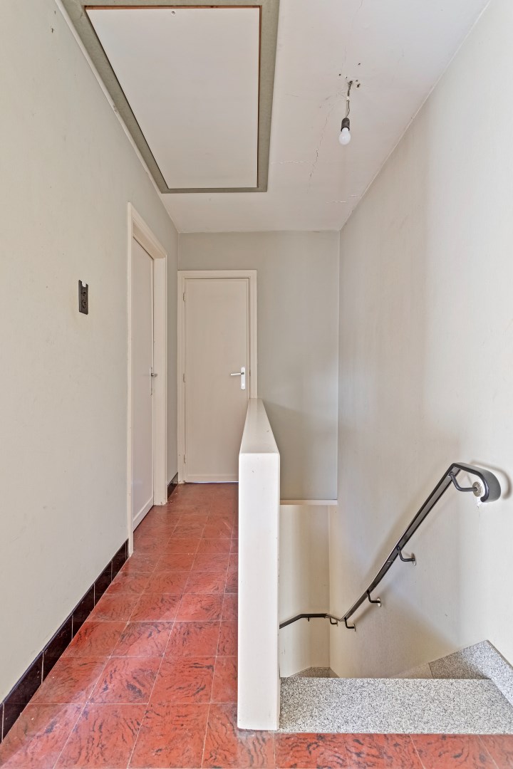 Op het eerste treffen we een ruime, heel lichtrijke living. De voorgevel bestaat quasi volledig uit vensters. Dit zorgt ervoor dat u vanuit de hoogte het leven beneden in alle rust kan gadeslaan. Ook langs de achterkant van de leefruimte is er een groot raam. Van hieruit kunnen we ook op terras en hebben we zicht op de tuin. De keuken is langs de achterzijde gelegen. Op deze verdieping is er ook nog een toilet.