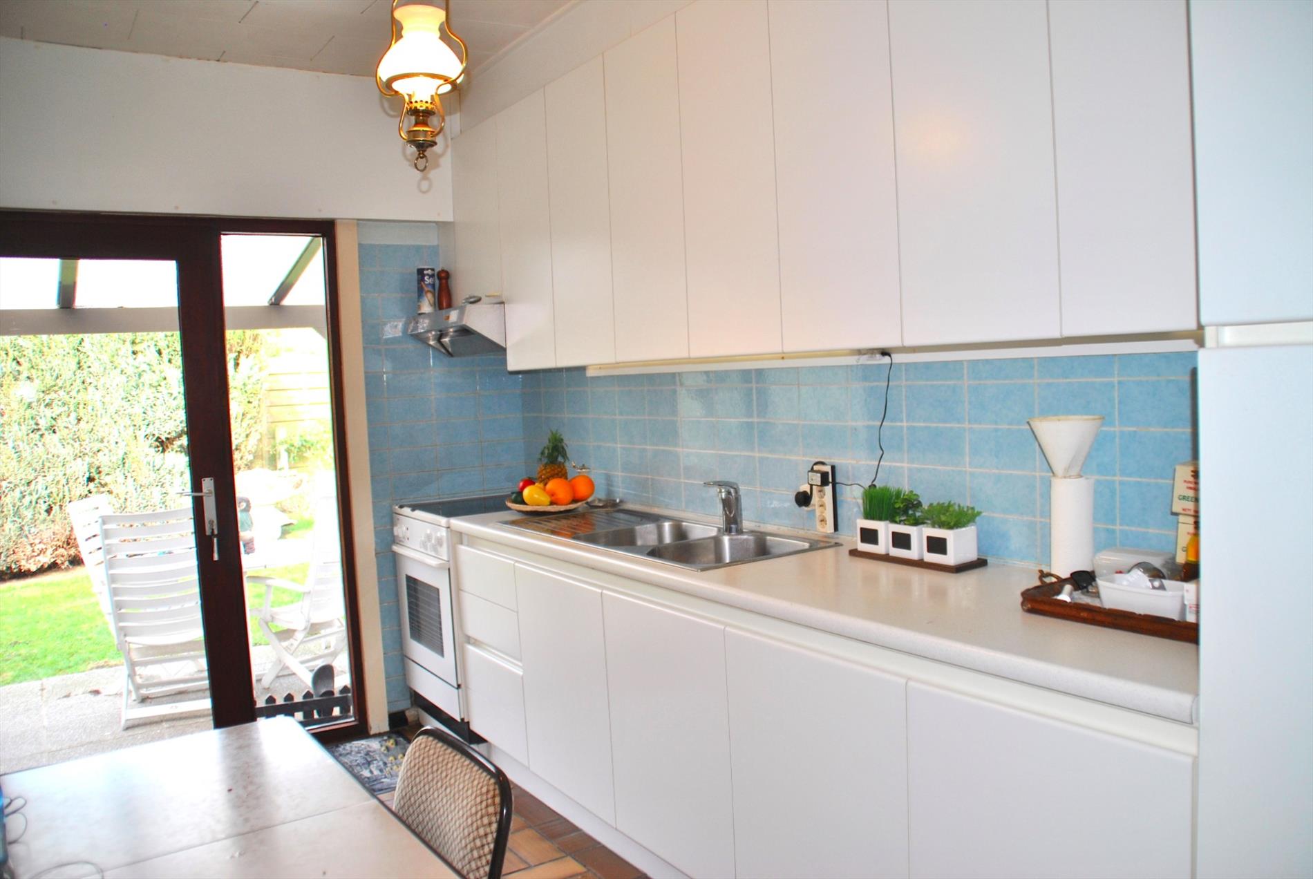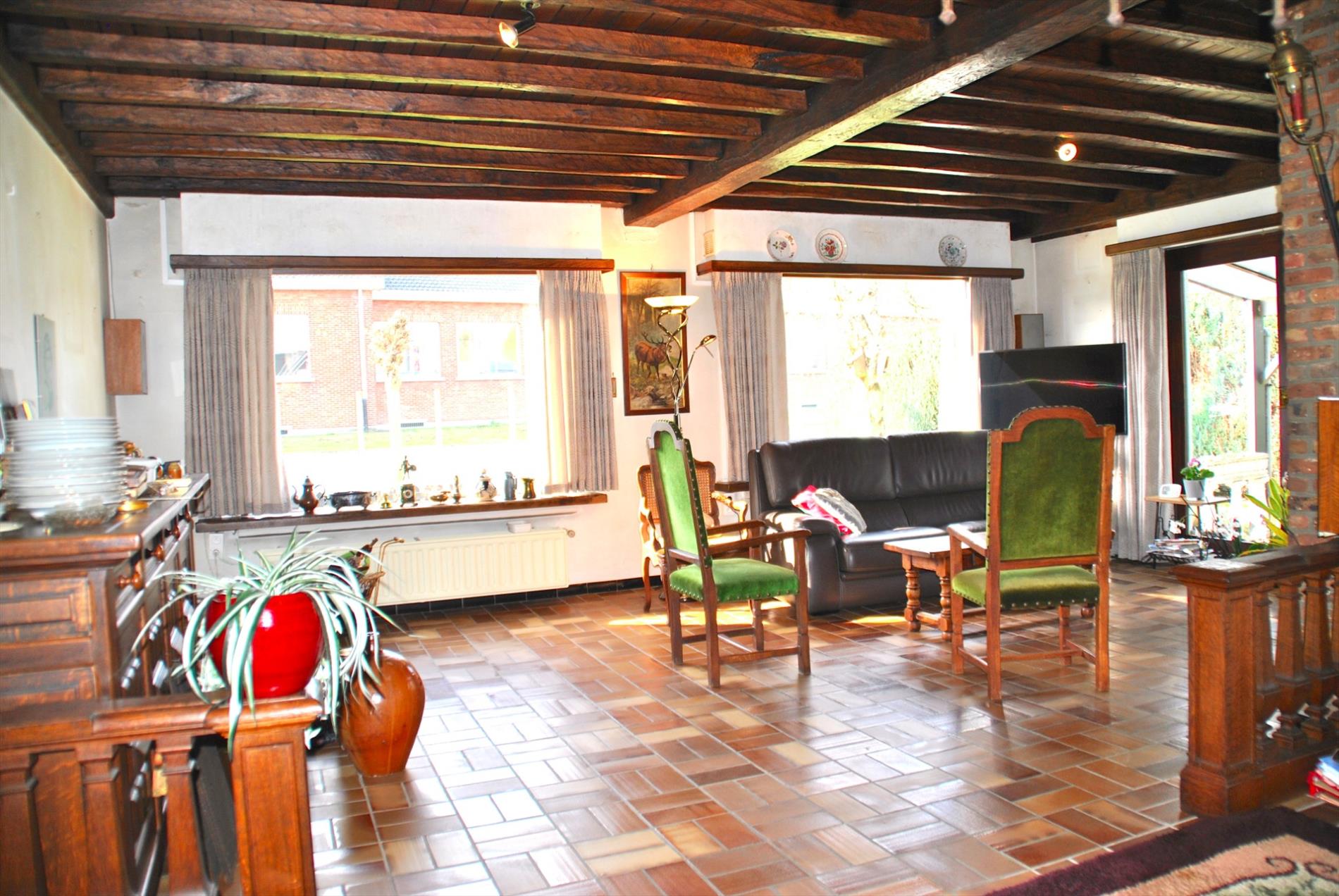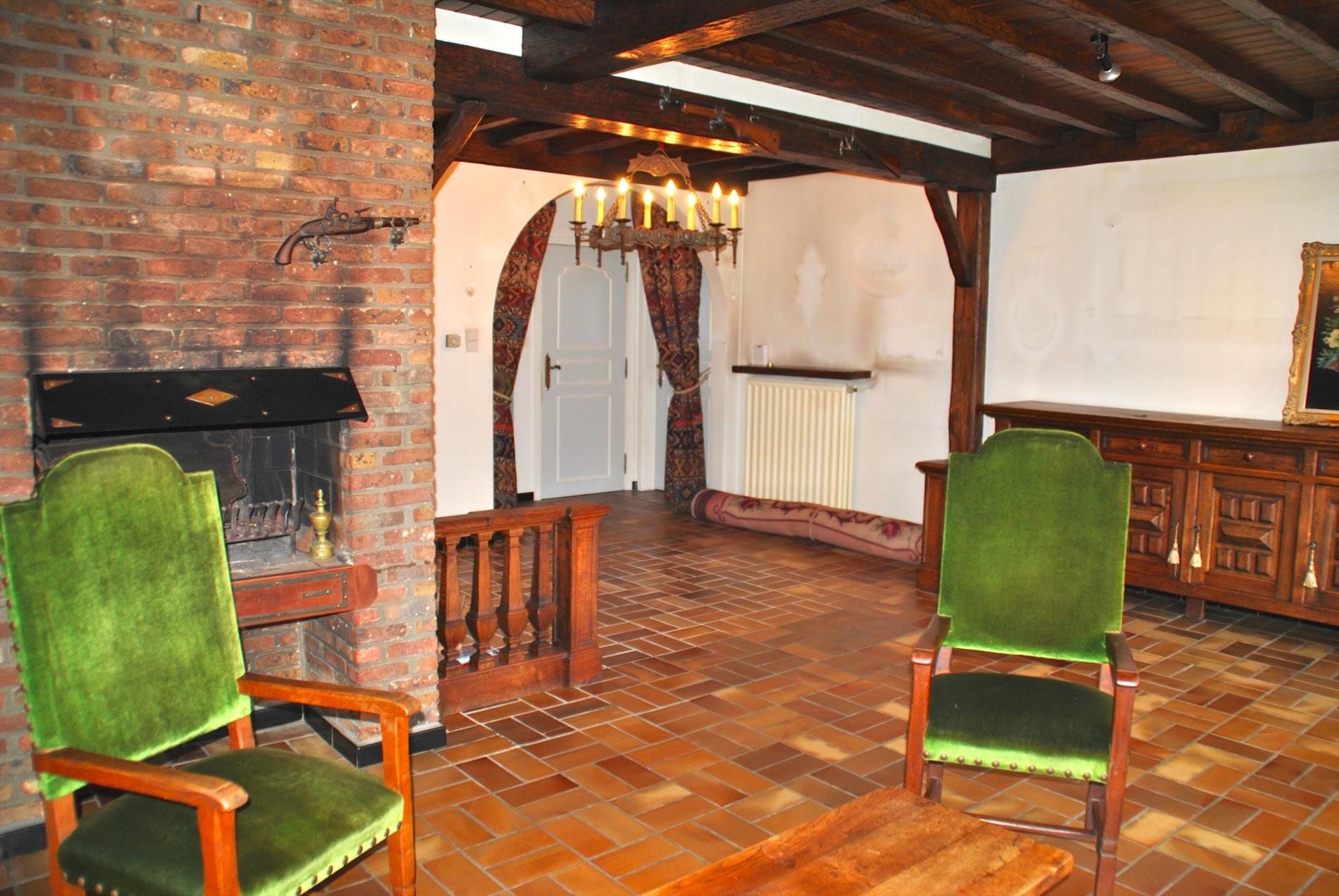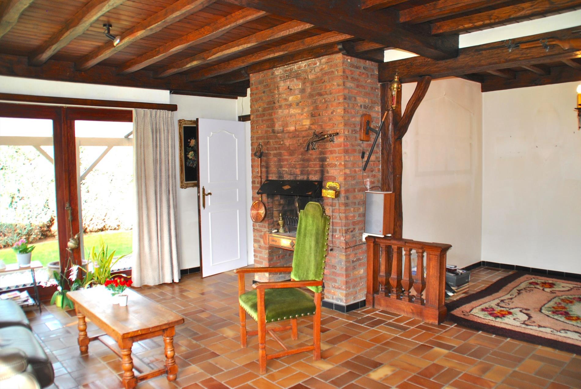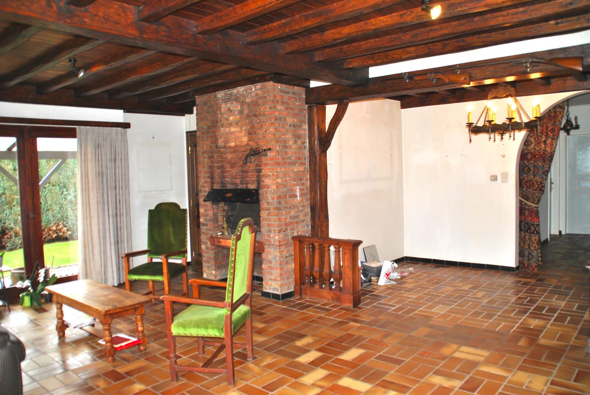 Bij het binnenkomen hebben we ofwel toegang tot de keuken of tot de leefruimte. In het zuidwest georiënteerd leefgedeelte is er volop zon en zorgen de open haard en de mooie boog voor extra sfeerelementen. Heel aangenaam is dat er ook het zicht op de tuin. Vanuit deze ruimte komen we via de hal naar de keuken. Ook van hieruit kunnen we uitkijken over de tuin of het ontbijt nuttigen op het terras.