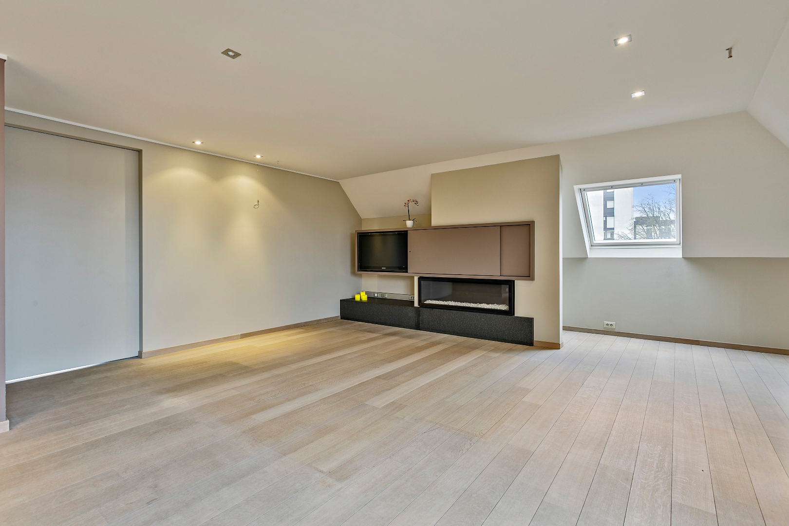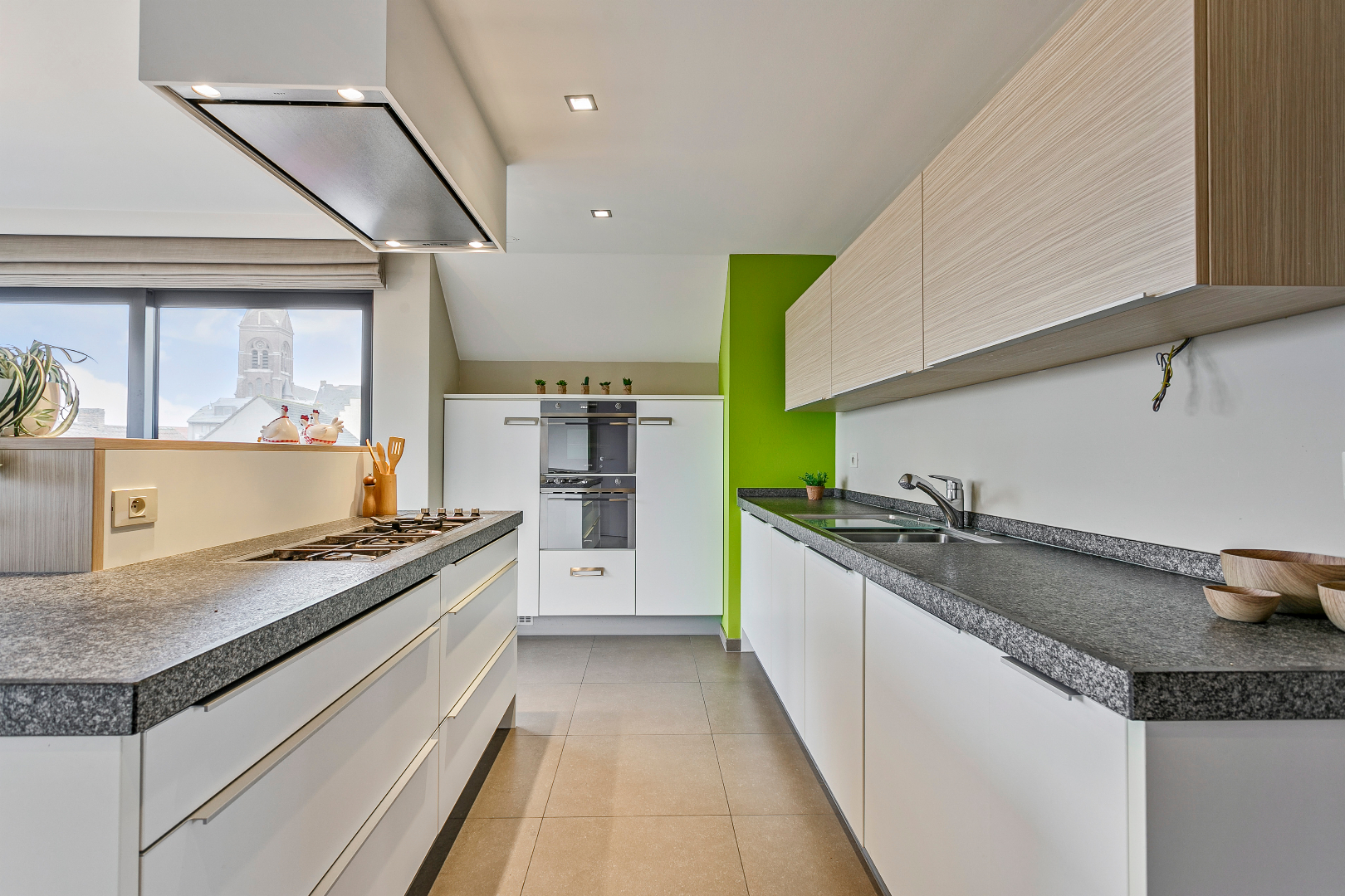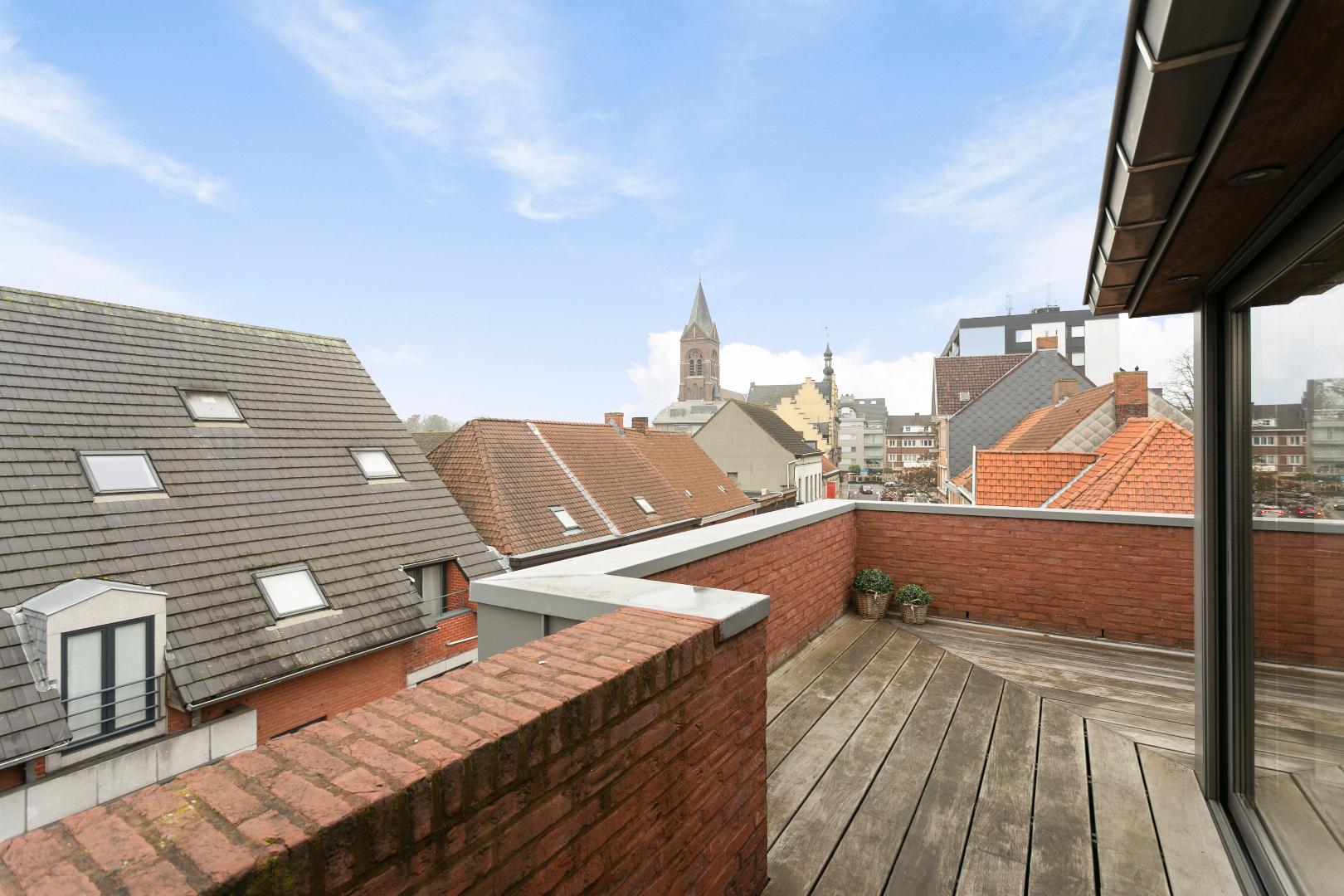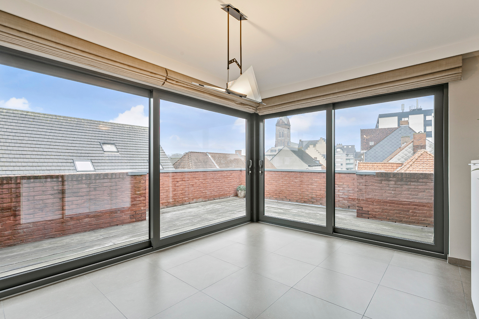 Via de lift komen we rechtstreeks in het appartement op de 3e verdieping. De inkomhal beschikt over een apart gastentoilet en een handige ingemaakte vestiaire. Via de glazen deur betreden we de ruime leefruimte met terras. Door het mooie parket en de gashaard is het een zeer stijlvolle ruimte. Een grote schuifdeur leidt ons naar de prachtige keuken met kookeiland en via de grote schuiframen kunnen we op het grote terras. Van hieruit hebben we een prachtig zicht op het centrum, en dit in alle privacy. Een handige berging zorgt voor extra stockageruimte en plaats voor de wasmachine.
