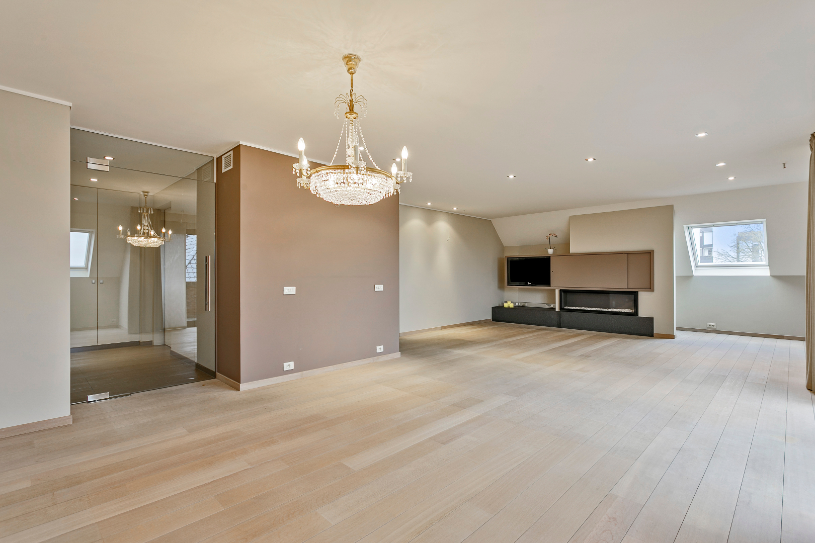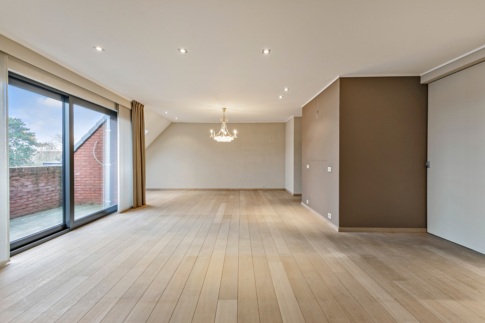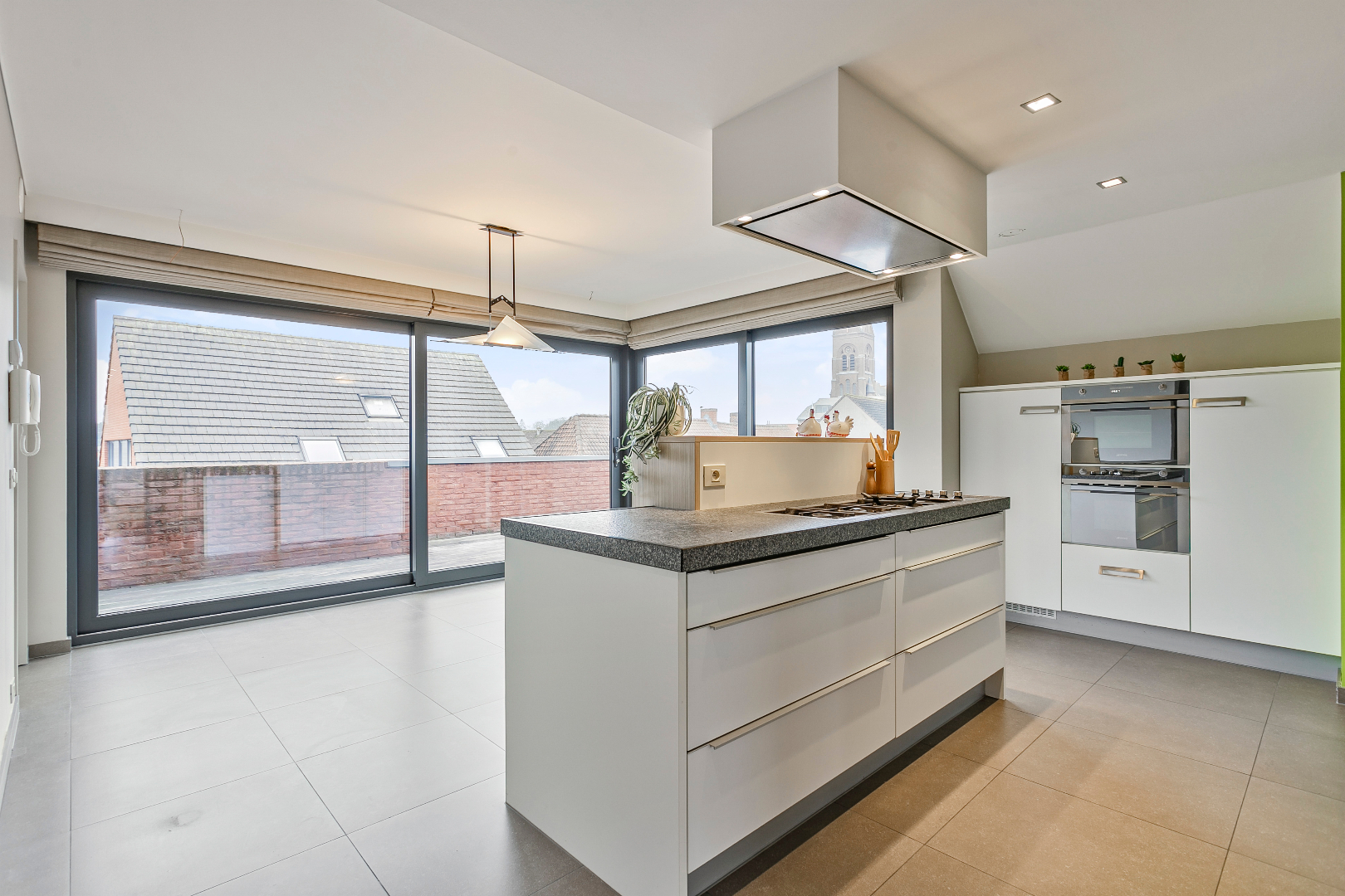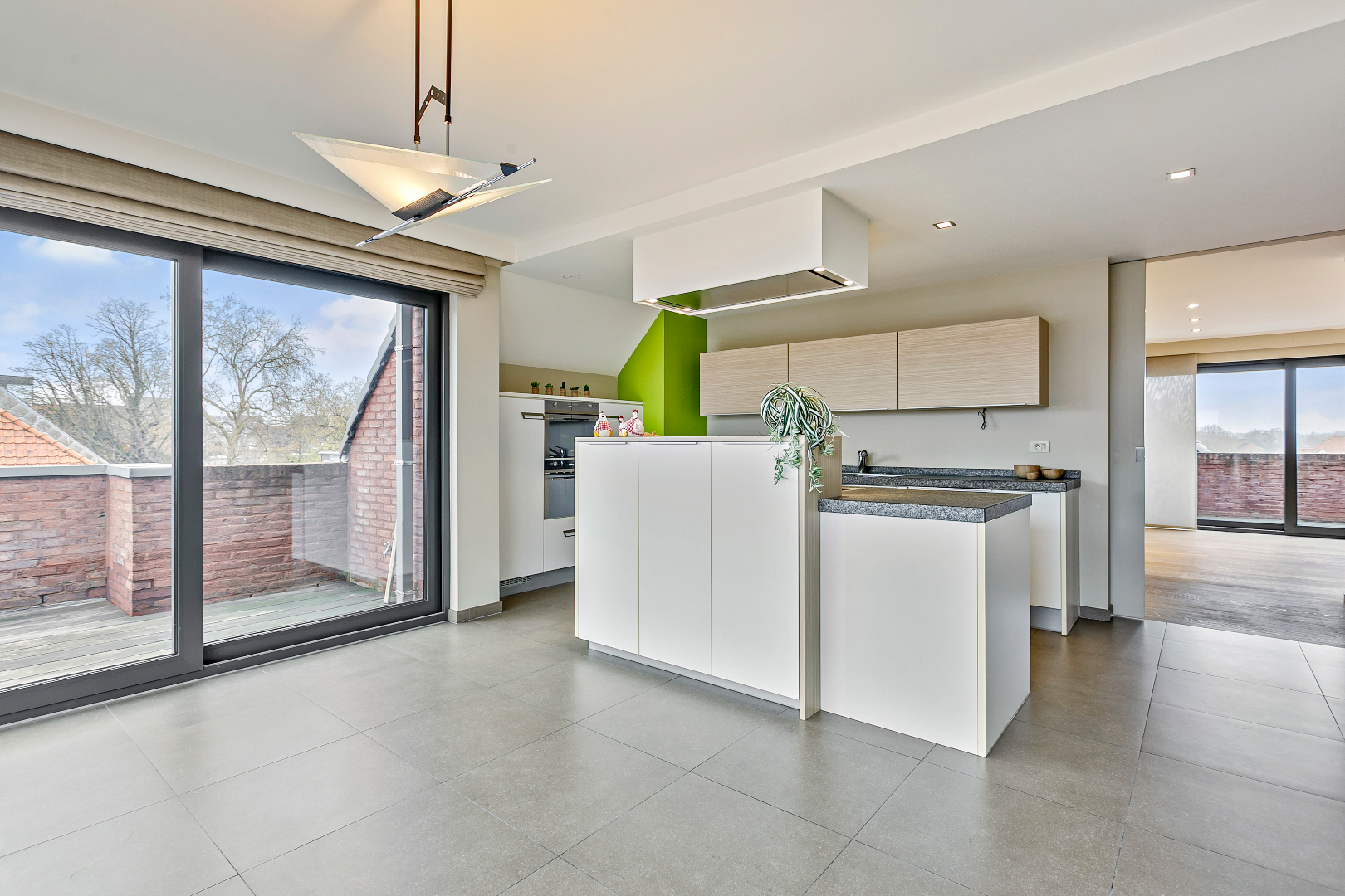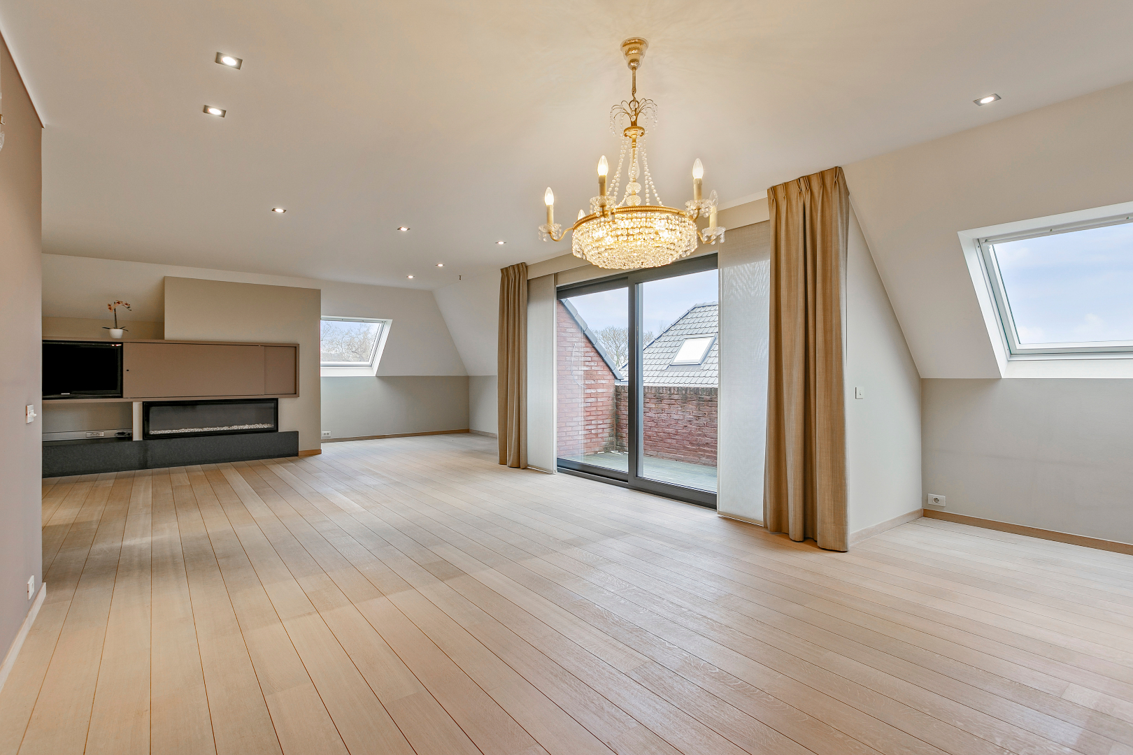 Via de lift komen we rechtstreeks in het appartement op de 3e verdieping. De inkomhal beschikt over een apart gastentoilet en een handige ingemaakte vestiaire. Via de glazen deur betreden we de ruime leefruimte met terras. Door het mooie parket en de gashaard is het een zeer stijlvolle ruimte. Een grote schuifdeur leidt ons naar de prachtige keuken met kookeiland en via de grote schuiframen kunnen we op het grote terras. Van hieruit hebben we een prachtig zicht op het centrum, en dit in alle privacy. Een handige berging zorgt voor extra stockageruimte en plaats voor de wasmachine.