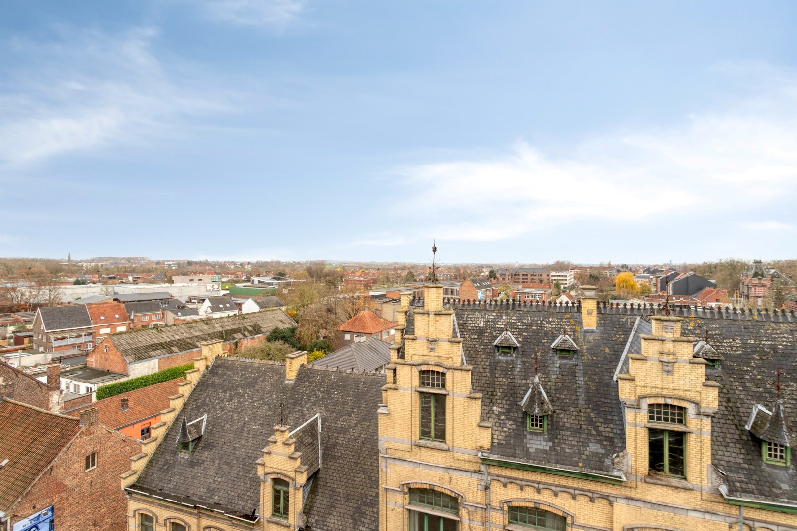 Het appartement beschikt over een hal met vestiairekast en apart gastentoilet. We komen de living binnen die over een groot raam beschikt met zicht op het centrum van Wevelgem. Aangrenzend is er de aparte vernieuwde keuken.