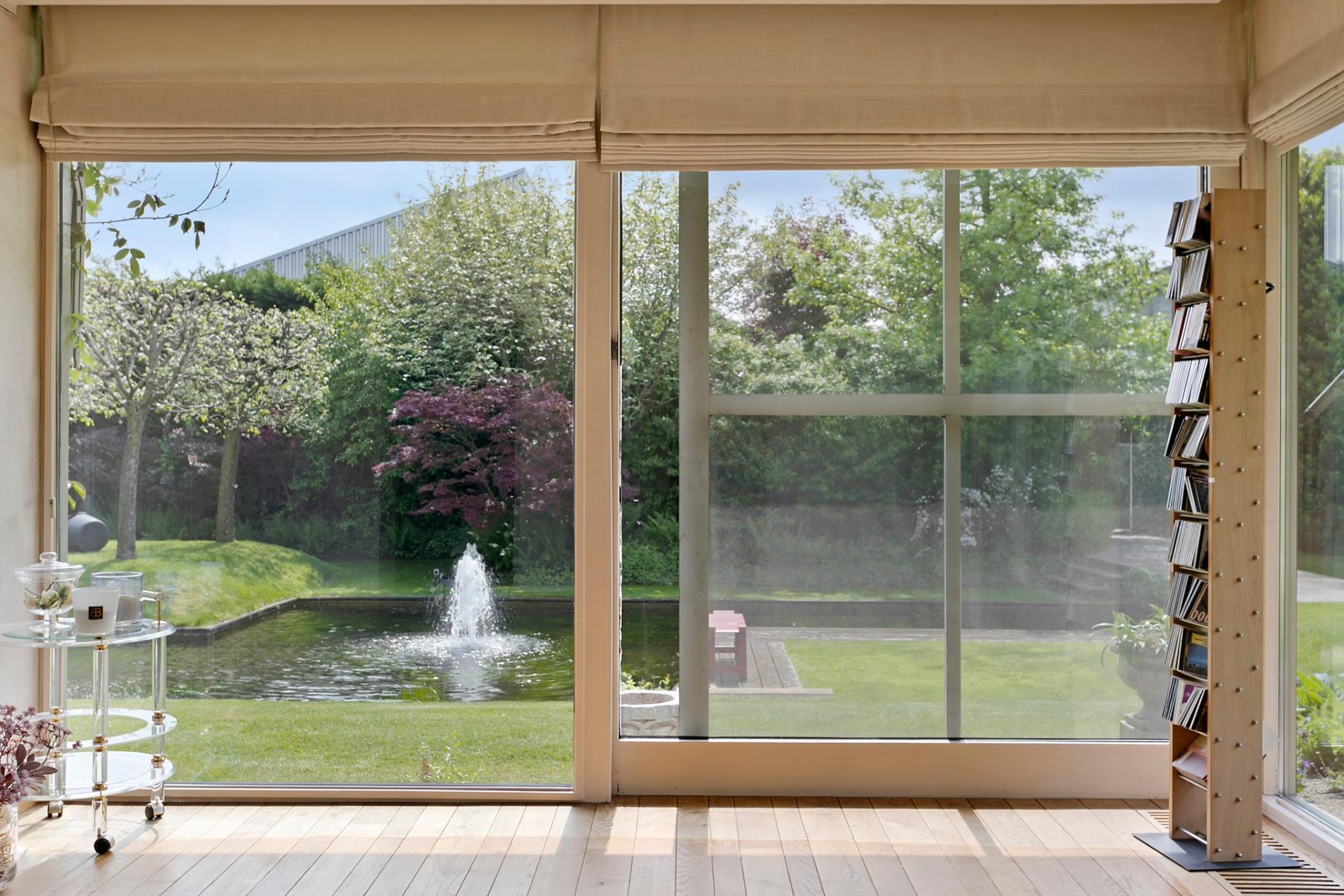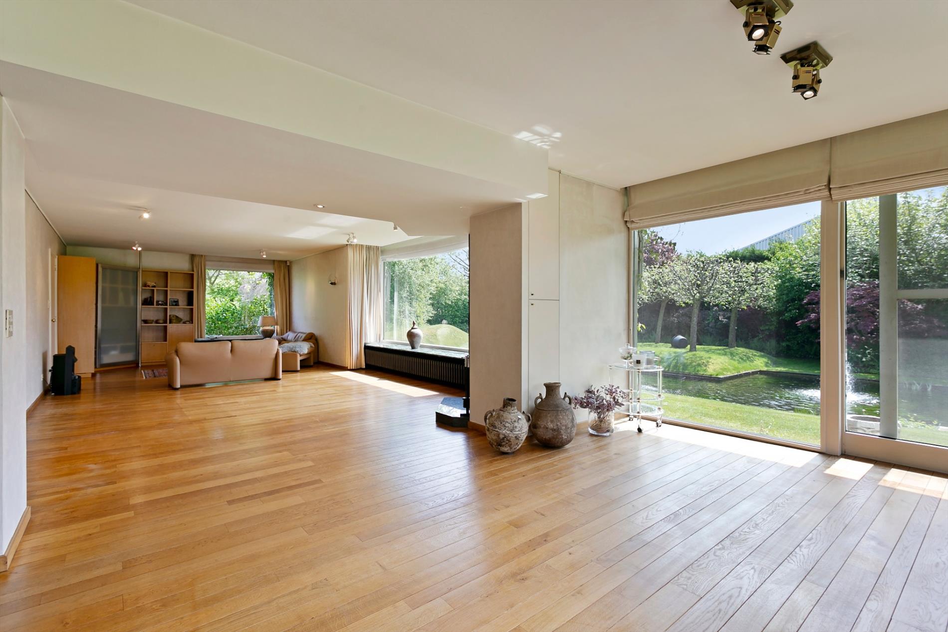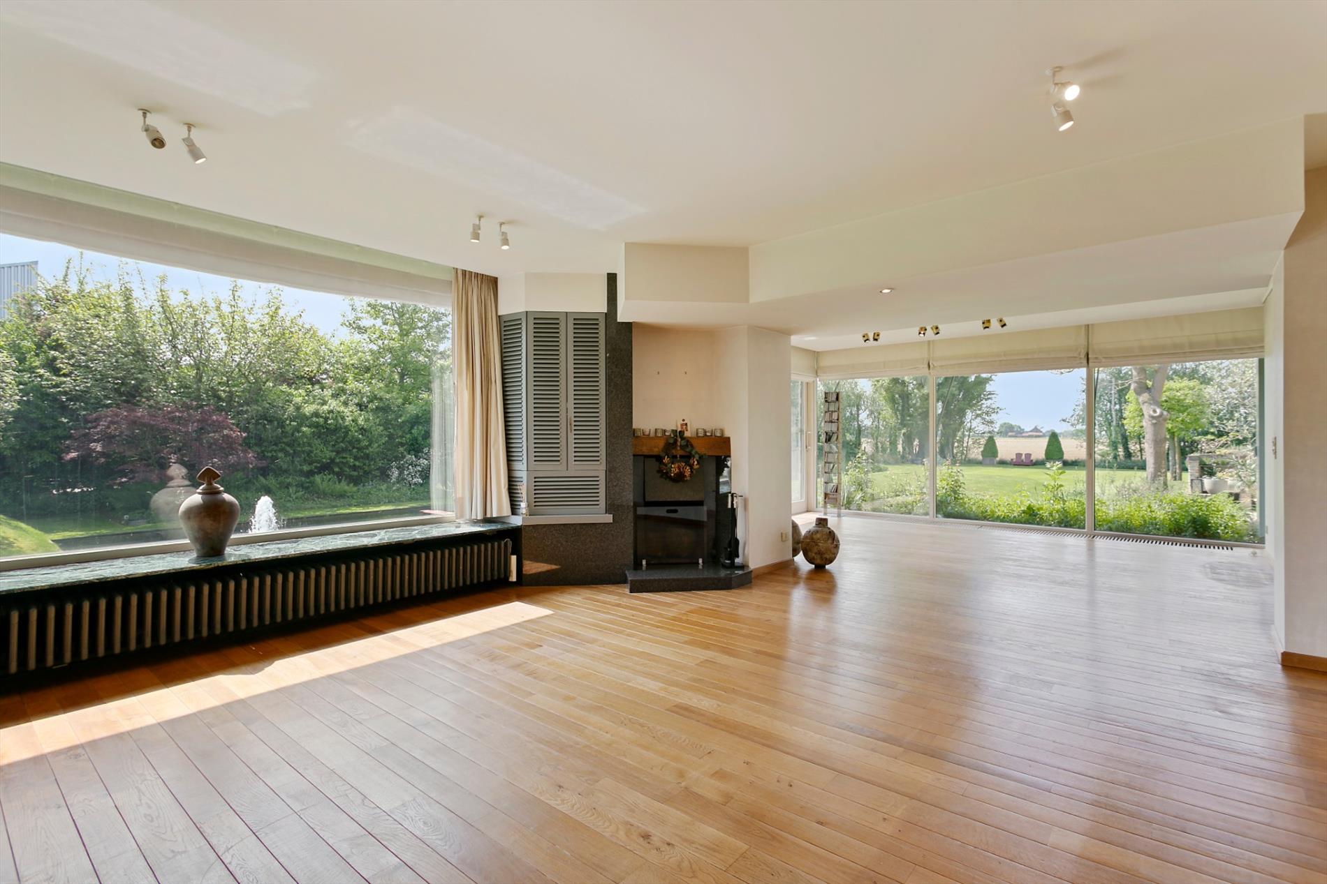 De living en het salon baden in het licht. Het parket en de haard zorgen voor een extra aangename toets. Maar wat ons écht met de ogen doet knipperen is het zicht op de fenomenale tuin. Met open mond aanschouwen we de visvijver met fontein, de zwemvijver met badhuis en het grote grasperk met zicht op de velden achteraan. Dit is werkelijk het paradepaardje!