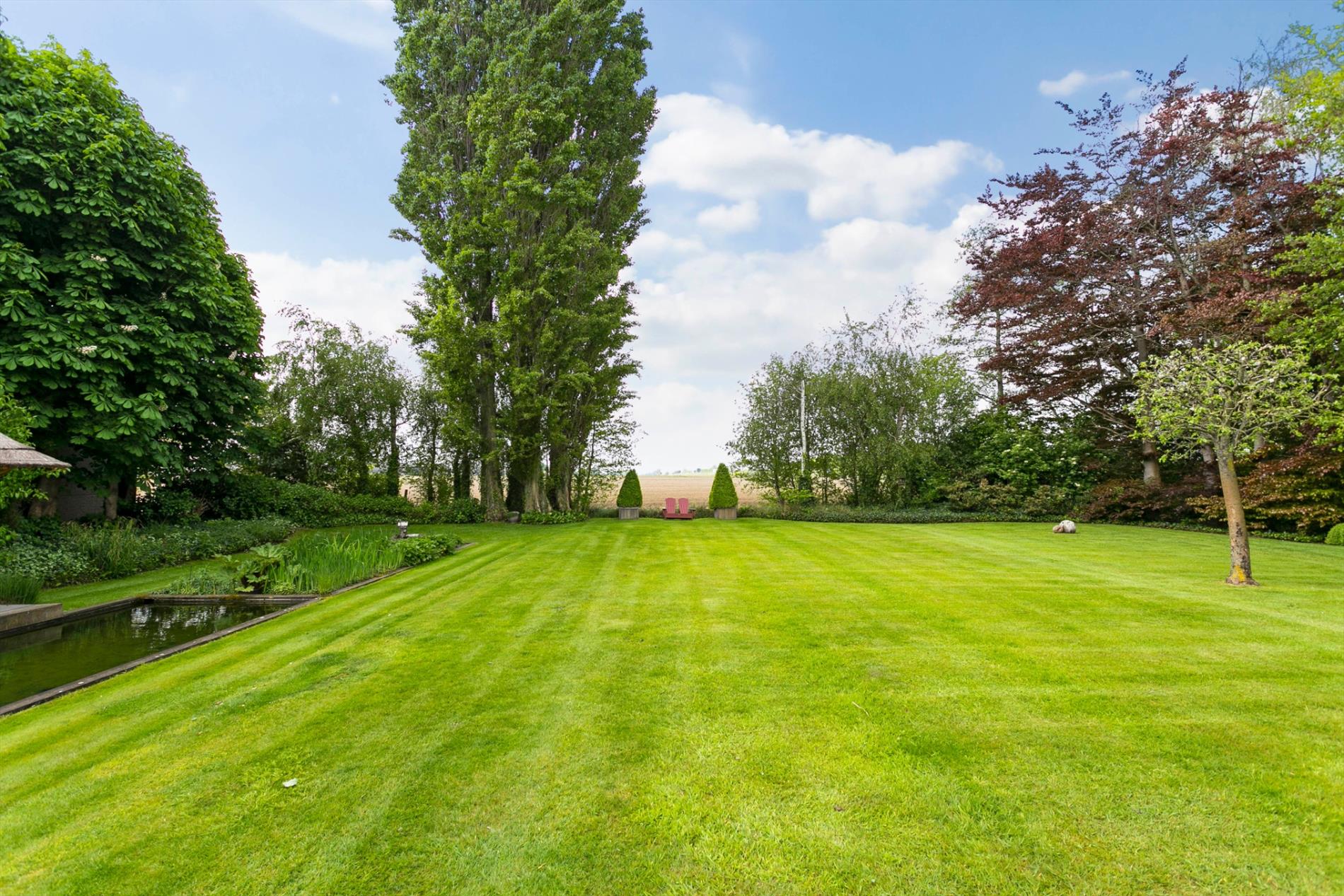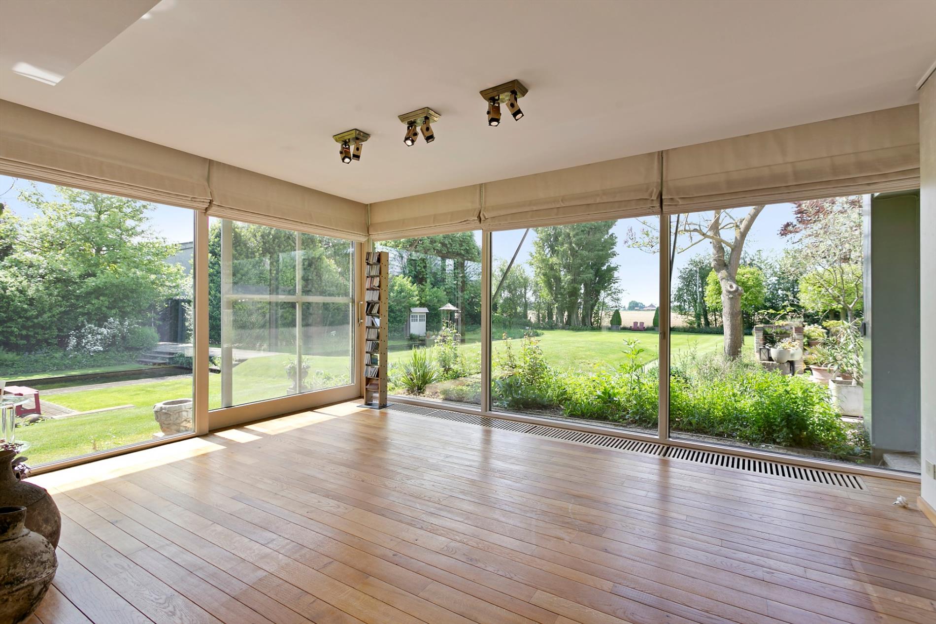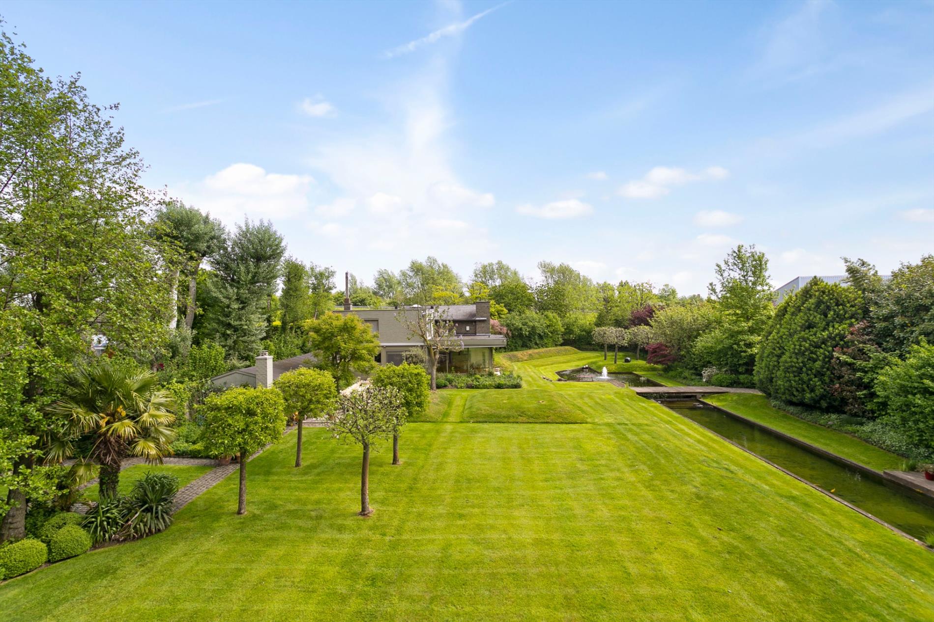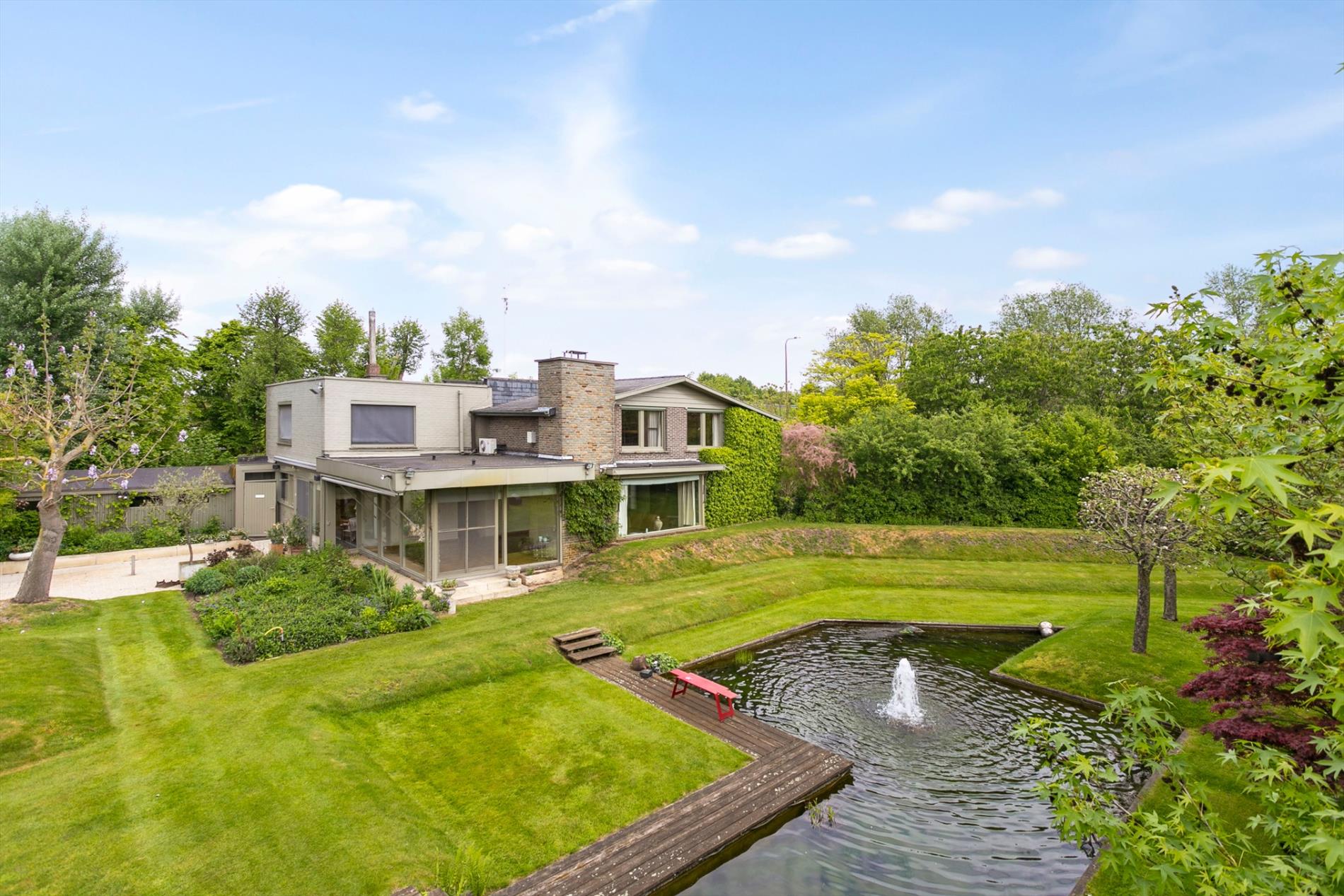 De living en het salon baden in het licht. Het parket en de haard zorgen voor een extra aangename toets. Maar wat ons écht met de ogen doet knipperen is het zicht op de fenomenale tuin. Met open mond aanschouwen we de visvijver met fontein, de zwemvijver met badhuis en het grote grasperk met zicht op de velden achteraan. Dit is werkelijk het paradepaardje!