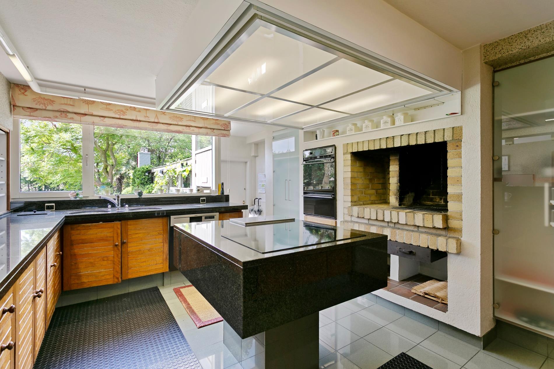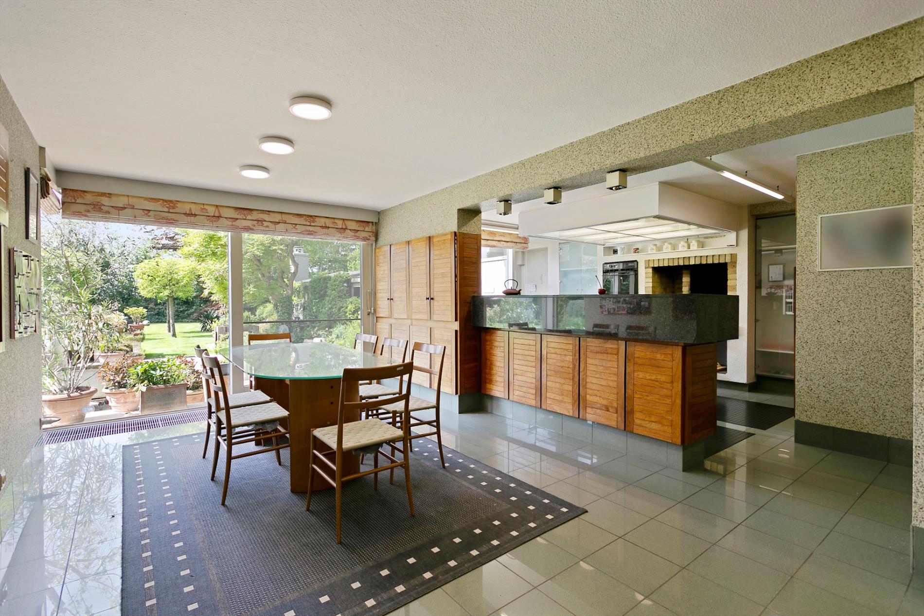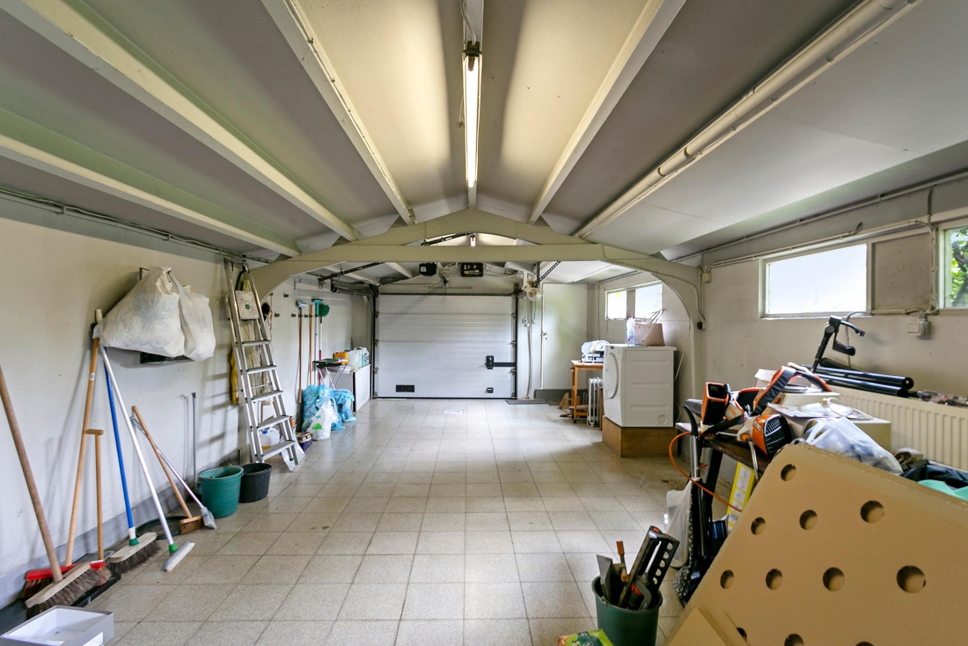 Vanuit de leefruimte stappen we de keuken binnen. Deze is eveneens ruim en opgedeeld in een eet- en kookgedeelte. Ernaast is er een handige berging. Achter de keuken bevindt zich de grote garage met elektrische poort.