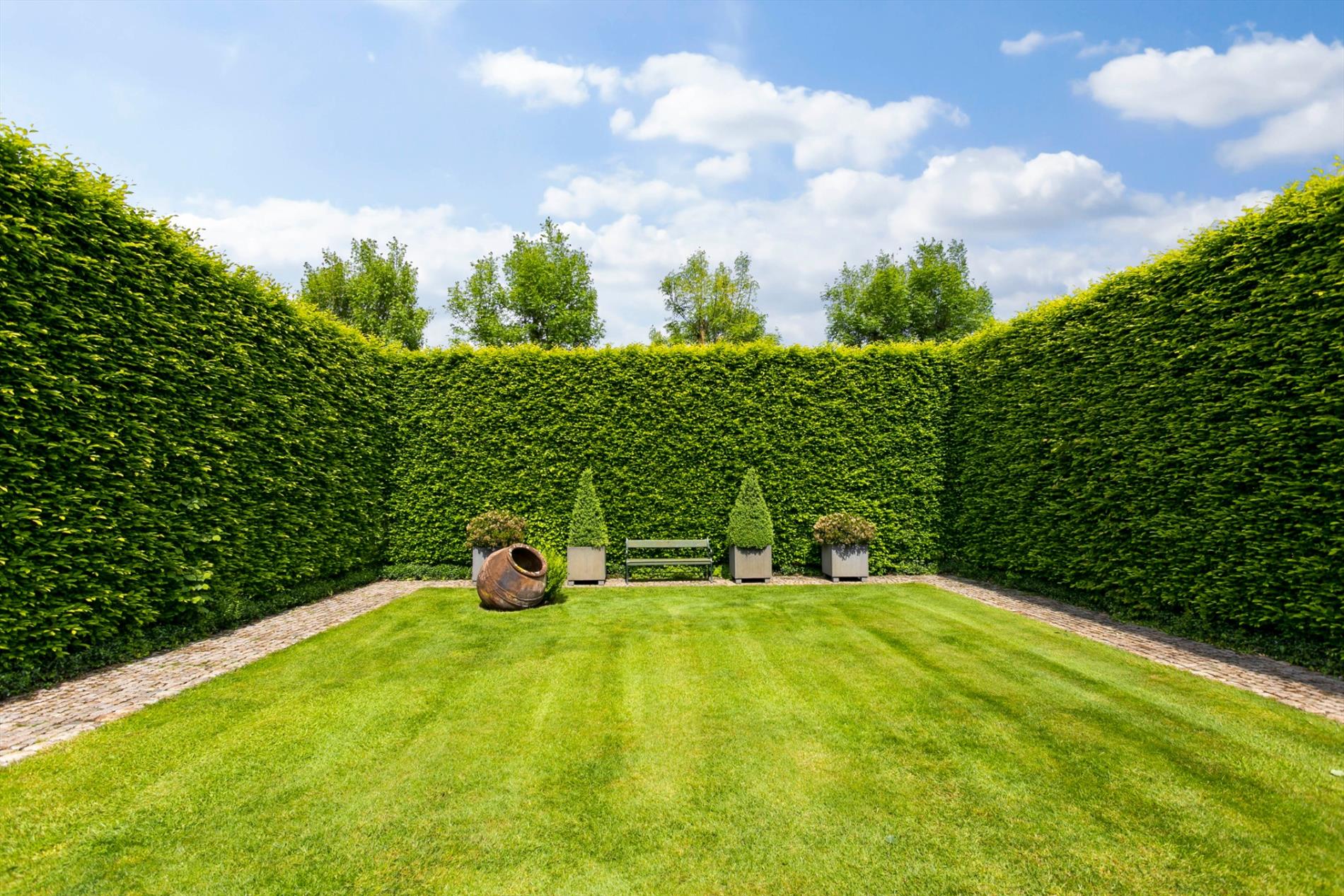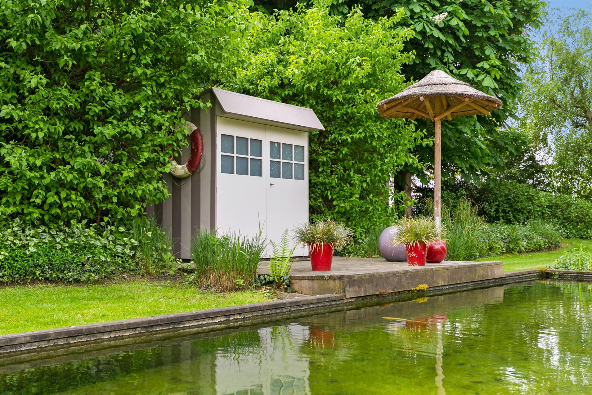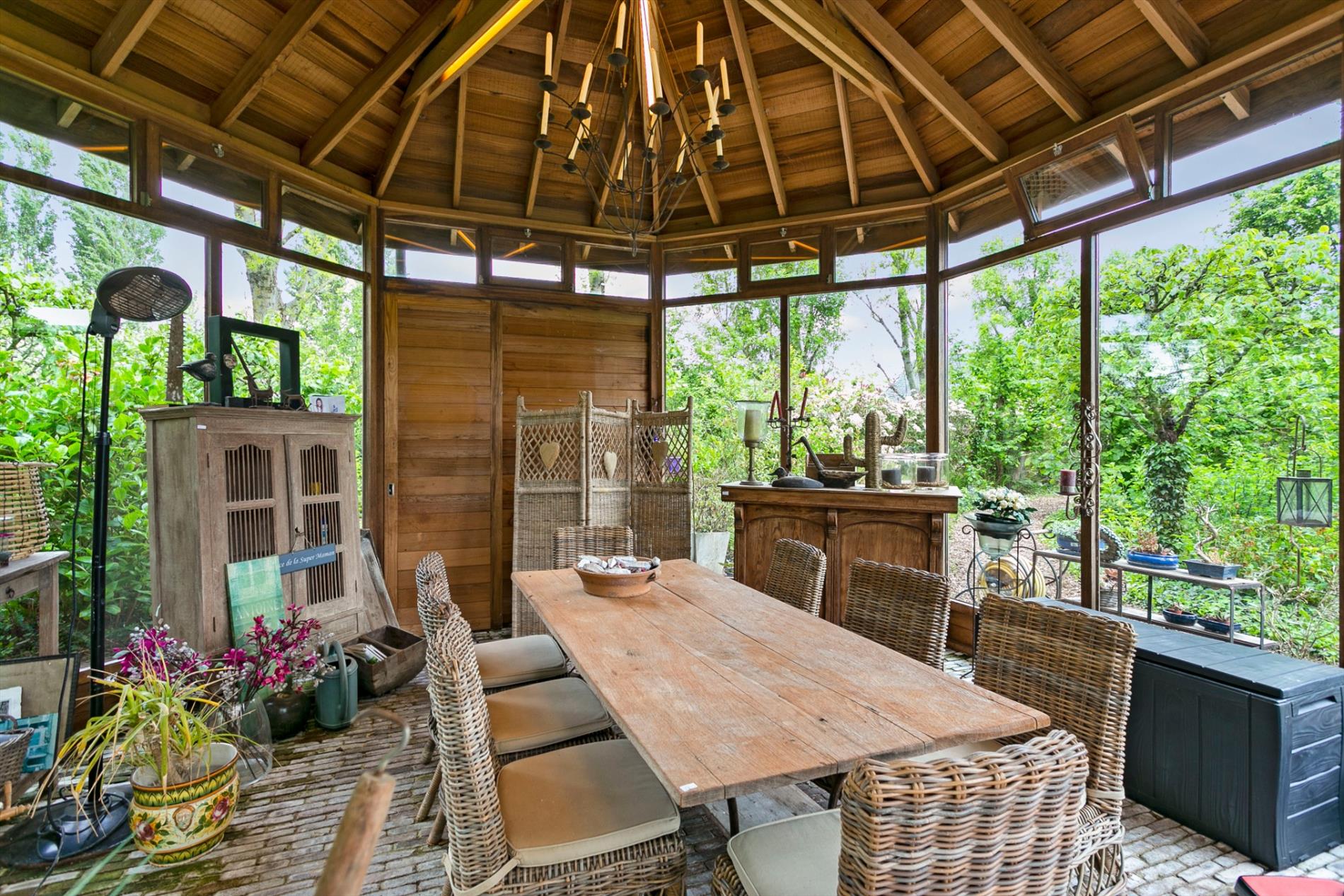 De tuin is hemels! U waant zich in een tuinmagazine met een verzameling van mooie begroeiing, een vijver, een zwemvijver, glooiingen en prachtige bloemen! Als kers op de taart treffen we achter de woning nog een mooie orangerie aan. Tijdens zwoele zomeravonden kan u hier in alle rust genieten van de pracht. Er is eveneens een kleine kicthenette aanwezig.