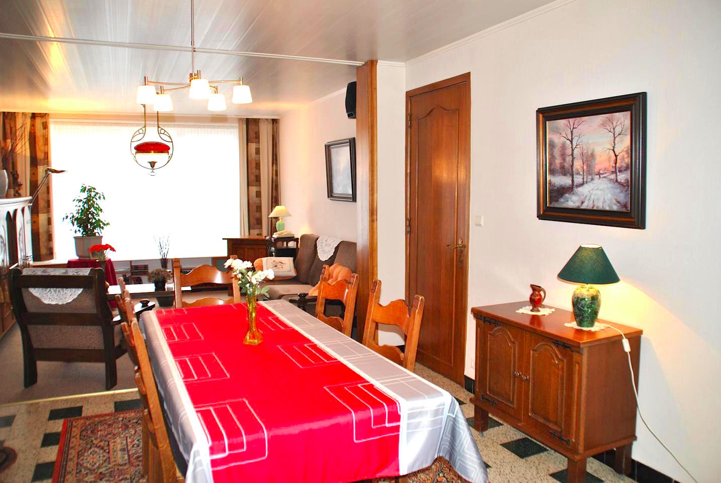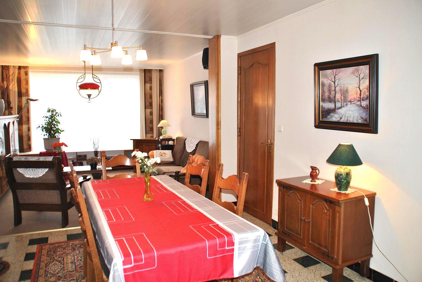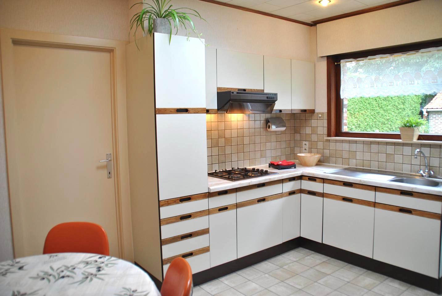 De leefruimte is ruim en gezellig ingericht. Er is heel veel lichtinval door zowel het grote raam langs de voor- en de achterkant. Vanuit de living hebben we ook een heel mooi zicht op de tot in de puntjes onderhouden tuin. Ook in de keuken kunnen we de tuin bewonderen. Er is hier eveneens ruim plaats voor een eettafel. Naast de keuken is een badkamer met bad, lavabo en toilet. Aansluitend is een berging met voorziening voor was- en droogautomaat.