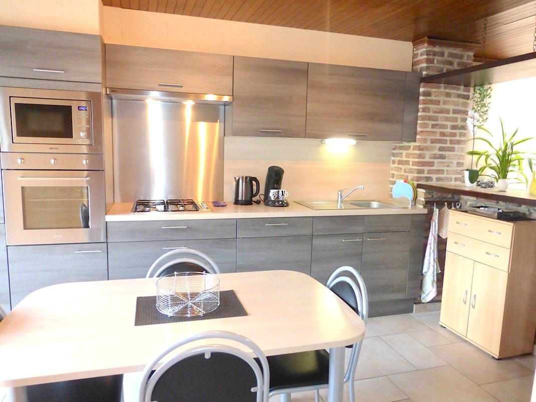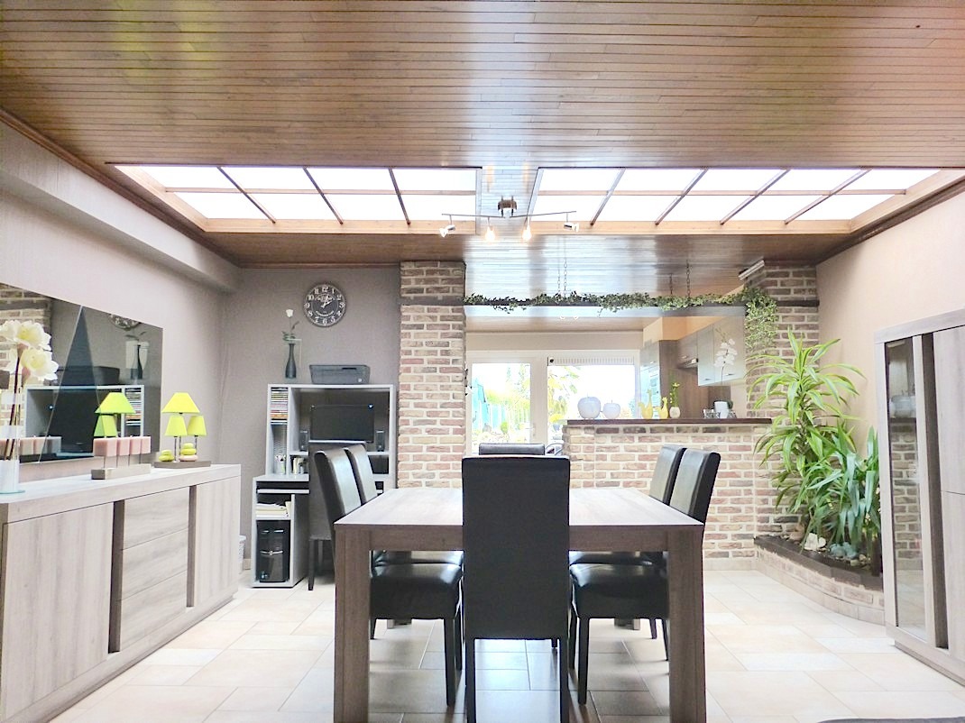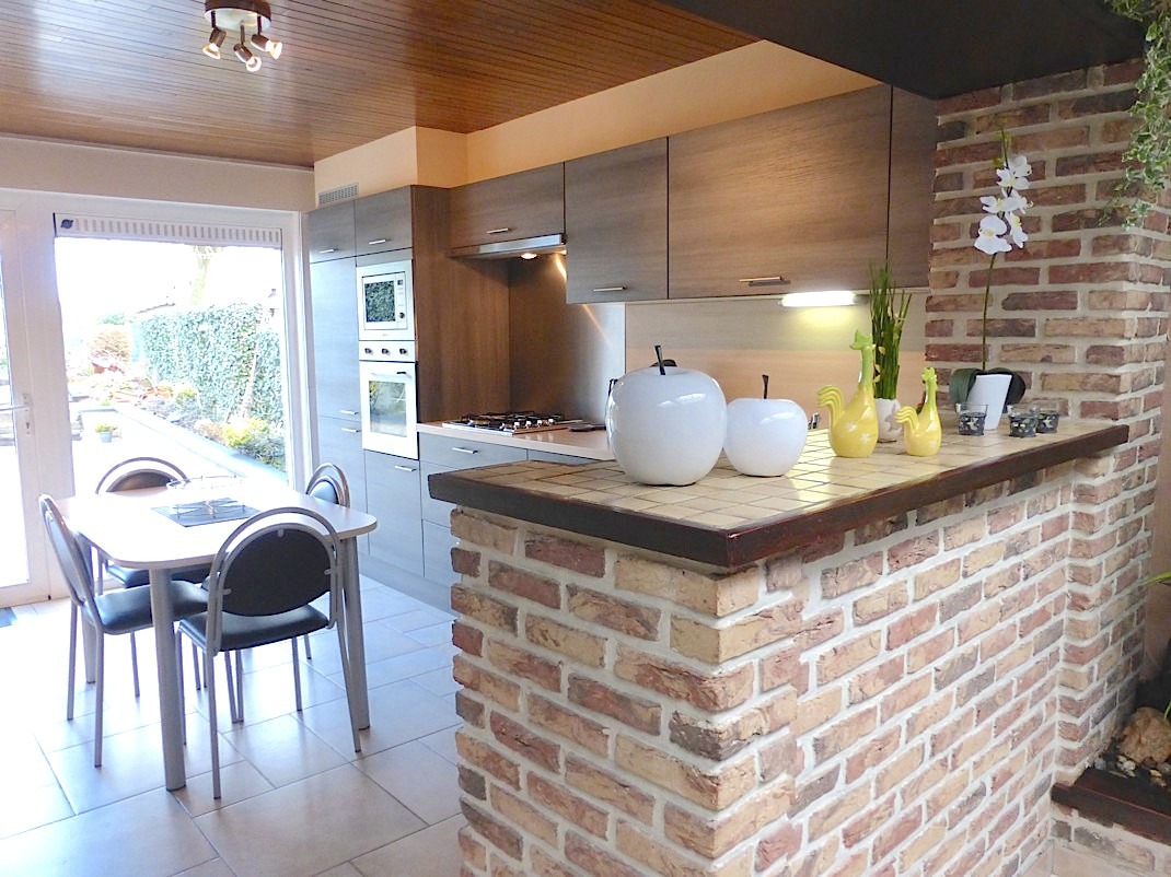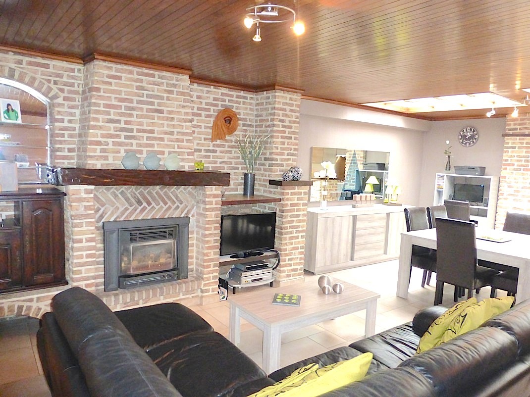 We komen binnen en lopen meteen door naar de achteraan gelegen living. Deze is mooi ingericht en geniet door de grote koepels van veel lichtinval. Door de open keuken is het er extra gezellig, en heeft men een direct contact met de tuin. De keuken werd in 2013 volledig vernieuwd en is voorzien van alle toestellen.