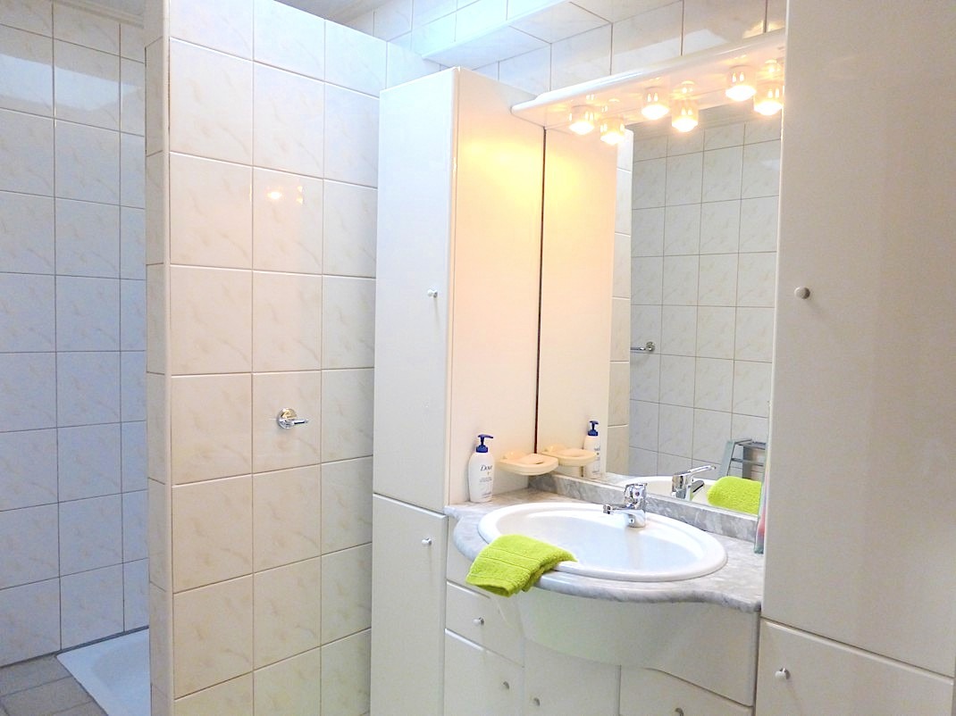Op het gelijkvloers is er tevens een badkamer met lavabo en inloopdouche. Het toilet is apart. Vooraan de woning vinden we de inpandige garage, welke recent gerenoveerd is (poort, vloeren, muren, aansluiting wasmachine,...).