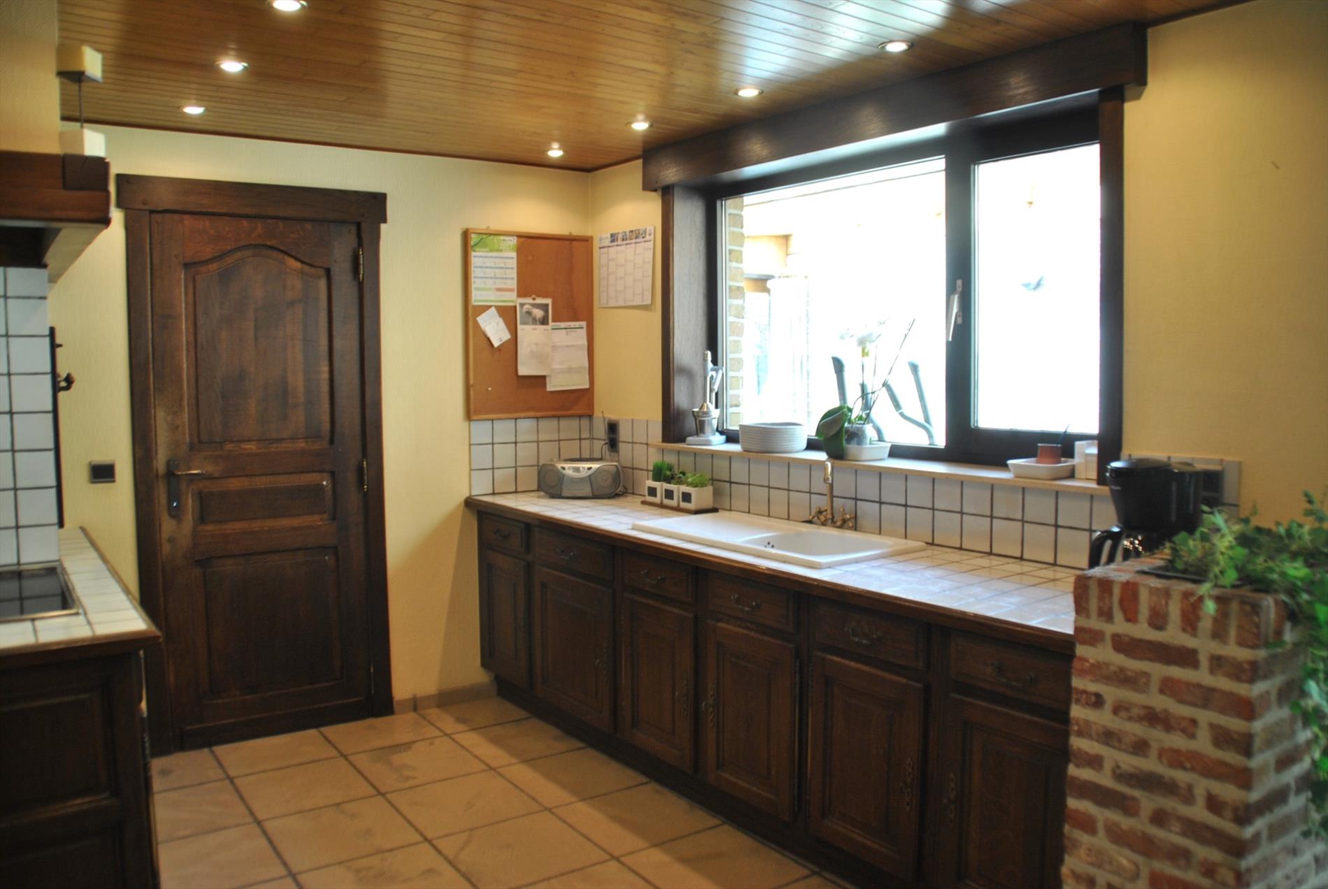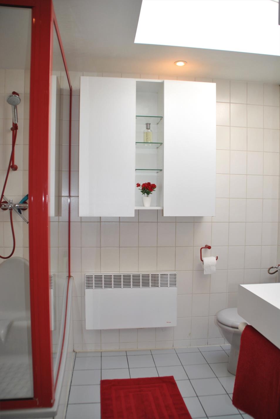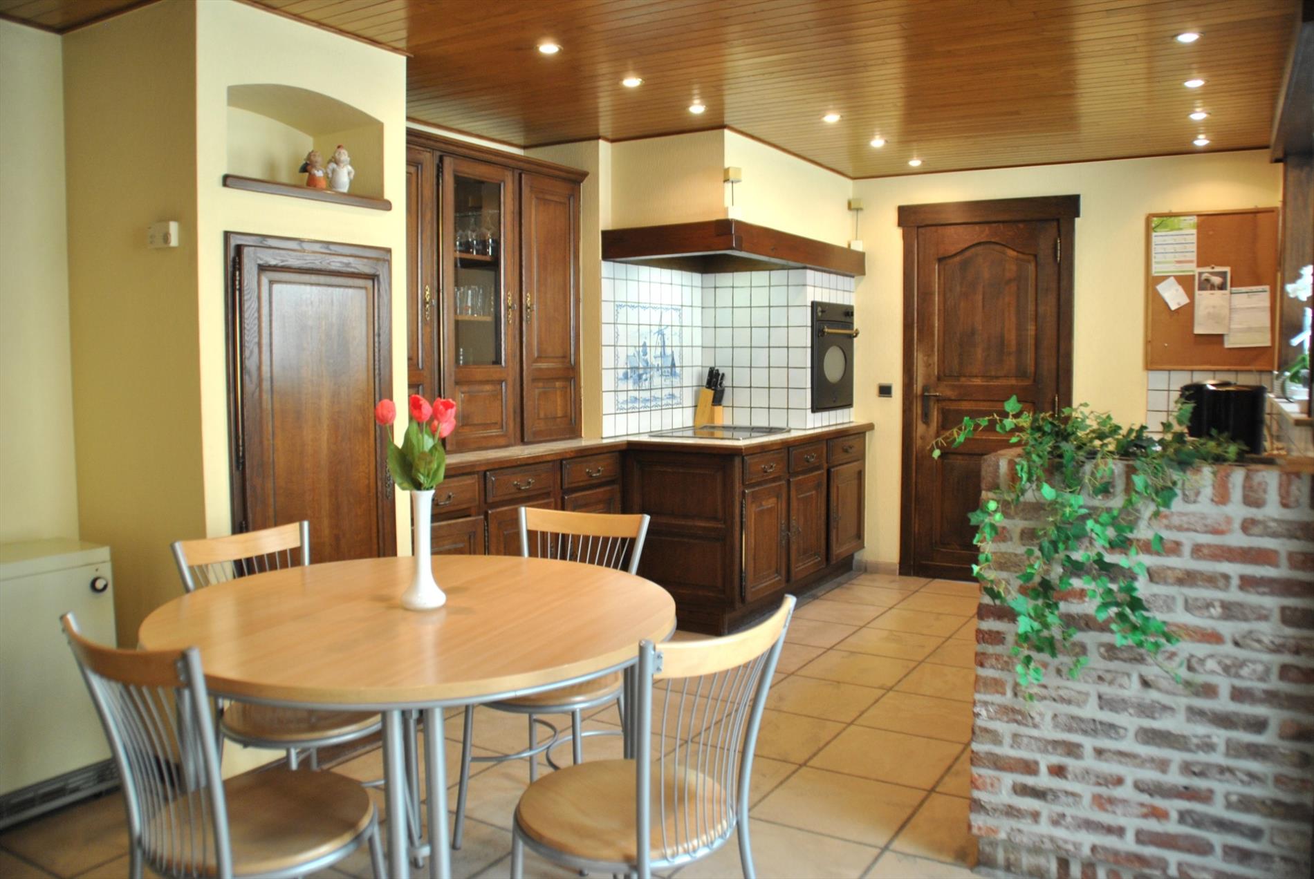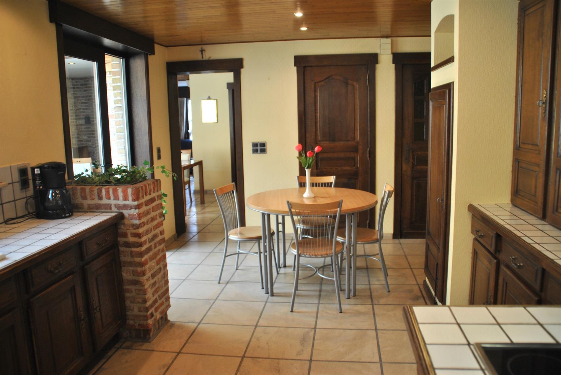 De keuken is heel ruim en biedt veel kastruimte. Aansluitend is er de badkamer met douche, lavabo en toilet. Er is ook nog een apart toilet.