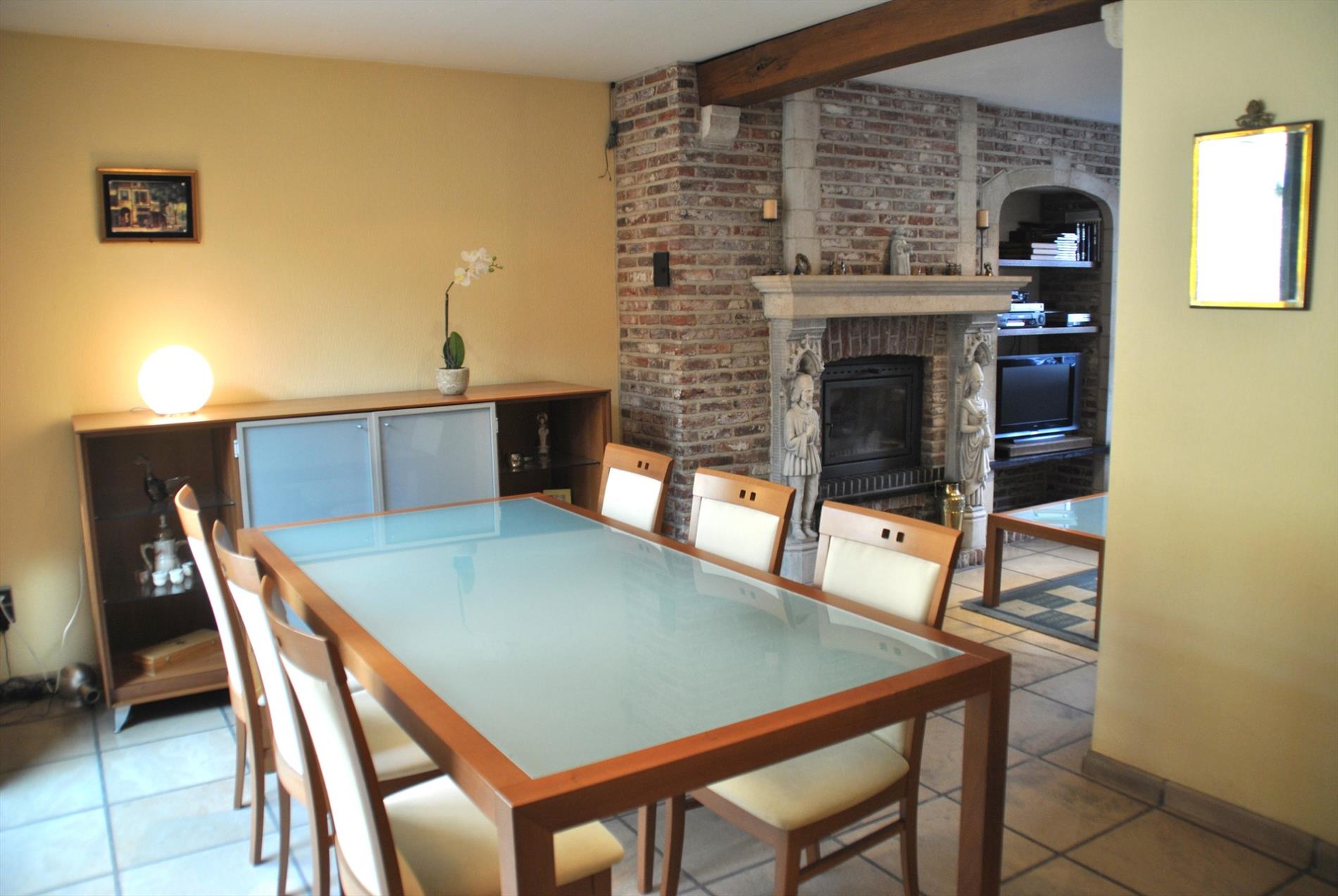 Dichtbij invalswegen en winkels bevindt zich deze charmante woning. Via de inkomhal betreden we dit eigendom. Hier vinden we de toegang tot de garage en de leefruimte. De leef- en zitruimte zijn heel lichtrijk en gezellig. De vele ramen zorgen ervoor dat alles hier baadt in het zonlicht. In de zitruimte zorgt de rustieke schouw met inbouwhaard voor extra sfeer.