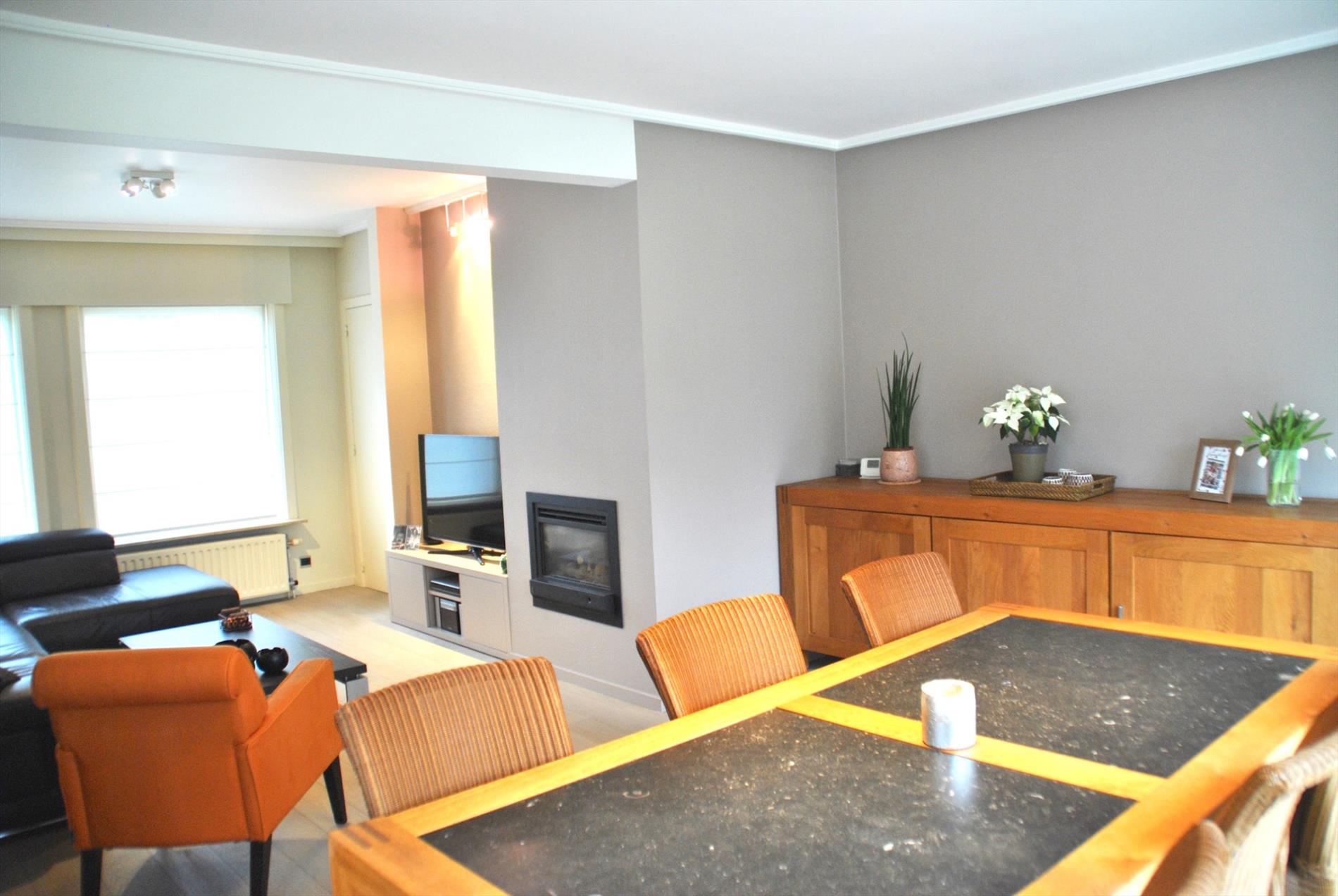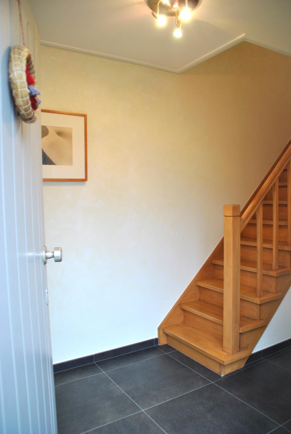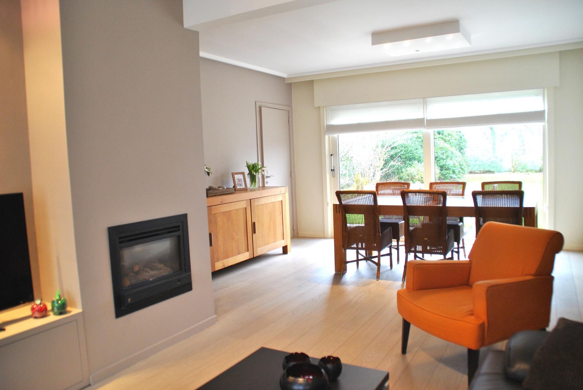 Via de voortuin en oprit komen we aan de inkomhal met gastentoilet om verder te gaan naar de leefruimte. Het massief parket en de gashaard zorgen ervoor dat het hier enorm gezellig is. Dankzij de vele ramen is het er zeer veel licht en hebben we een mooi zicht op de tuin en de groene omgeving.