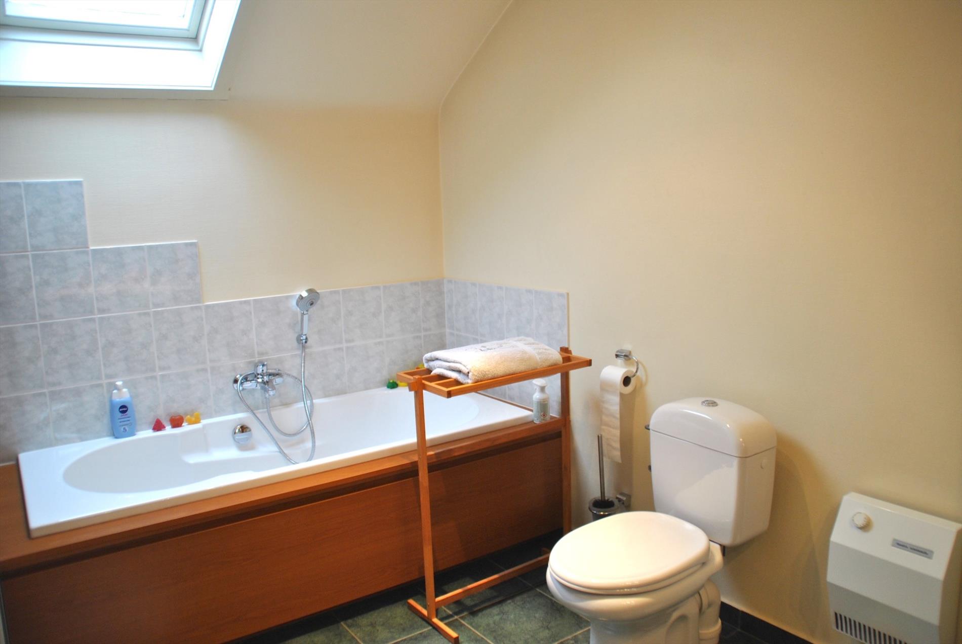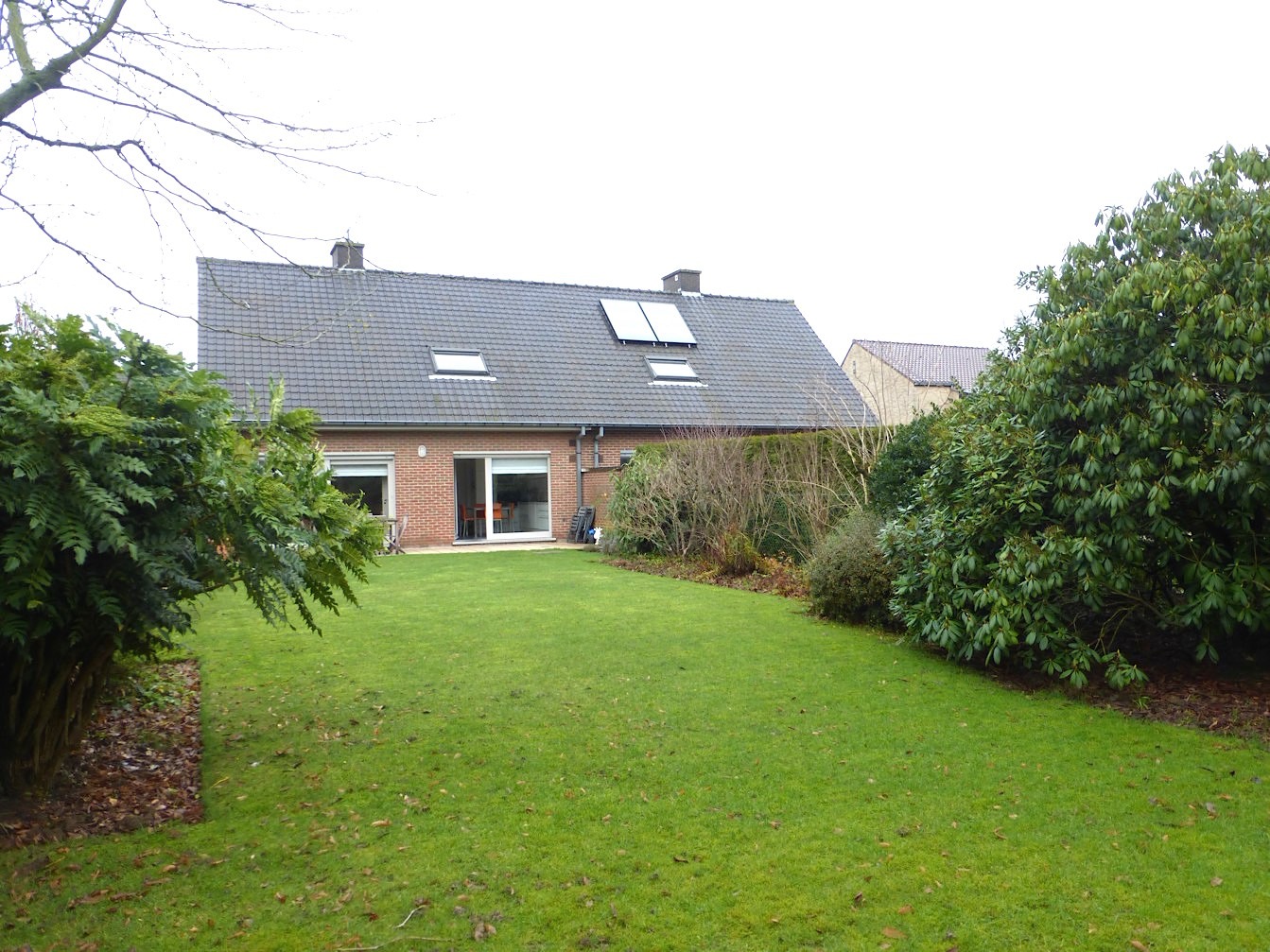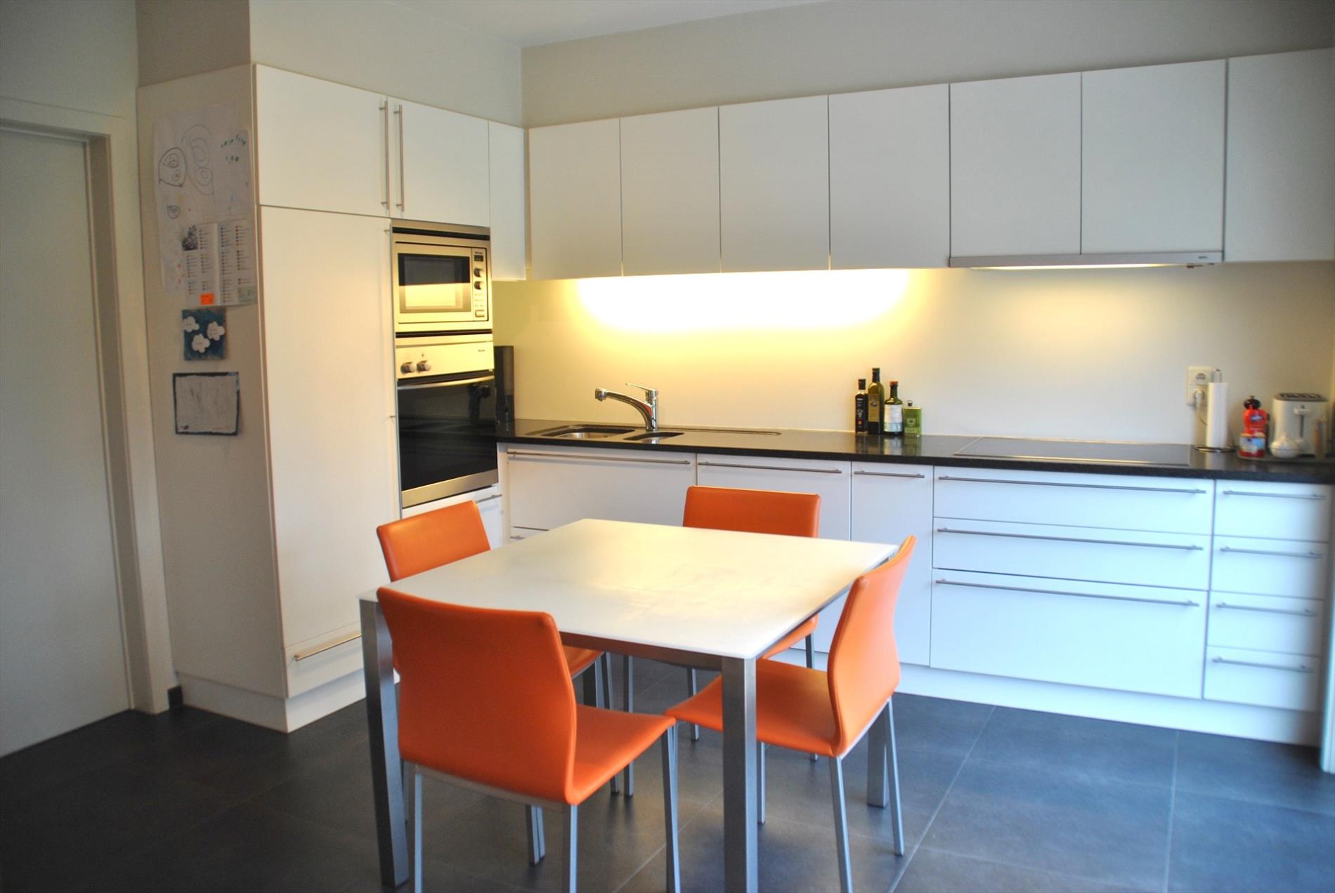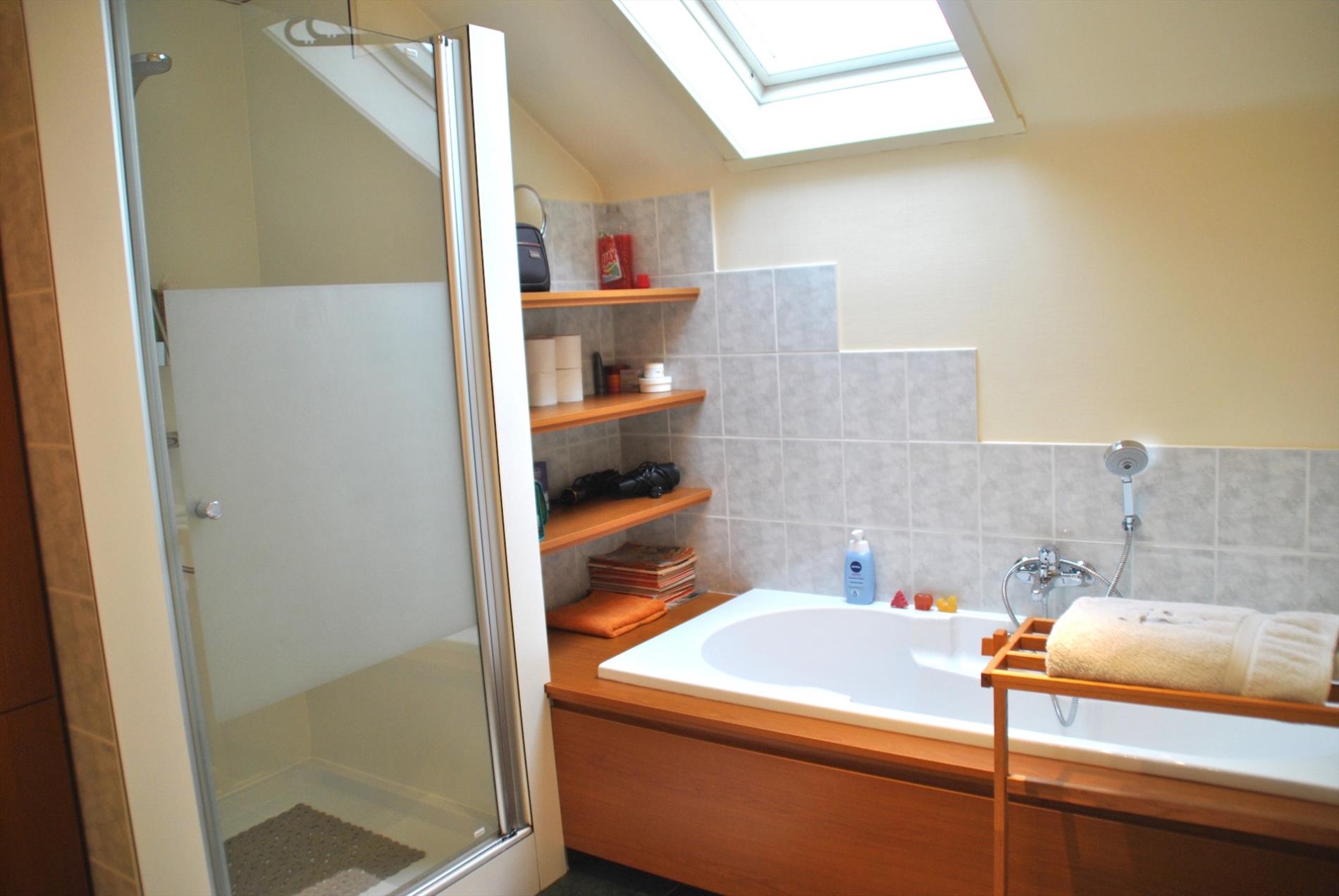 Aansluitend vinden we de keuken. Deze is volledig ingericht en afgewerkt met hoogwaardige materialen zoals natuursteen. Vanuit de keuken hebben we toegang tot de ruime garage. Hier is ook nog een berging en kleine bergzolder. Op de verdieping vinden we 3 mooie slaapkamers en een badkamer met lavabomeubel, toilet, ligbad én douche!