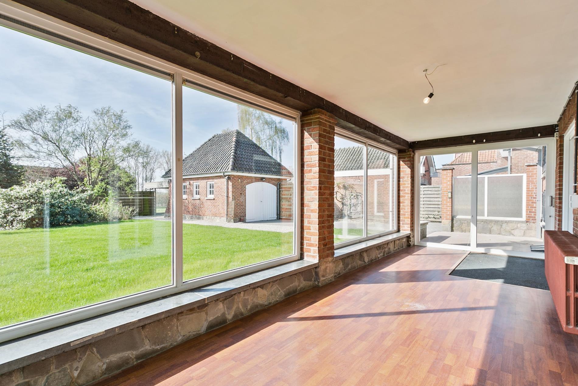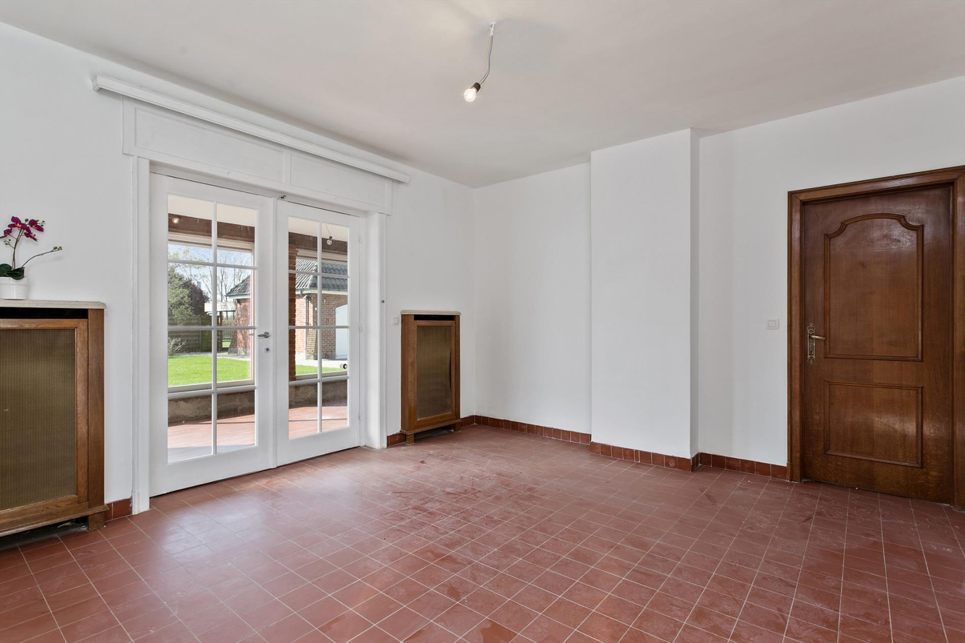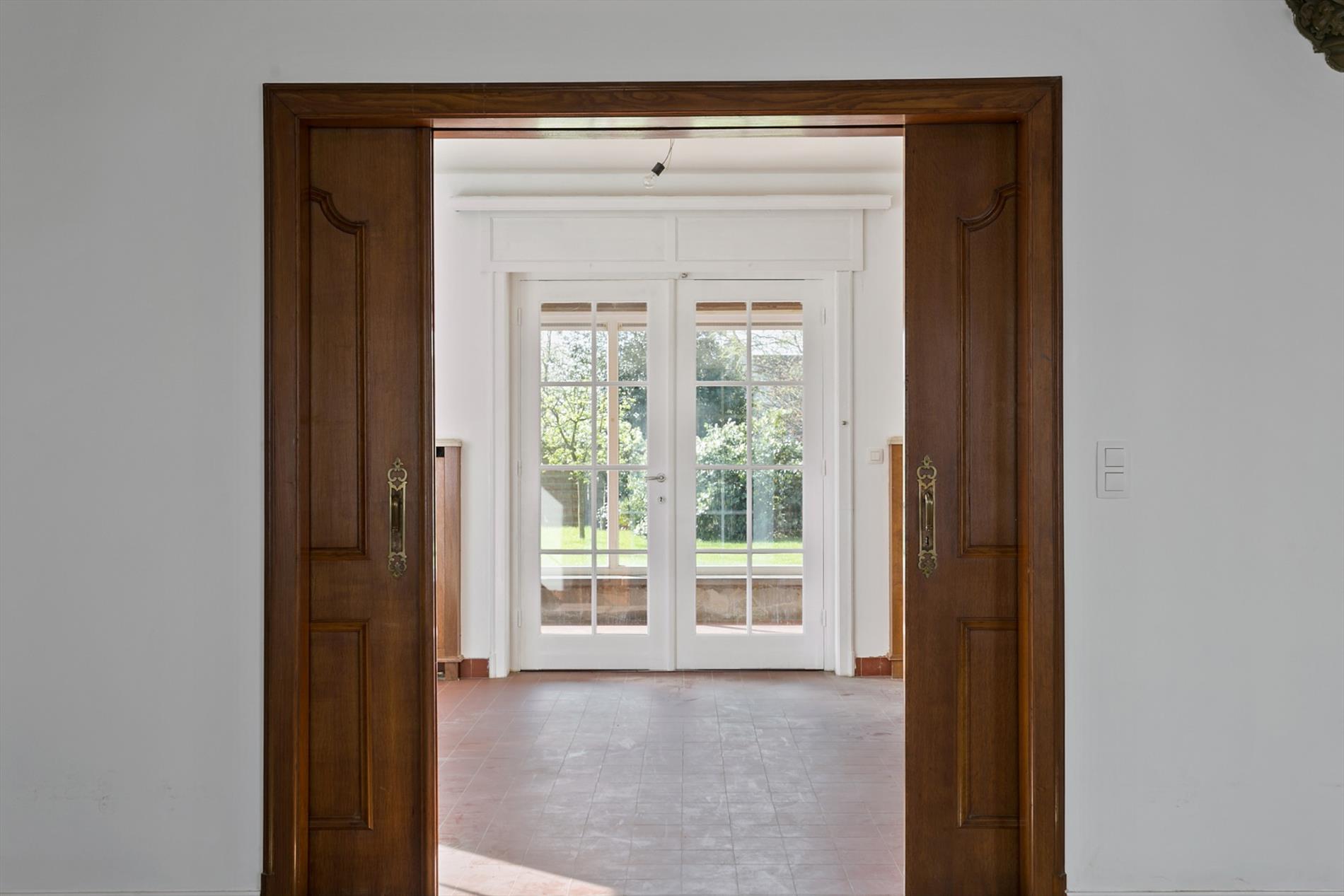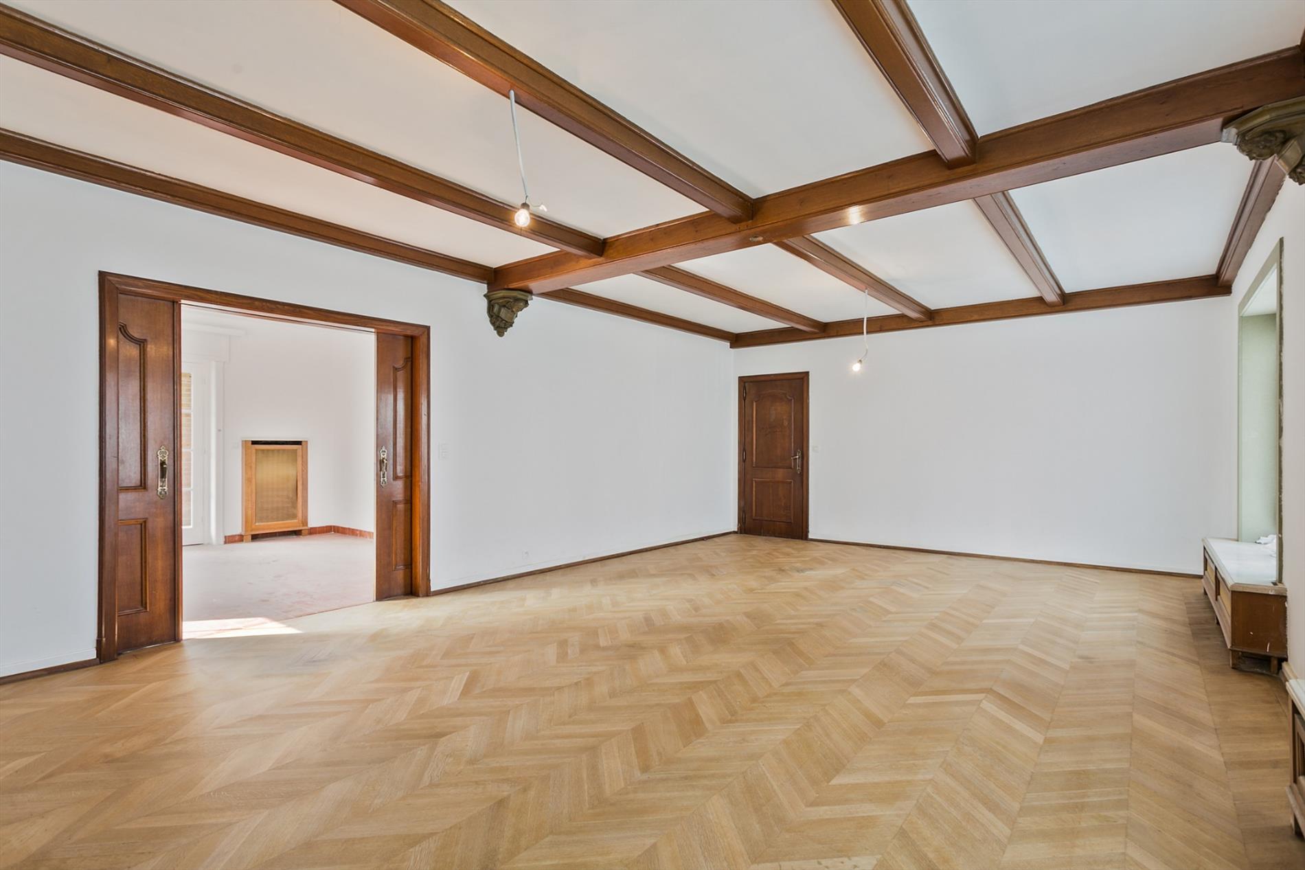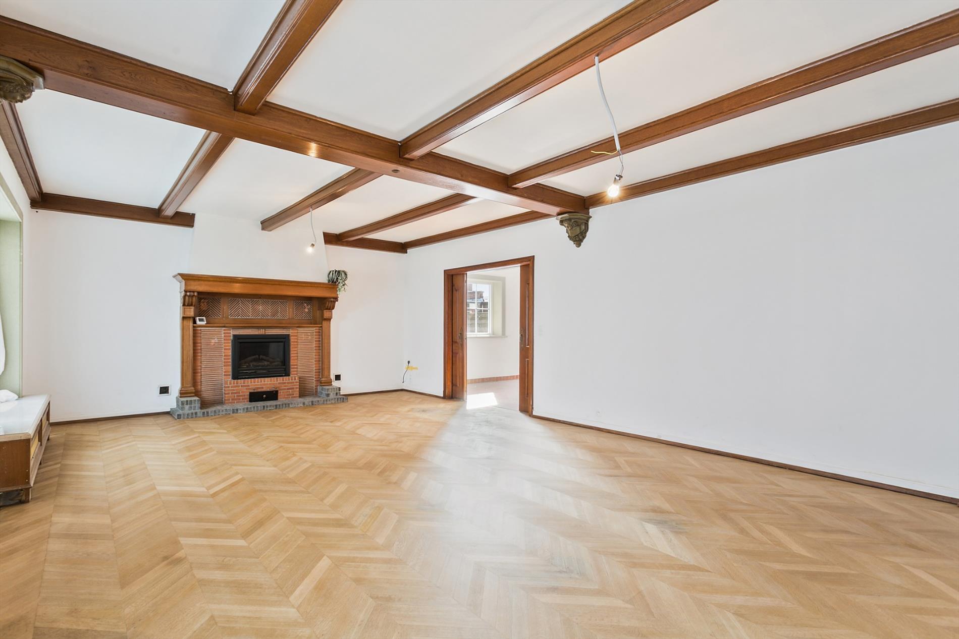 De living is zeer ruim, lichtrijk en is dankzij het mooie parket en de haard zeer gezellig en stijlvol. Via een prachtige dubbele houten schuifdeur komen we nog in een andere ruimte (zithoek) en gaan zo verder naar de veranda.