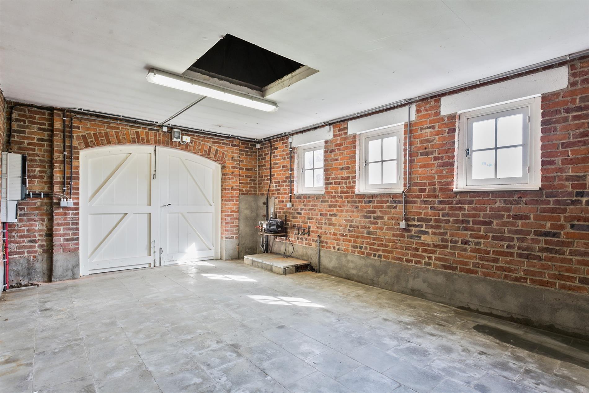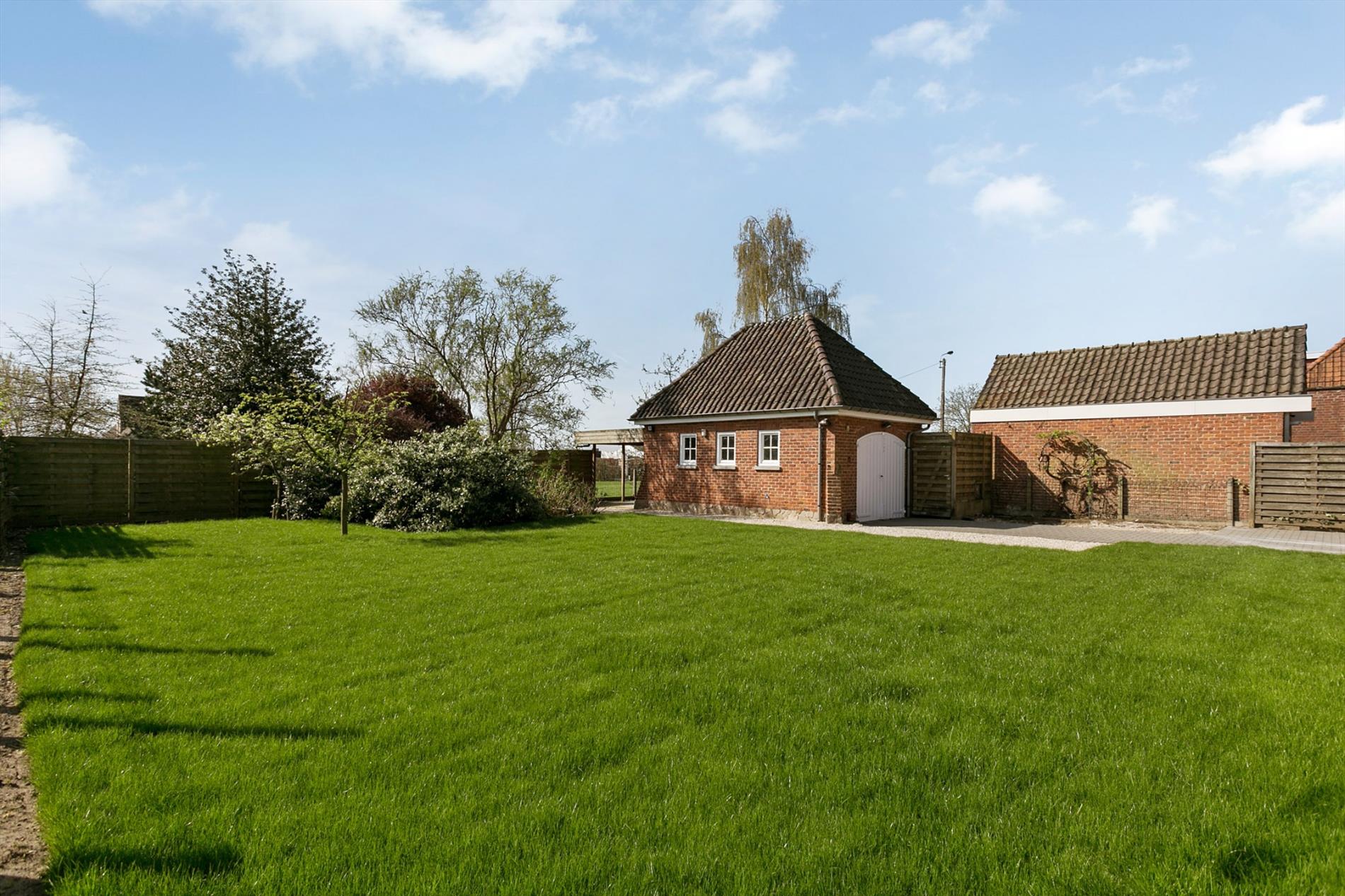 Via een lange oprit komen we aan de aparte garage.