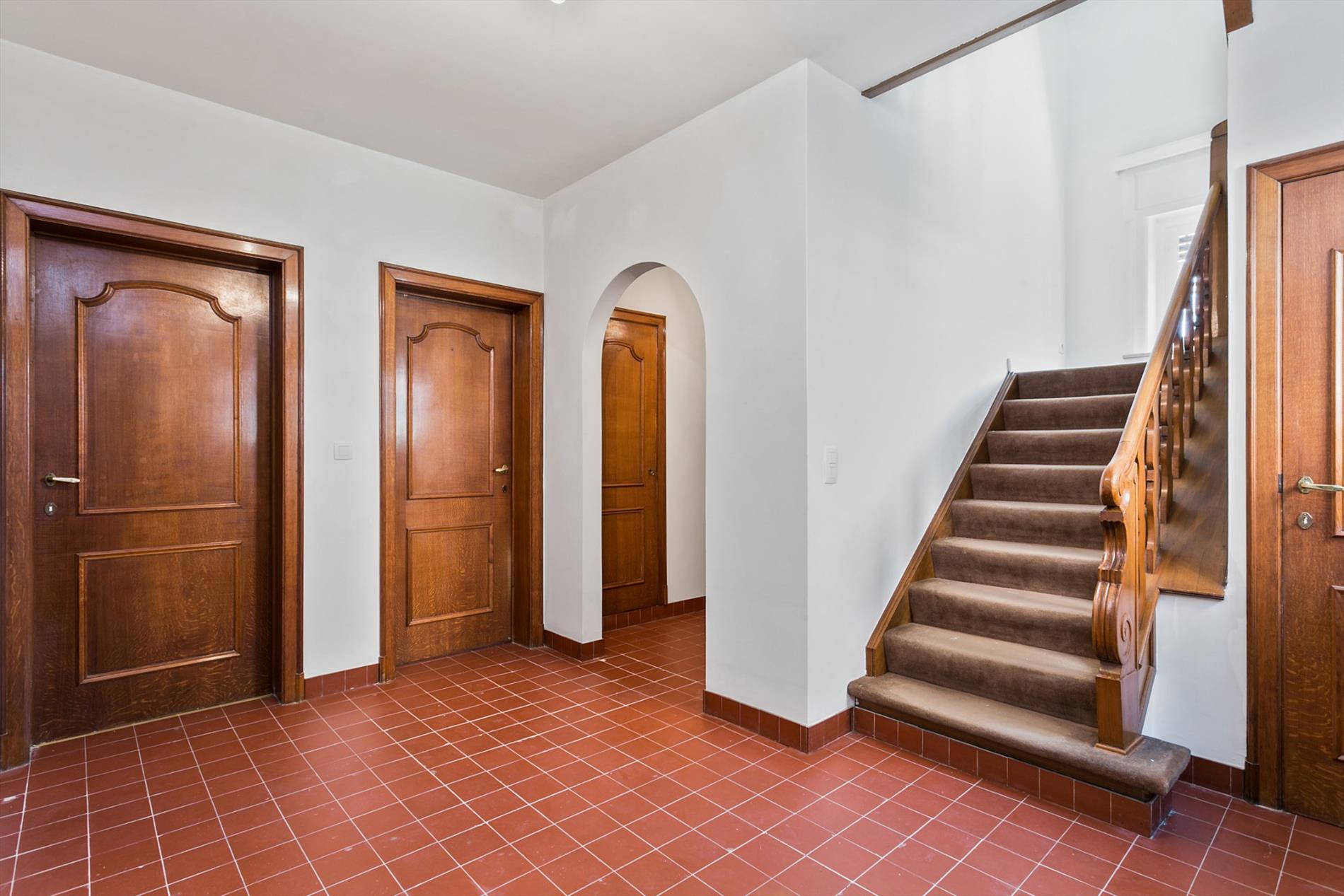 We betreden de woning langs de zijkant. In de inkomhal is er een vestiaire en apart gastentoilet. Ook een bureauruimte is via de hal bereikbaar en is dus volledig gescheiden van de privé.