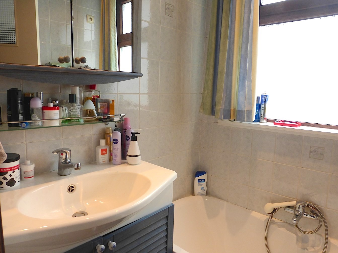 We komen binnen via de inkomhal om verder te gaan naar de living. Deze loopt van de voor- tot achtergevel en is dus lichtrijk. Aangrenzend is er de vernieuwde keuken die volledig is ingericht. Op het gelijkvloers vinden we tevens de badkamer (met lavabo en ligbad), een apart toilet en een handige berging/wasplaats.