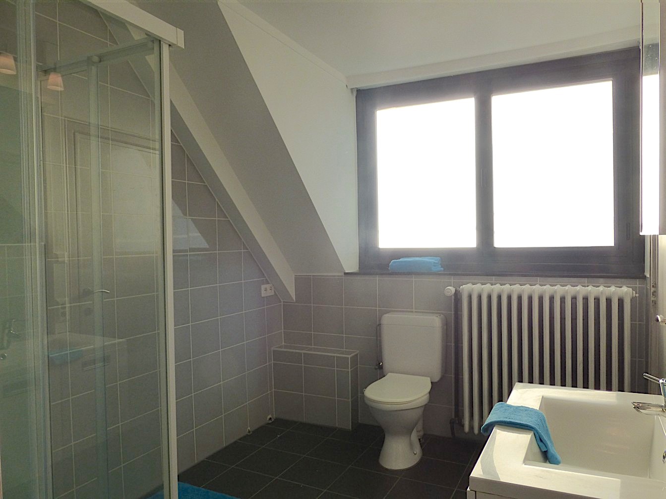 De verdieping beschikt over 2 zeer ruime slaapkamers en een vernieuwde badkamer met lavabomeubel, douche en toilet.