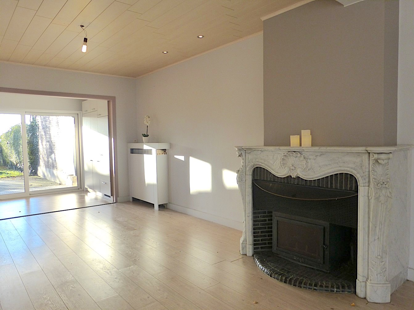 Via de lange oprit komen we aan de voordeur langs de zijkant van de woning. Bij het binnenkomen merken we meteen het karakter van de woning op. Een prachtige traphal, een dubbele glazen deur,... De living heeft een L-vorm en geniet, dankzij de grote ramen van veel lichtinval. De mooie houthaard zorgt voor de gezellige toets. Achteraan vinden we de open keuken met zicht op de tuin. Via het schuifraam kunnen we naar het terras met tuin. Deze is ingesloten en heeft een ideale zuid oriëntatie! Op het gelijkvloers vinden we nog een apart toilet.