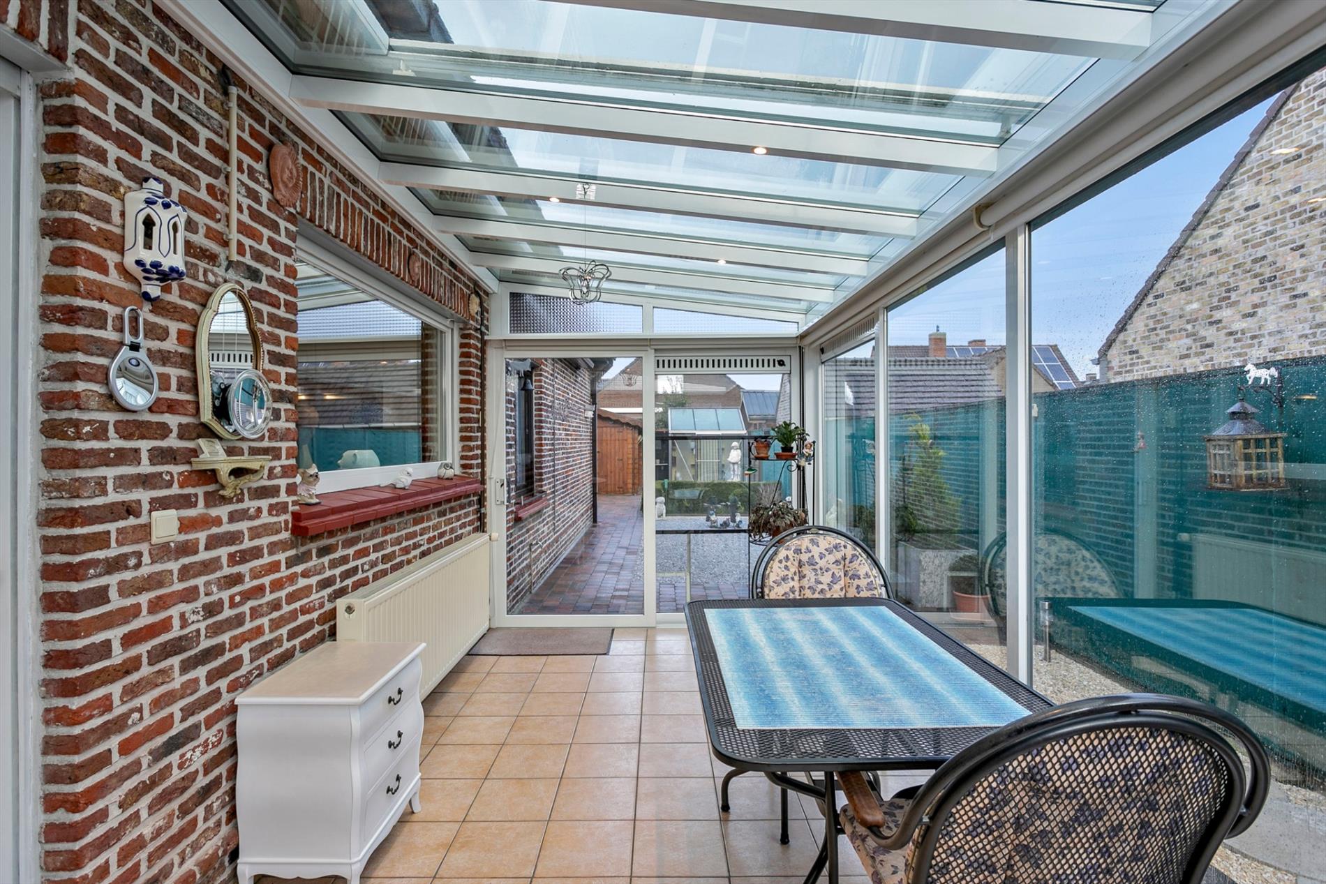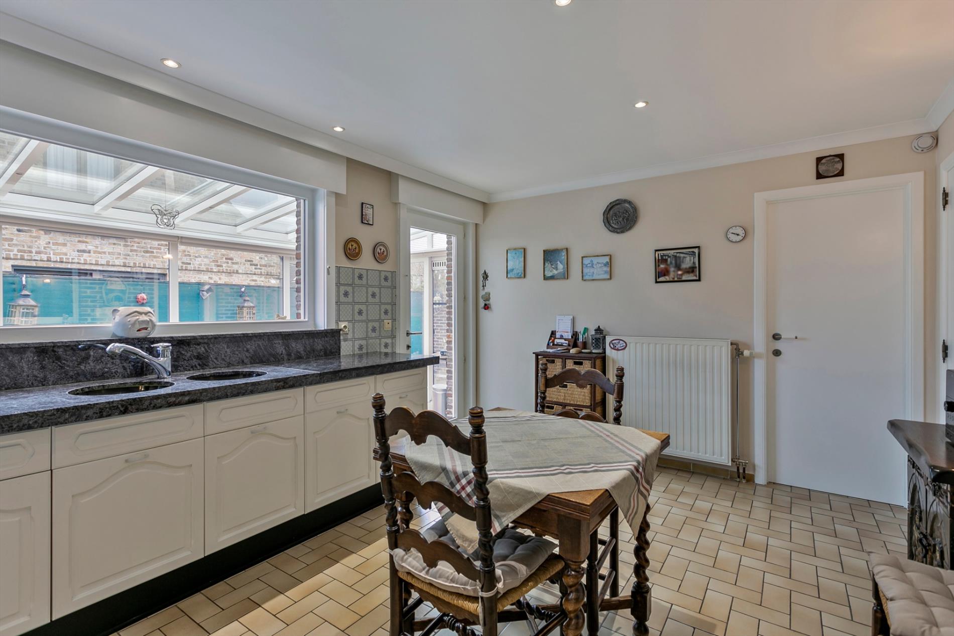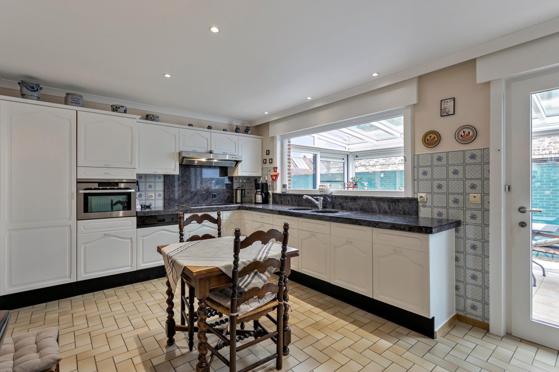 Aansluitend vinden we de grote keuken, waar ook plaats is voor een ontbijttafel. Van hieruit kunnen we naar de aangename veranda, die toegang geeft tot de prachtig aangelegde tuin.