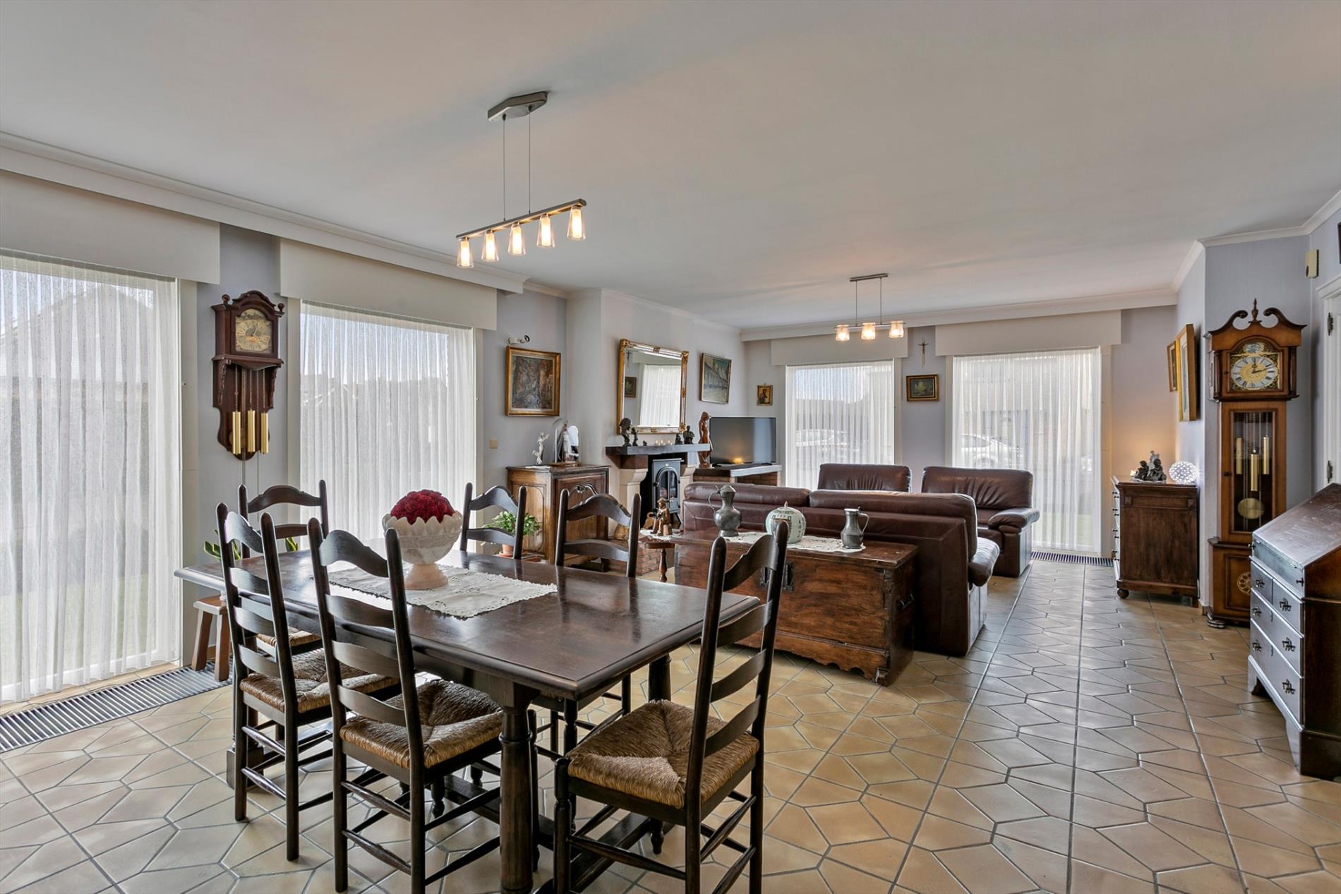 Op dit hoekperceel komen we de woning binnen in de hal, die voorzien is van een apart gastentoilet. De leefruimte is ruim, voorzien van veel ramen, wat zorgt voor een open, lichtrijk gevoel.