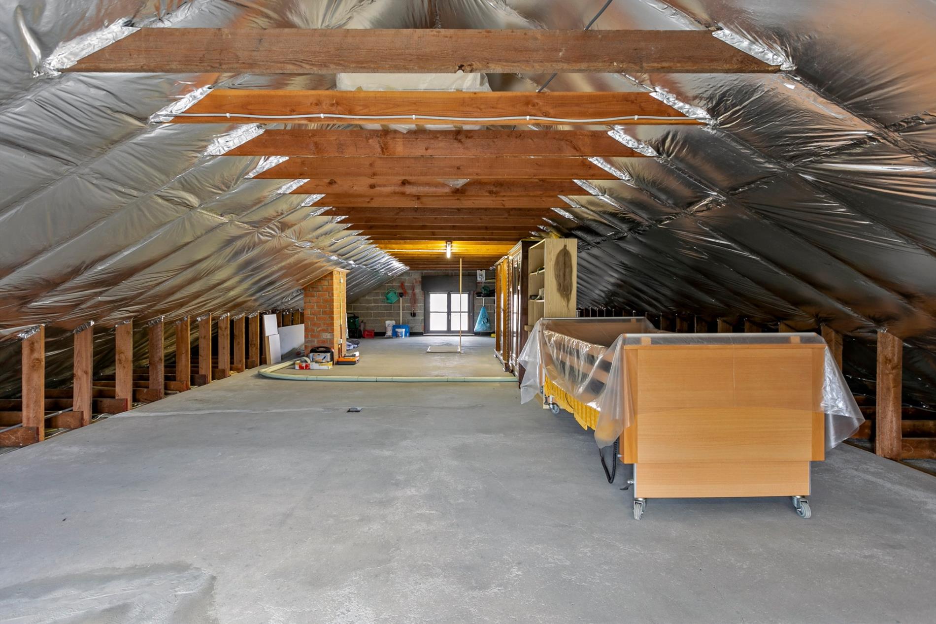 De enorme geïsoleerde zolder biedt de mogelijkheid om behoorlijk wat materiaal te stockeren of verder in te richten als extra woonoppervlak.