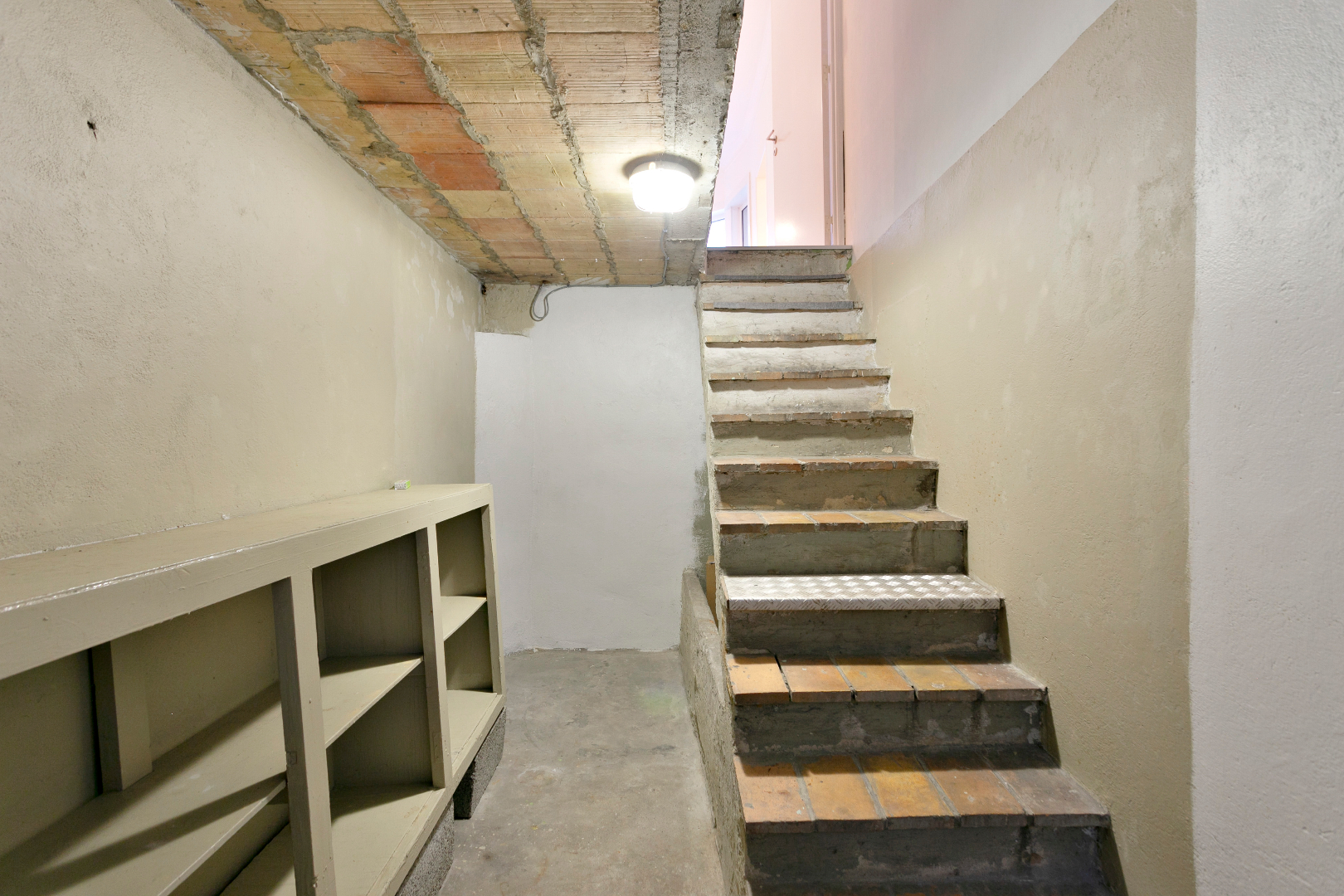 We komen de woning binnen via de mooie, open inkomhal. De living is ruim en heeft een L-vorm. Door de mooie schouw en de toffe ronde erker is het er zeer gezellig. Aansluitend vinden we de eenvoudig ingerichte keuken. Op het gelijkvloers is er nog een apart toilet, een handige berging en inpandige garage.