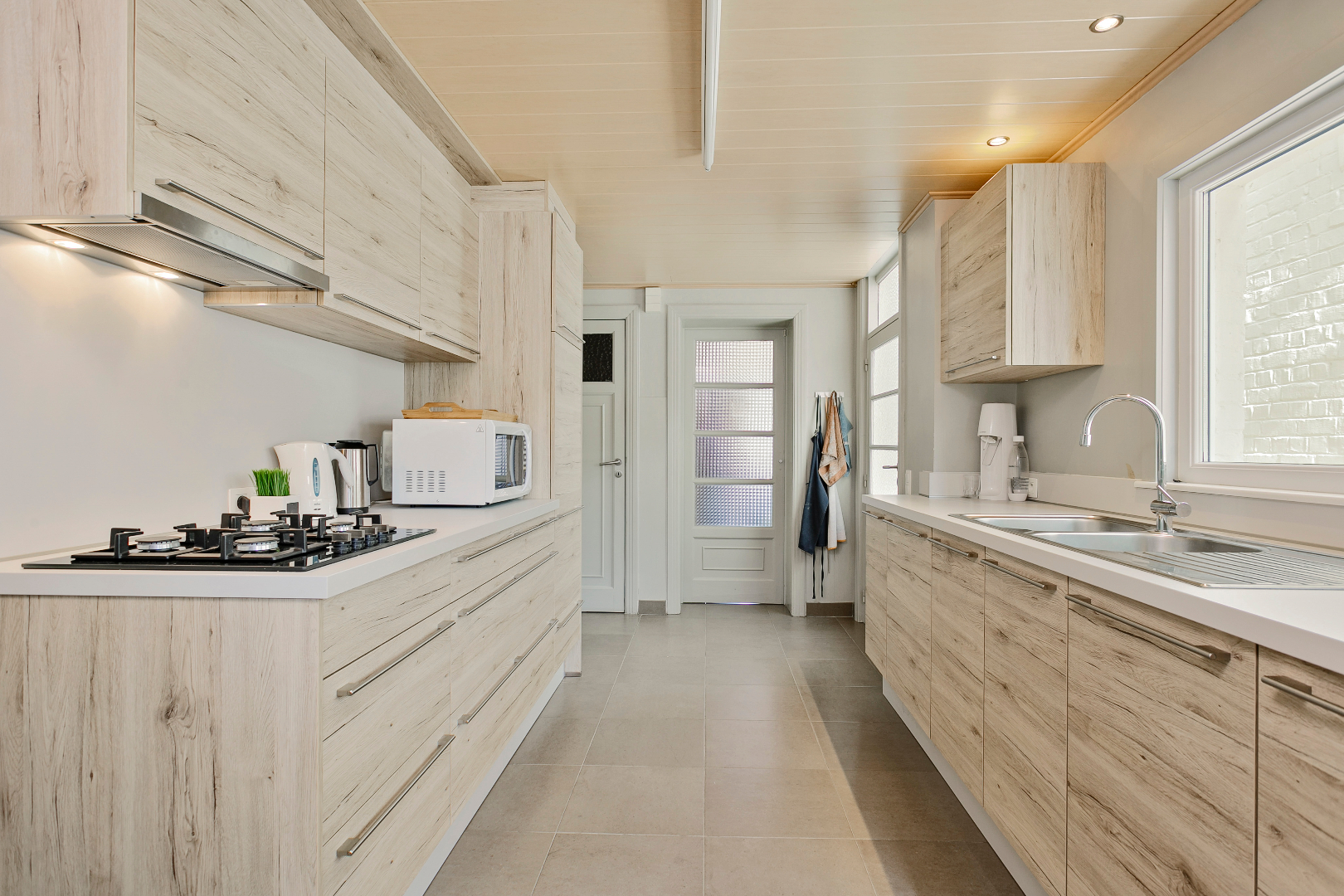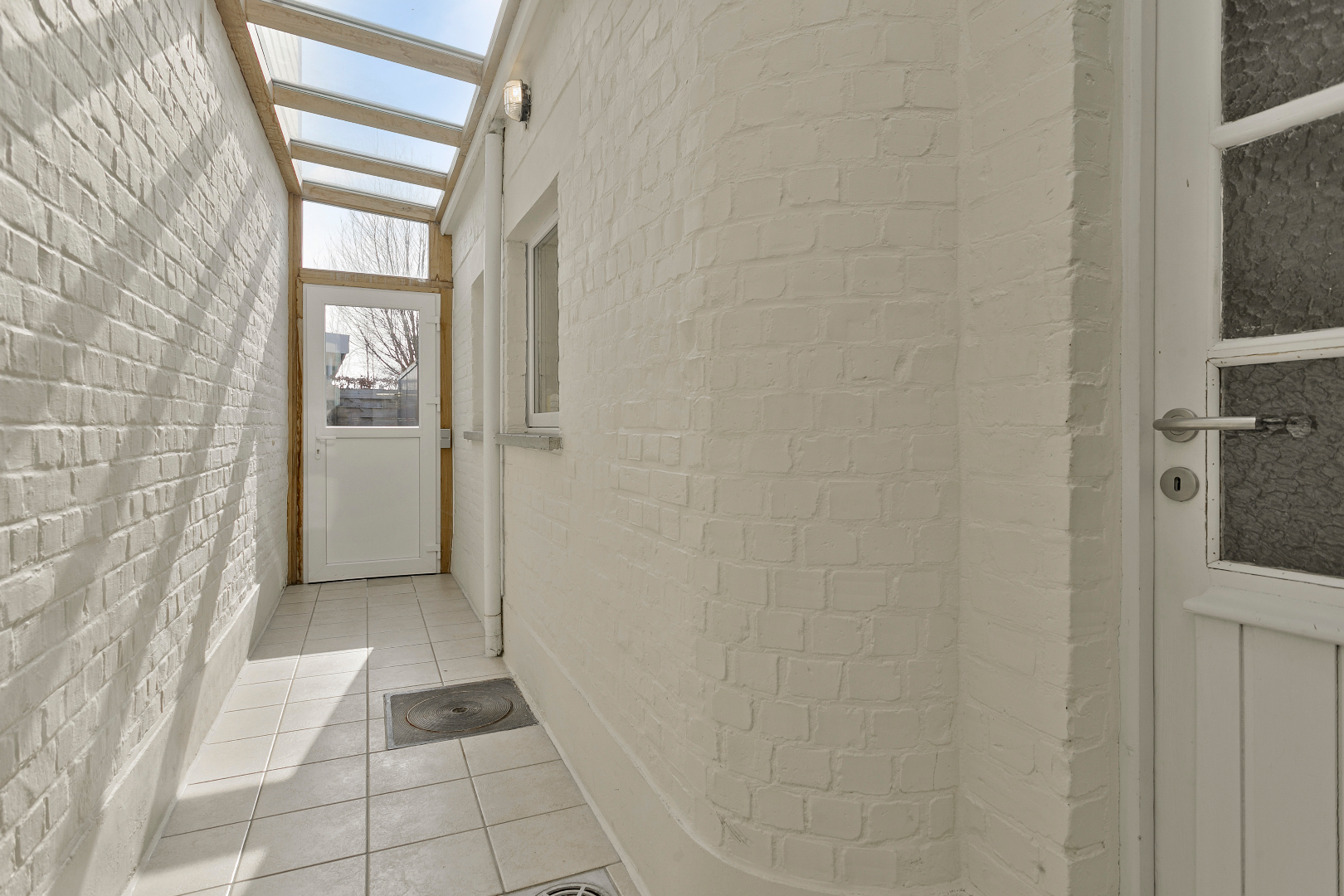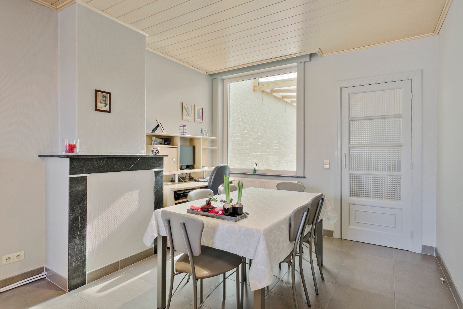 Via de hal komen we in de leefruimte. Deze is opgesplitst in een eetkamer en een zithoek op parket, wat het extra gezellig maakt. Aansluitend vinden we de mooie vernieuwde keuken. Van hieruit kunnen we naar de veranda die toegang geeft tot de stadstuin. Deze is zuid georiënteerd en beschikt over een ruime berging, die bereikbaar is via een wandelpad achteraan. Ideaal dus voor fietsen of ander materiaal in op te bergen!