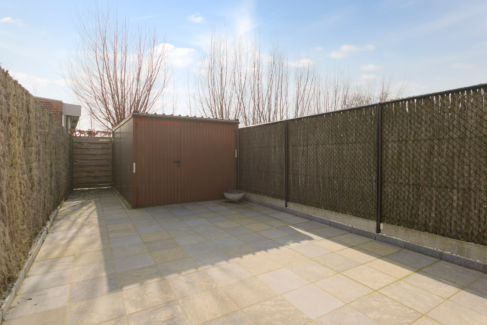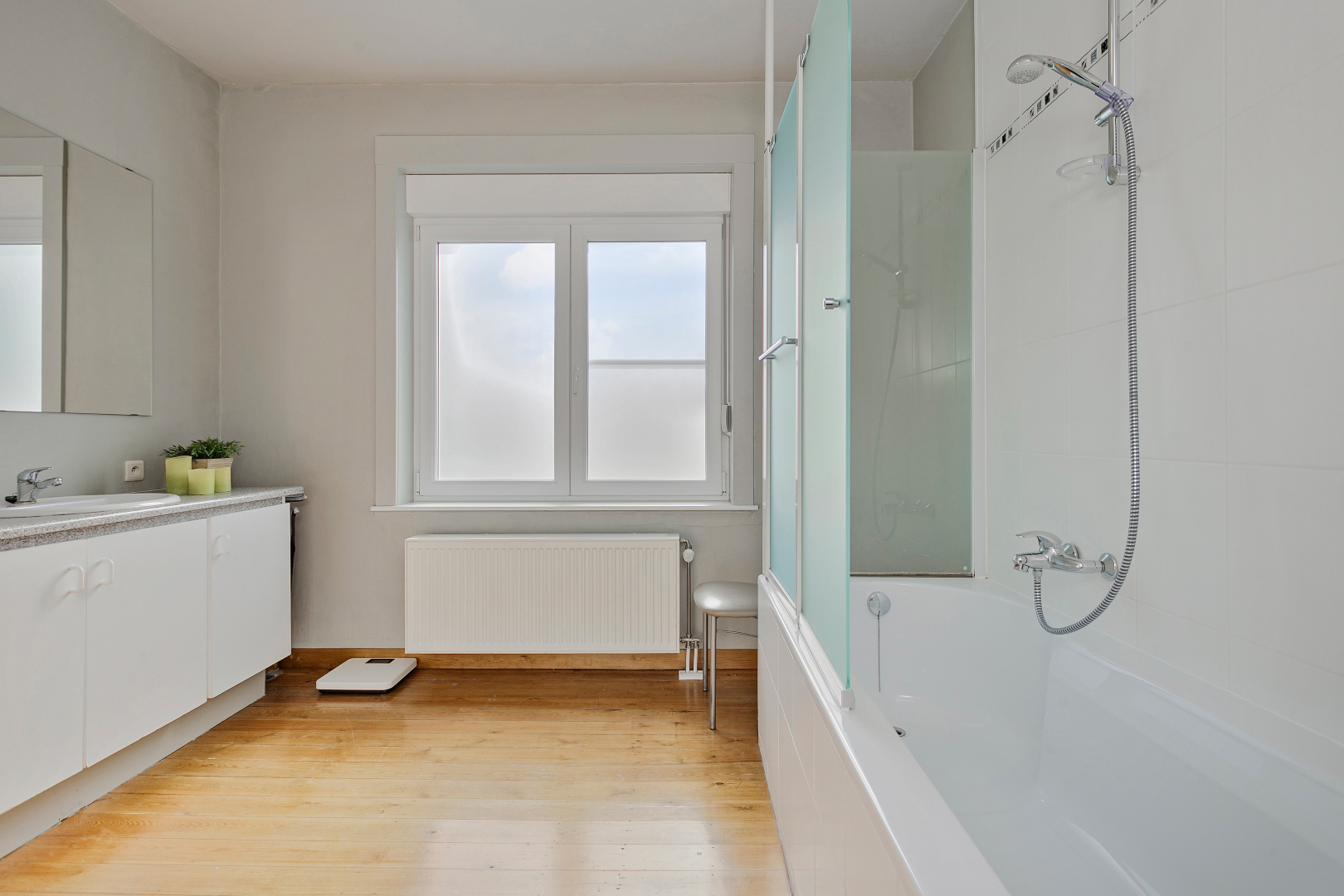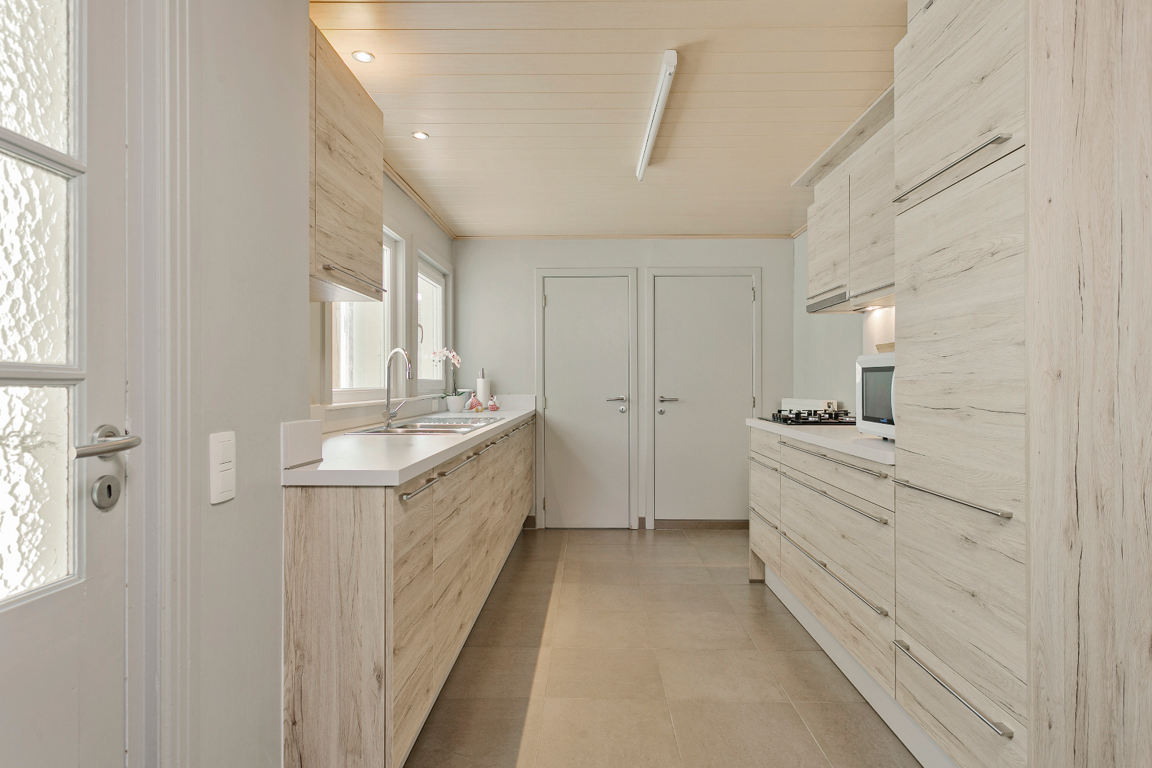 Via de hal komen we in de leefruimte. Deze is opgesplitst in een eetkamer en een zithoek op parket, wat het extra gezellig maakt. Aansluitend vinden we de mooie vernieuwde keuken. Van hieruit kunnen we naar de veranda die toegang geeft tot de stadstuin. Deze is zuid georiënteerd en beschikt over een ruime berging, die bereikbaar is via een wandelpad achteraan. Ideaal dus voor fietsen of ander materiaal in op te bergen!