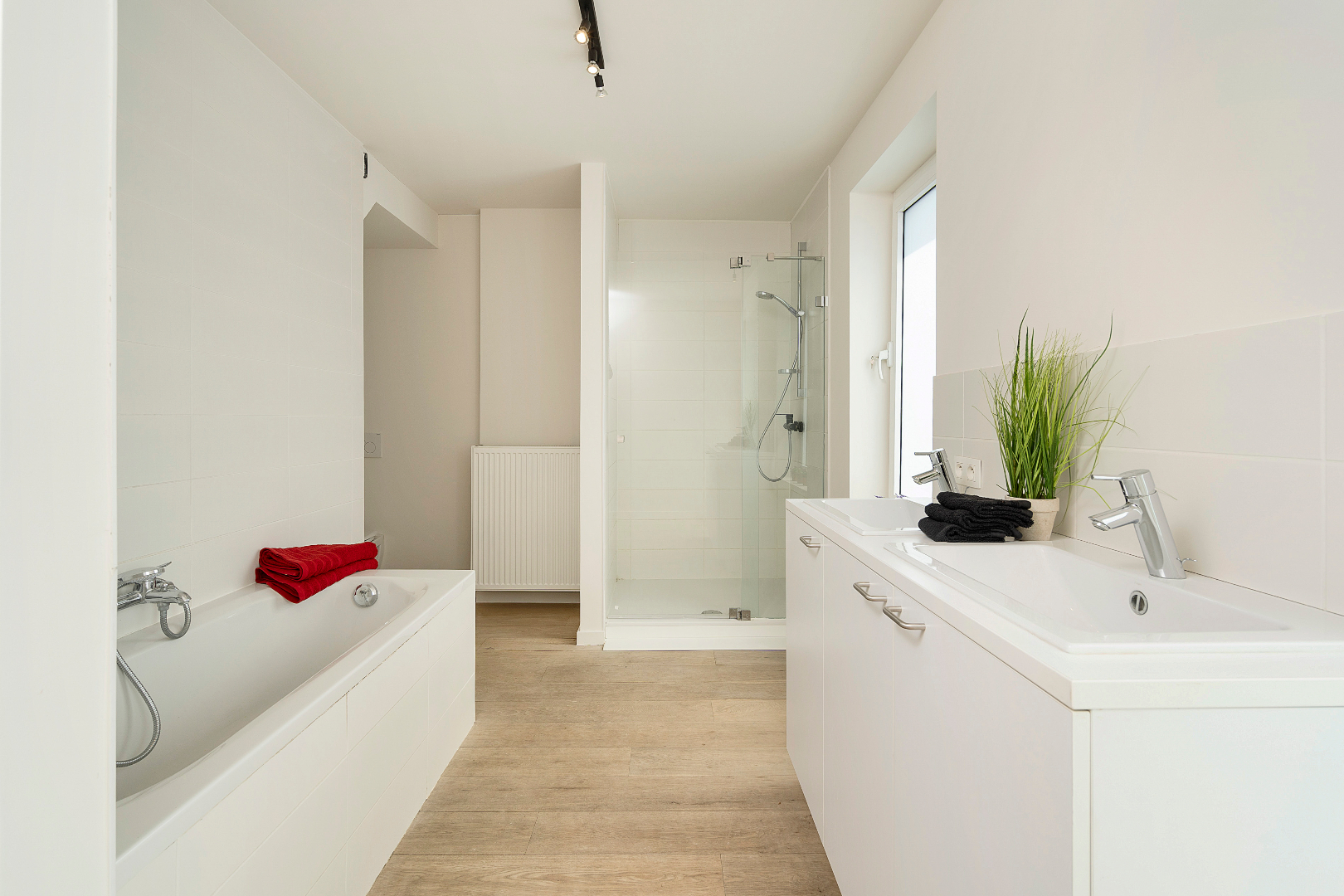 De eerste verdieping beschikt over 2 slaapkamers, waarvan 1 in 2 is gedeeld en een ruime badkamer met, dubbel lavabomeubel, ligbad, douche en toilet.