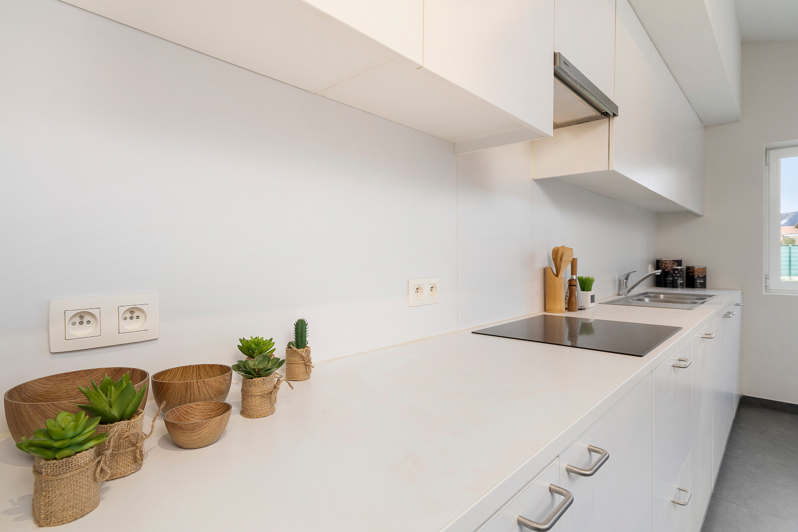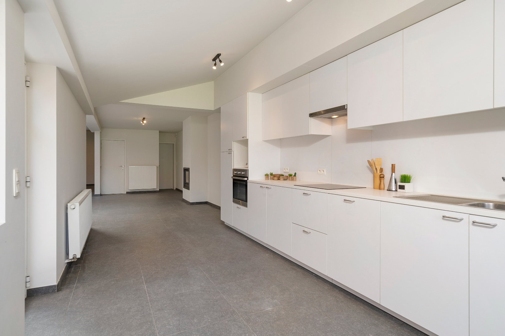 We komen de woning binnen in de hal met vestiaire en apart gastentoilet. Vooraan vinden we een handige (technische) berging. De leefruimte is ingedeeld met een zithoek, eetkamer en moderne open keuken. De leuke indeling en de hazard zorgt voor een zeer gezellig gevoel en via de grote ramen hebben we een mooi zicht op de tuin. Deze is eenvoudig aangelegd en voorzien van een ruim terras.