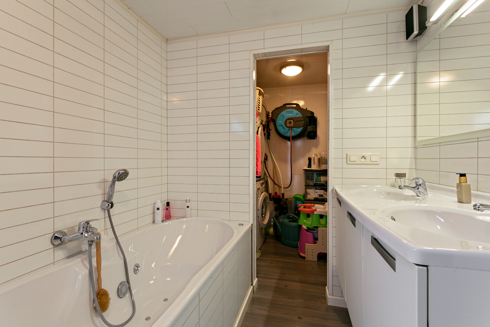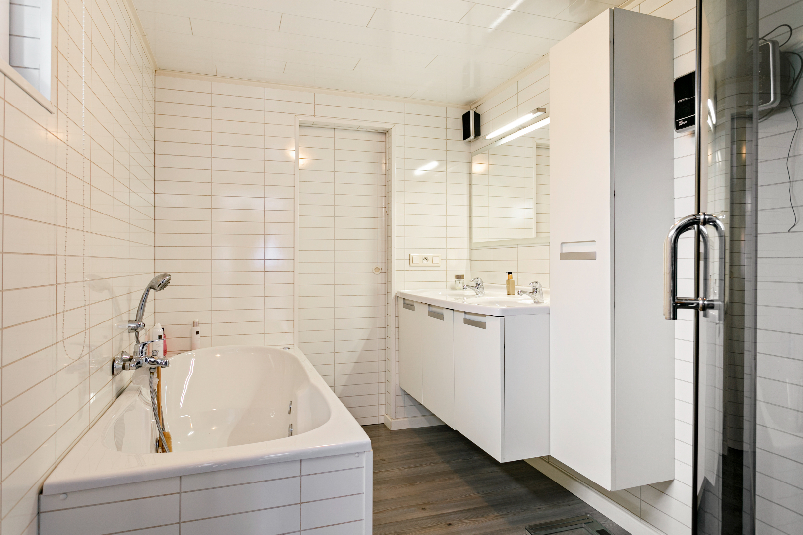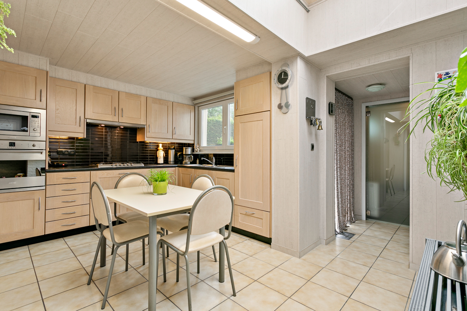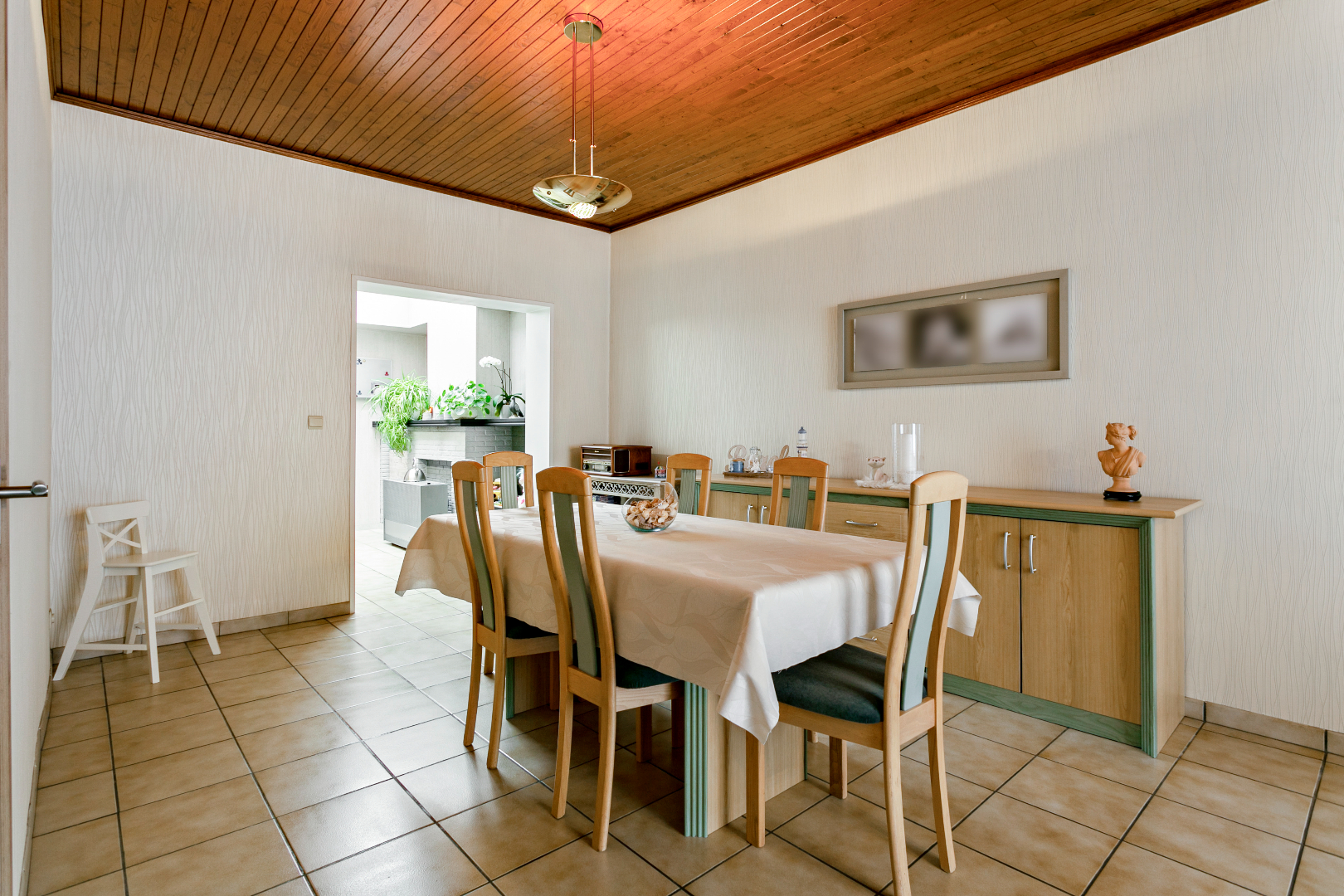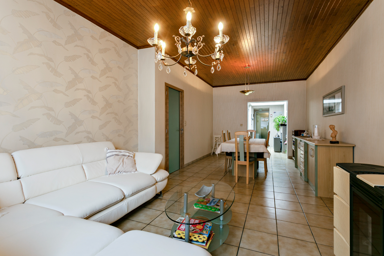 Achter deze mooie gevel schuilt een gezellige woning. Vanuit de inkomhal hebben we toegang tot de leefruimte en de bovenverdieping. Op het einde van de inkomhal is er ook een ruimte waar een fiets kan worden geplaatst. De leefruimte bestaat uit een zit- en eetgedeelte en is gezellig aangekleed. Aansluitend vinden we de ingerichte keuken. Deze is volledig ingericht en heel lichtrijk. Het is hier zalig koken onder het licht van de koepel. Naast de keuken is er een apart toilet en de badkamer met dubbele lavabo, bubbelbad en douche. Op het gelijkvloers bevindt zich achter de badkamer een handige wasruimte.