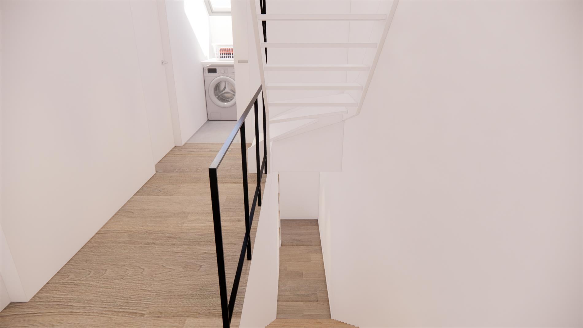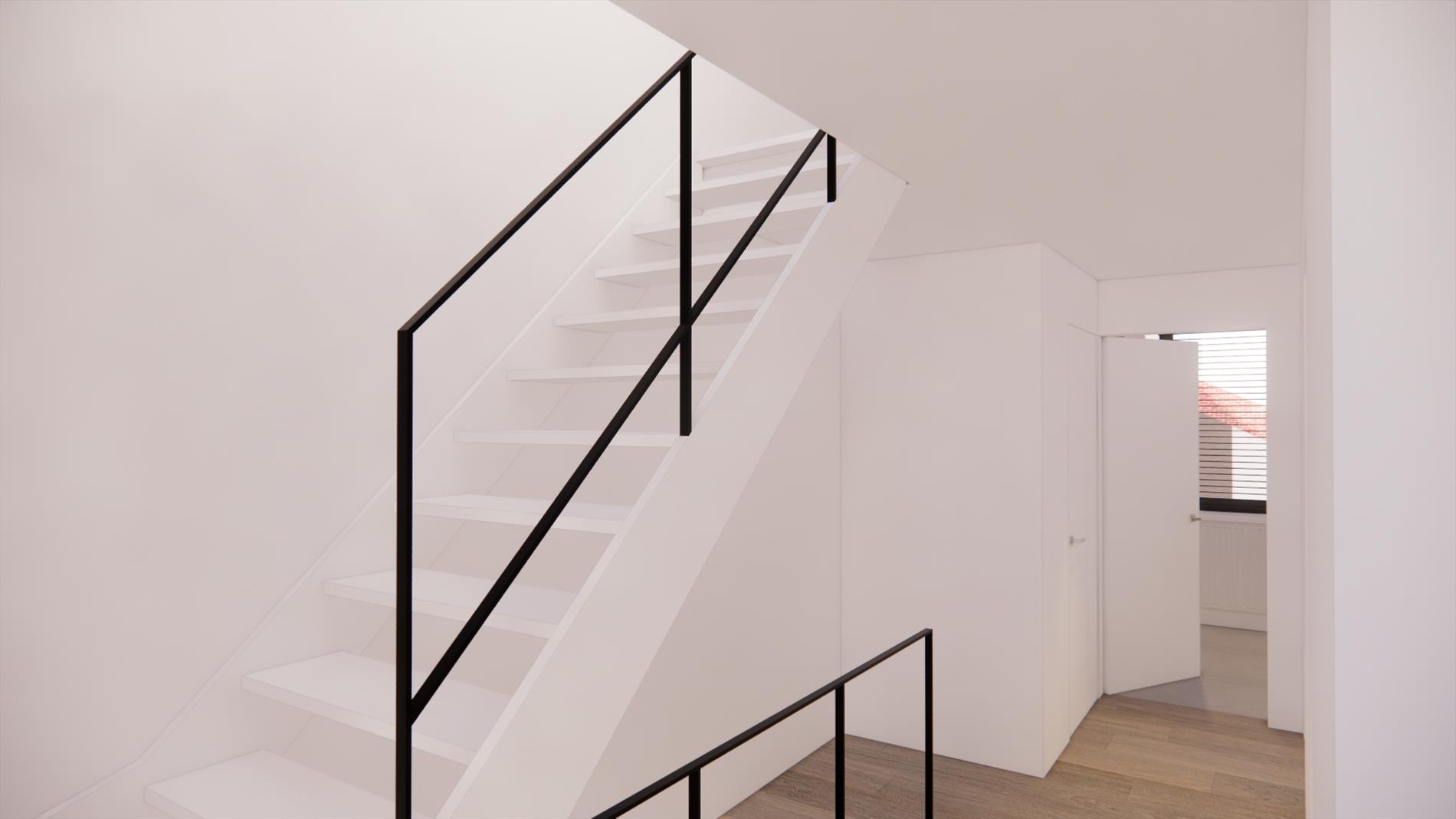 Een vaste trap brengt ons naar de zolder die mogelijks nog kan worden ingericht tot extra kamers.
