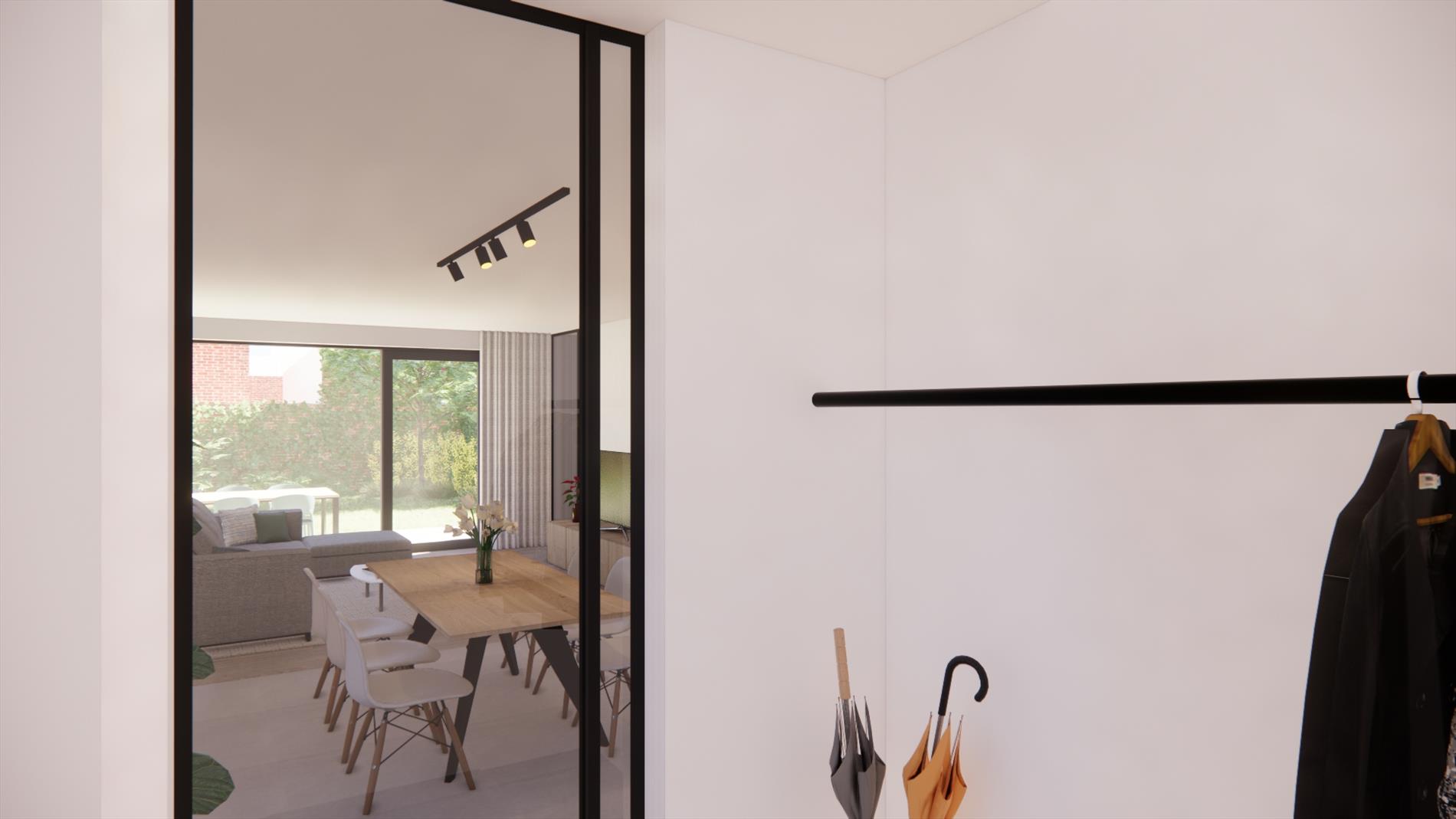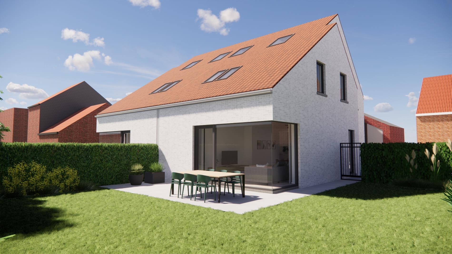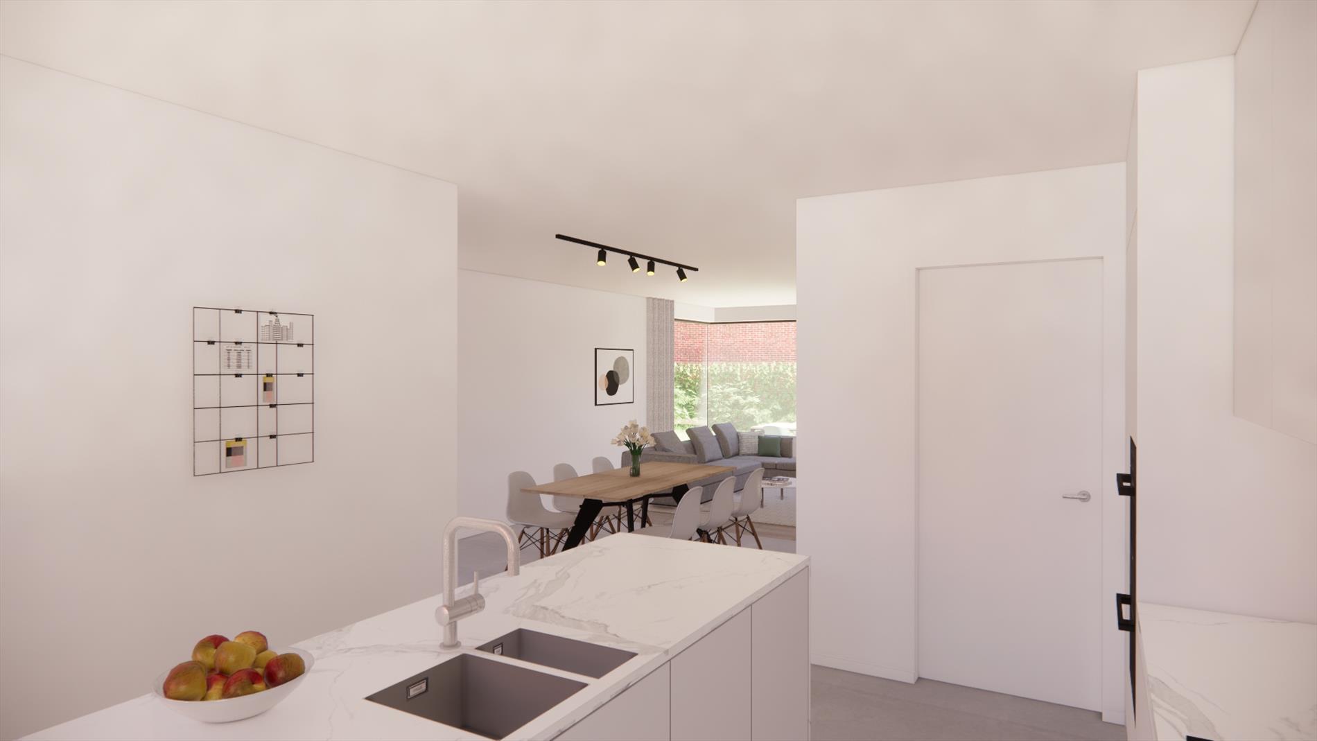 Vlakbij winkels, scholen en openbaar vervoer vinden we deze mooie nieuwbouwwoning terug. Deze maakt deel uit van de kleine verkaveling ‘’t Roodhuys’ bestaande uit 2 nieuwbouwwoningen en een totaalrenovatie van een oude herberg. De buitenkant onthult reeds dat het om een eigendom gaat die met de grootste precisie is afgewerkt. Langs de oprit, met plaats voor 2 wagens, bereiken we de voordeur die ons binnenleidt in een inkomhal met gastentoilet. Doorheen de glazen deur met zwart stalen frame kunnen we reeds proeven van de smaakvol ingerichte leefruimte. Door de grote raampartij met hoekraam achteraan worden we ondergedompeld in een zee van licht en ruimte. De leefruimte is opgedeeld in een zithoek op parket en een eethoek. Vanuit beide is er mooi zicht op de tuin. De open keuken bevindt zich langs de voorzijde van de woning. De keuken beschikt over een eiland en kan volgens eigen smaak worden ingericht. Aanpalend is er een handige berging.