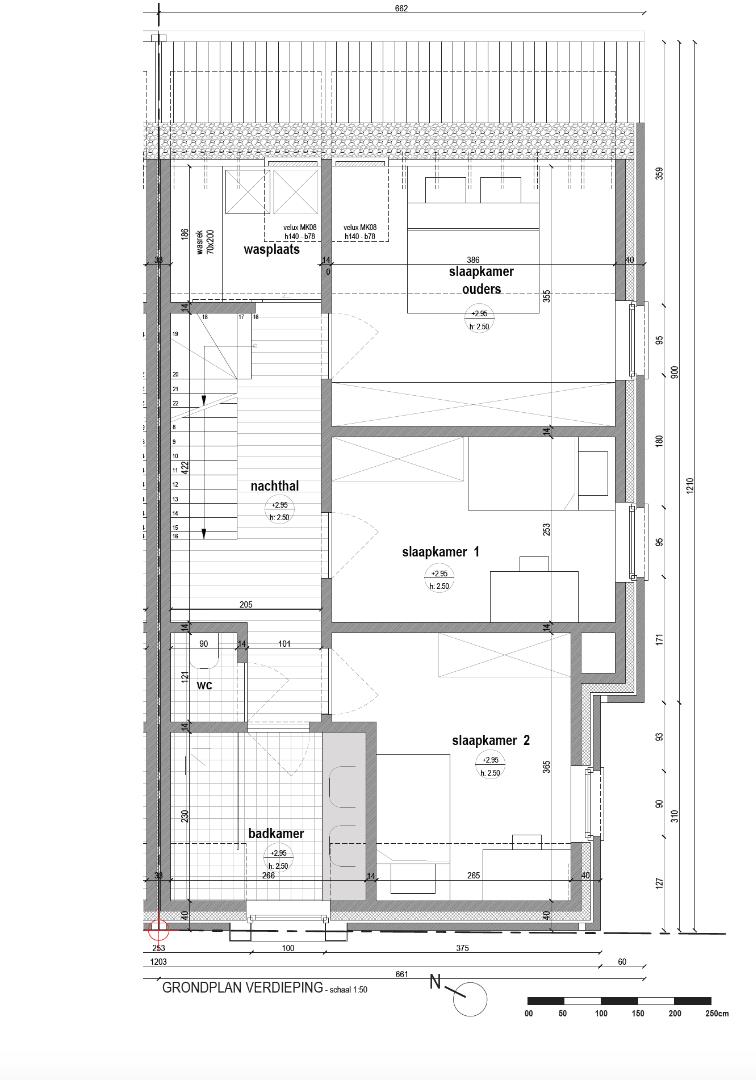 Op de bovenverdieping vinden we de ouderslaapkamer, 2 kinderkamers, een apart toilet, de wasberging en de badkamer terug. De badkamer bestaande uit een dubbele lavabo en inloopdouche kan nog naar eigen smaak worden afgewerkt.