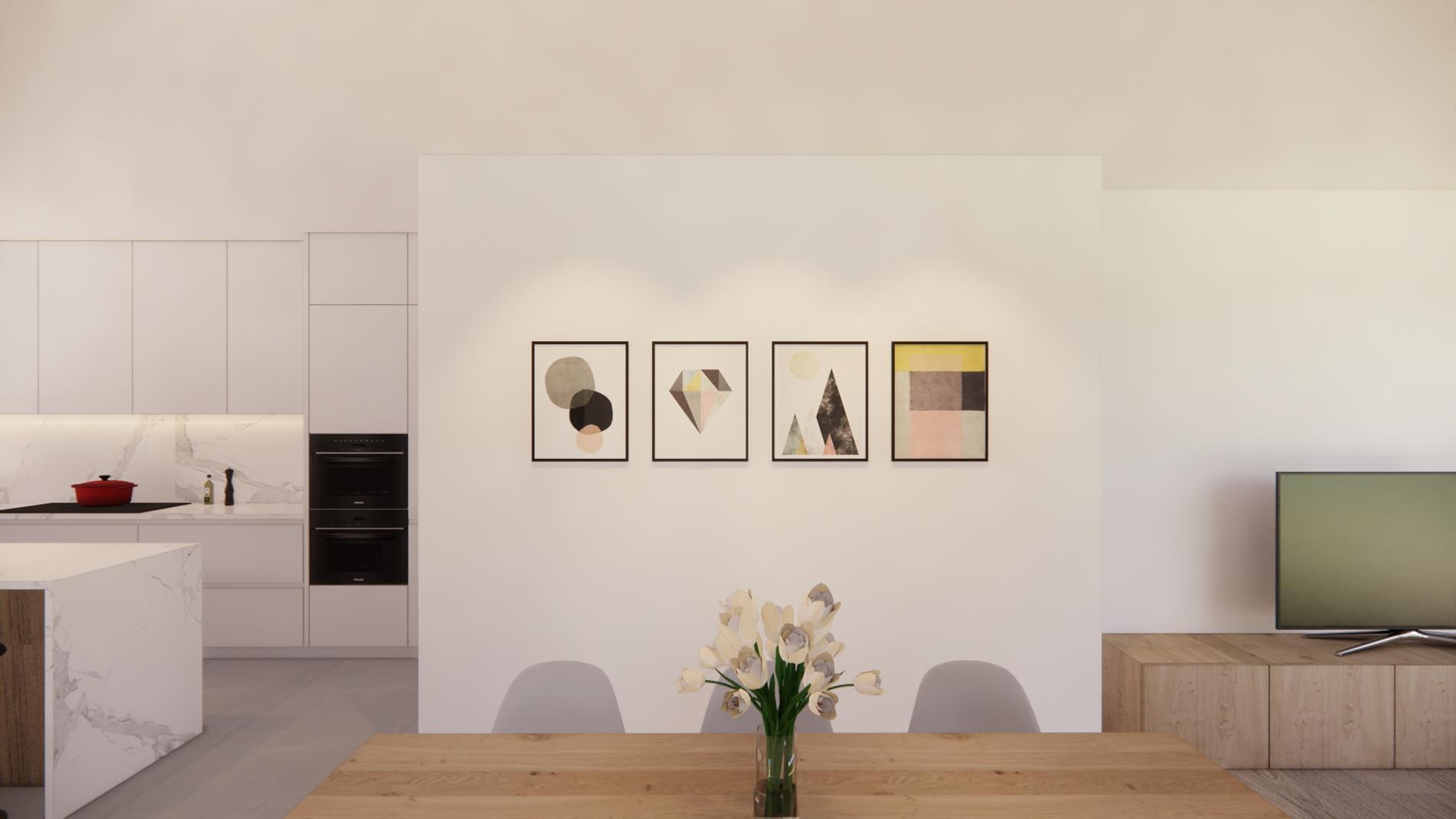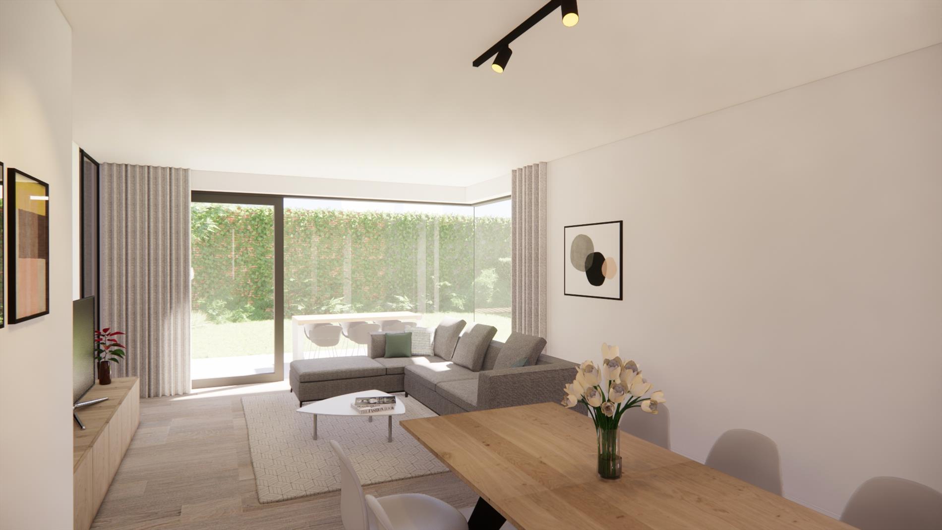 Vlakbij winkels, scholen en openbaar vervoer vinden we deze mooie nieuwbouwwoning terug. Deze maakt deel uit van de kleine verkaveling ‘’t Roodhuys’ bestaande uit 2 nieuwbouwwoningen en een totaalrenovatie van een oude herberg. De buitenkant onthult reeds dat het om een eigendom gaat die met de grootste precisie is afgewerkt. Langs de oprit, met plaats voor 2 wagens, bereiken we de voordeur die ons binnenleidt in een inkomhal met gastentoilet. Doorheen de glazen deur met zwart stalen frame kunnen we reeds proeven van de smaakvol ingerichte leefruimte. Door de grote raampartij met hoekraam achteraan worden we ondergedompeld in een zee van licht en ruimte. De leefruimte is opgedeeld in een zithoek op parket en een eethoek. Vanuit beide is er mooi zicht op de tuin. De open keuken bevindt zich langs de voorzijde van de woning. De keuken beschikt over een eiland en kan volgens eigen smaak worden ingericht. Aanpalend is er een handige berging.
