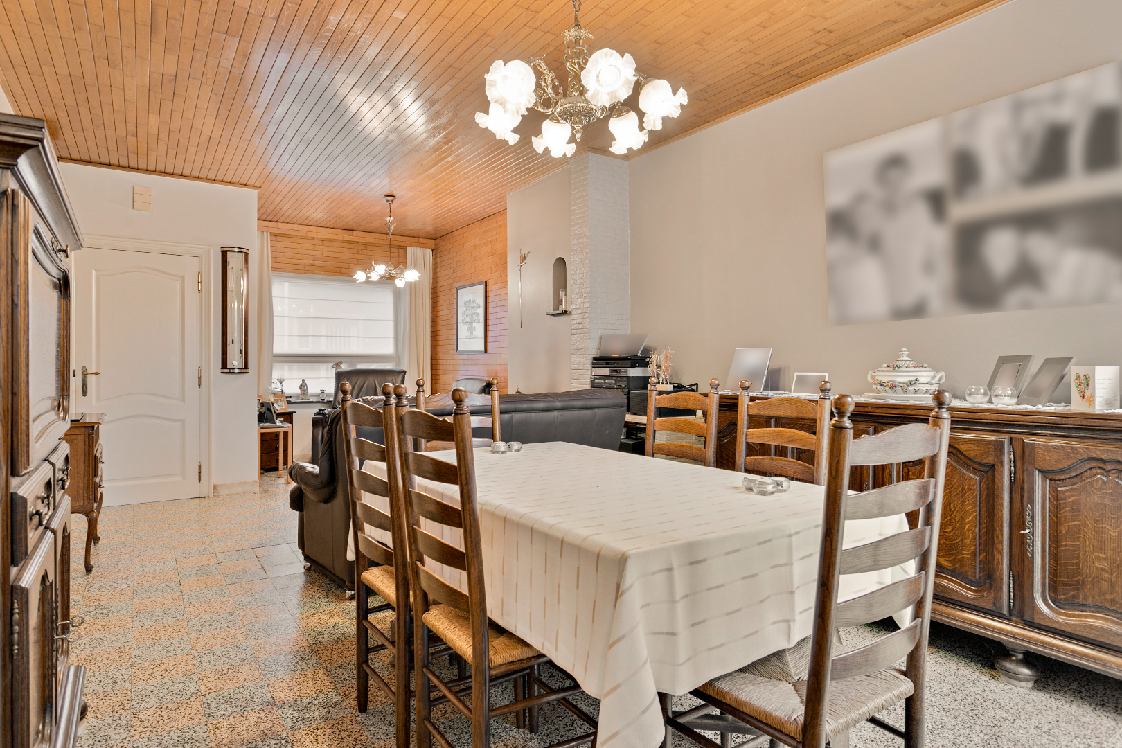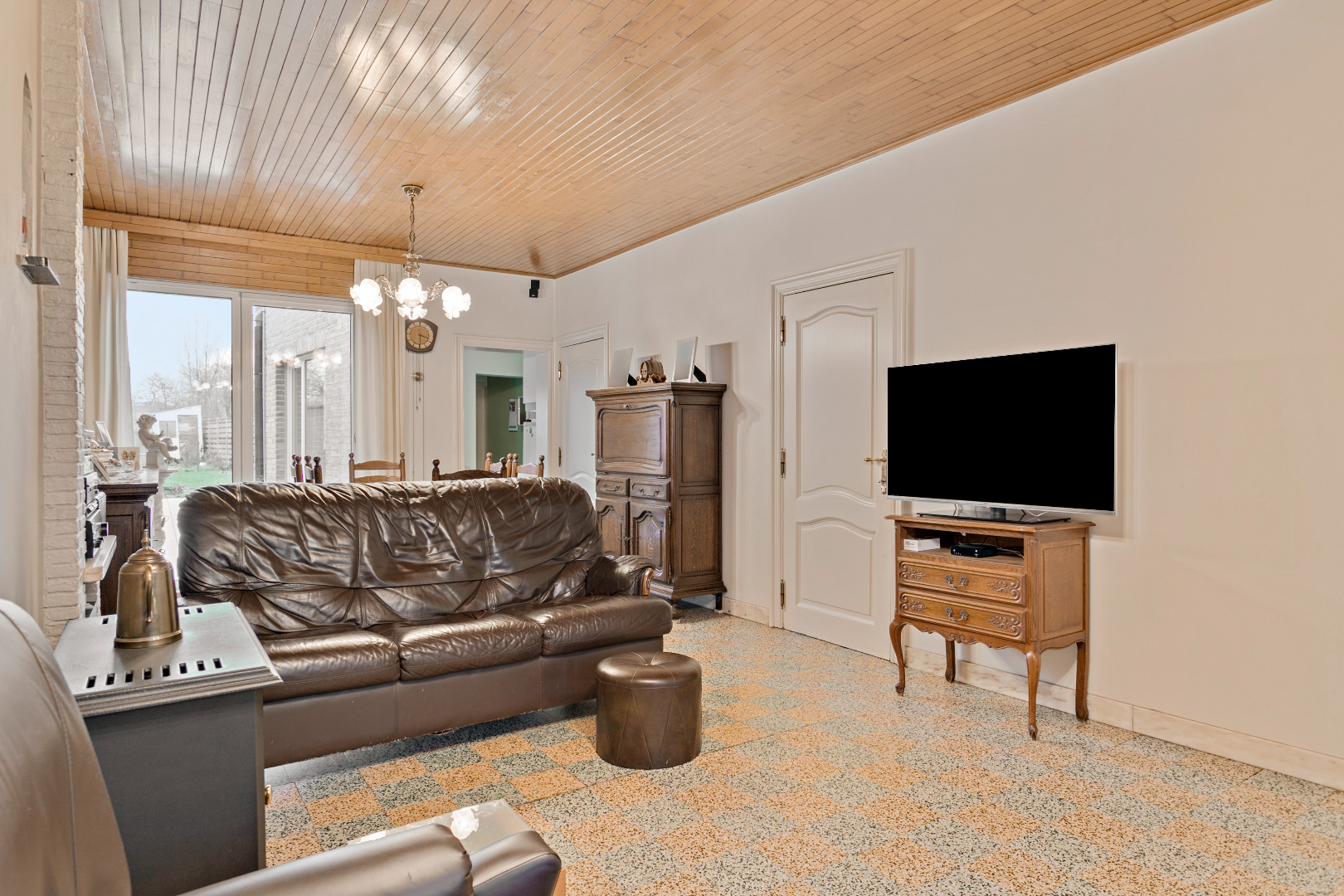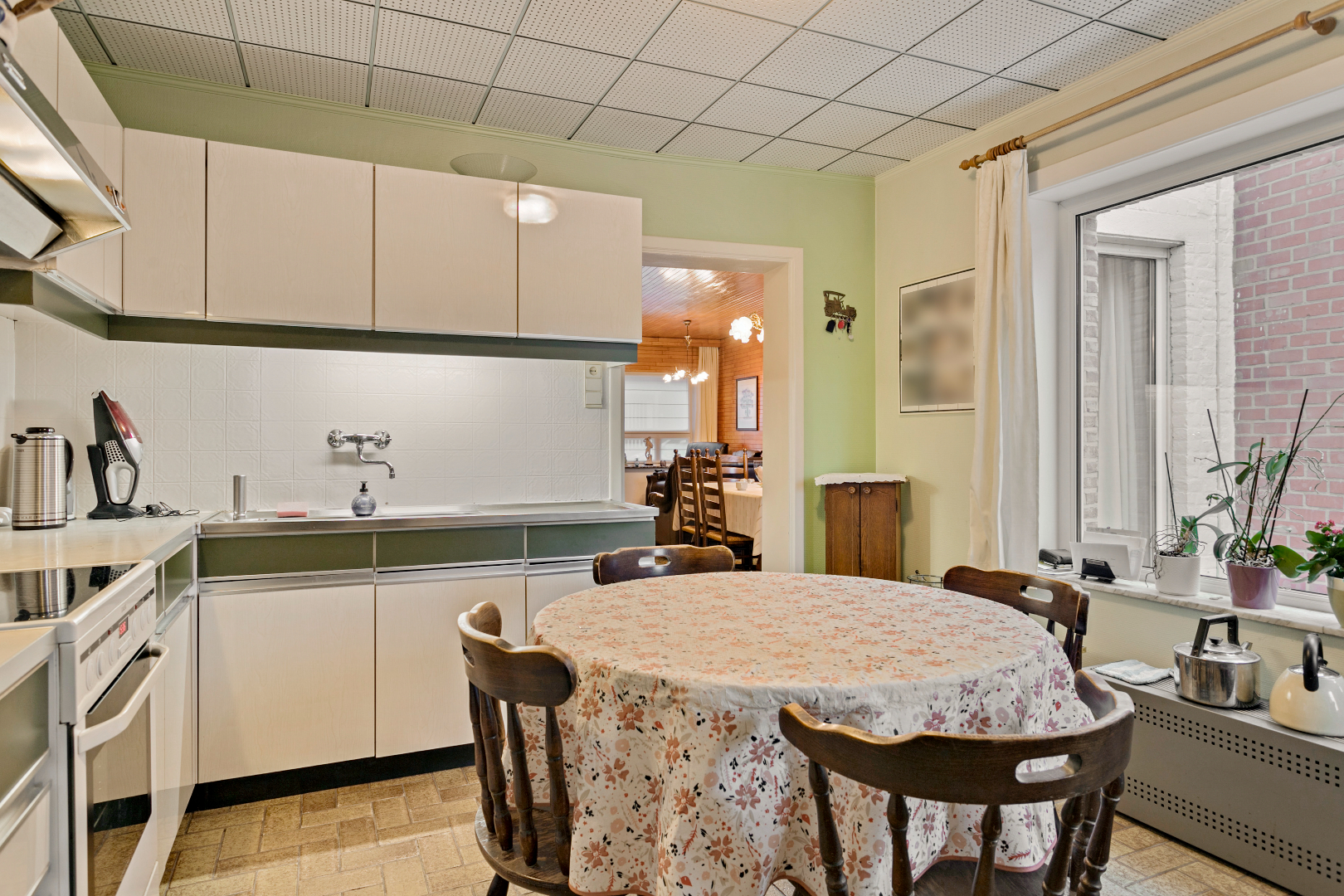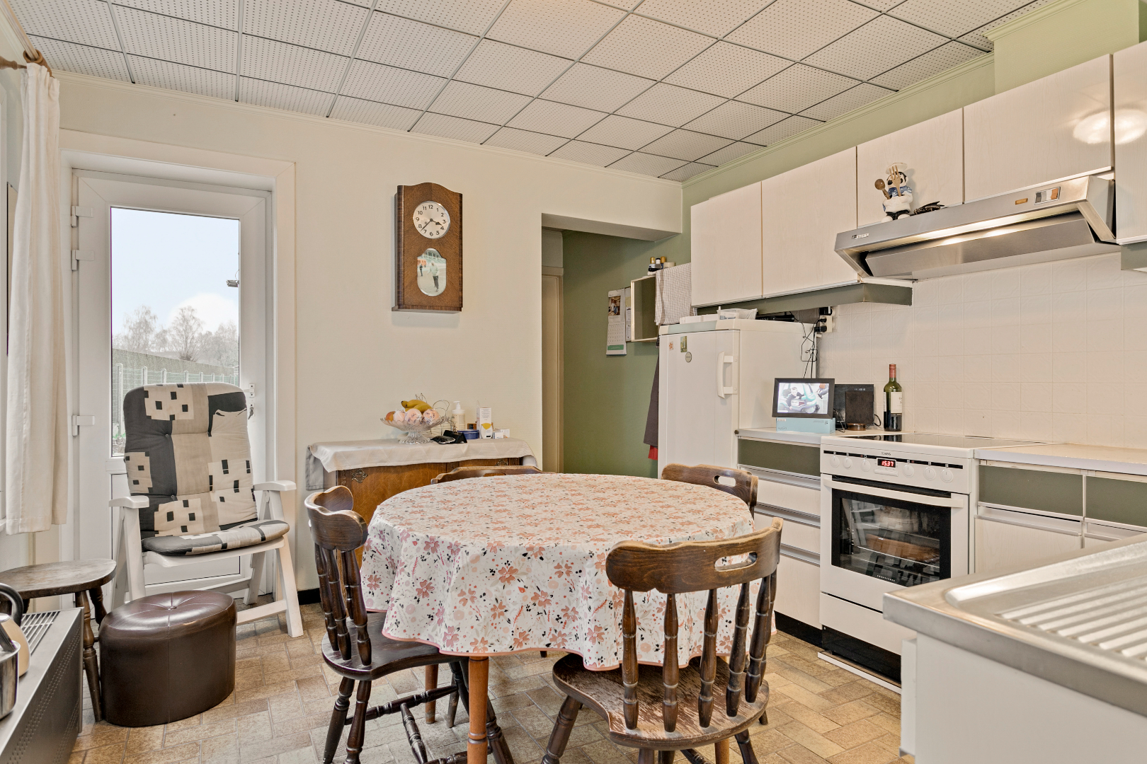 We komen binnen in de inkomhal en betreden vervolgens de leefruimte. Deze is heel gezellig en lichtrijk. Hierachter bevindt zich de keuken. Ook in keuken is er veel licht. We kunnen van hieruit ook rechtstreeks naar de koer en tuin. Verder is er nog een toilet met aansluitend een handige berging met plaats voor wasmachine en droogkast.