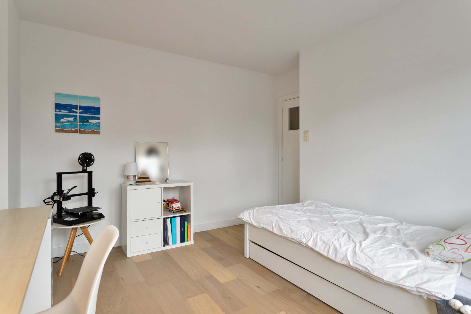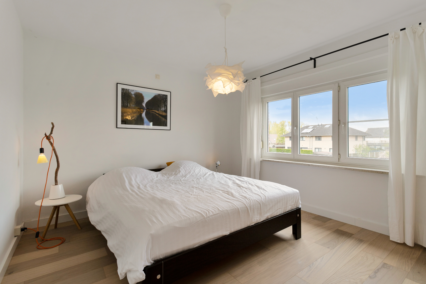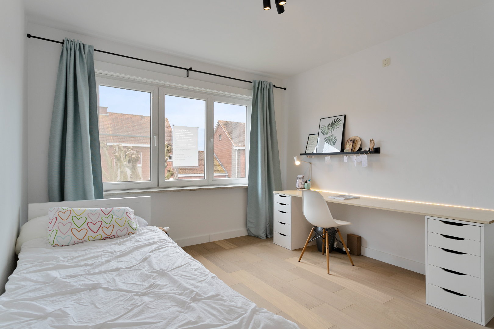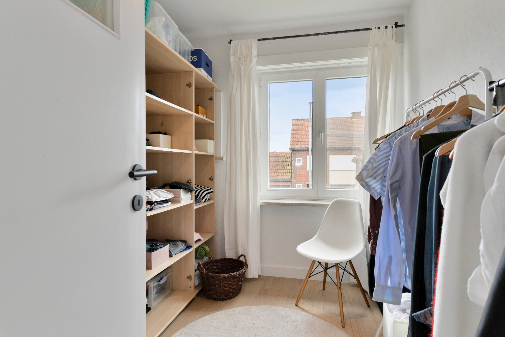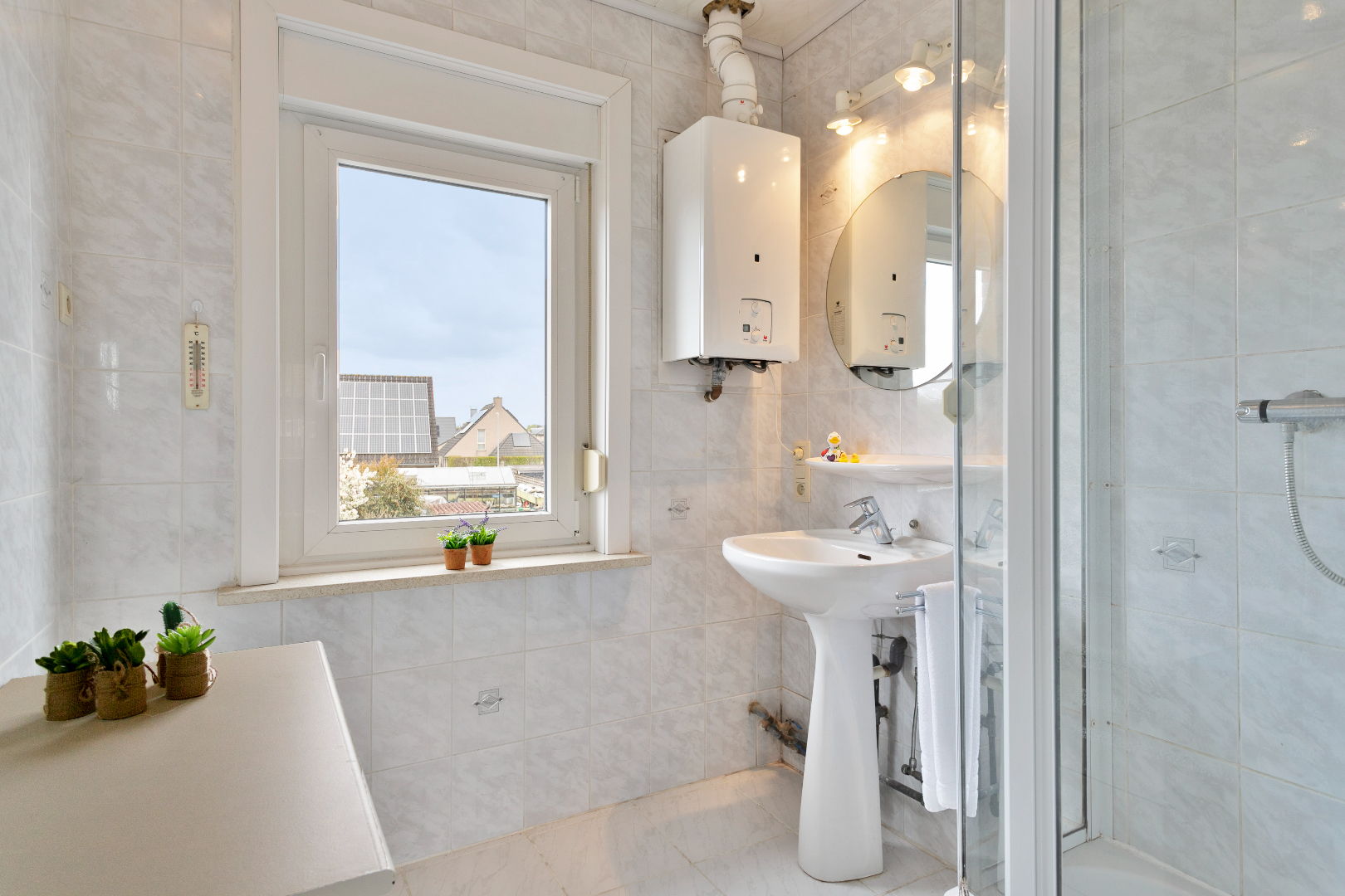 Op de eerste verdieping zijn er 2 ruime slaapkamers en 1 kleinere. De kamers werden vorig jaar allemaal voorzien van parket. De badkamer heeft een lavabomeubel en douche. Er is eveneens een geïsoleerde zolder. Mits het steken van een vaste trap kan hier nog een extra kamer worden ingericht.