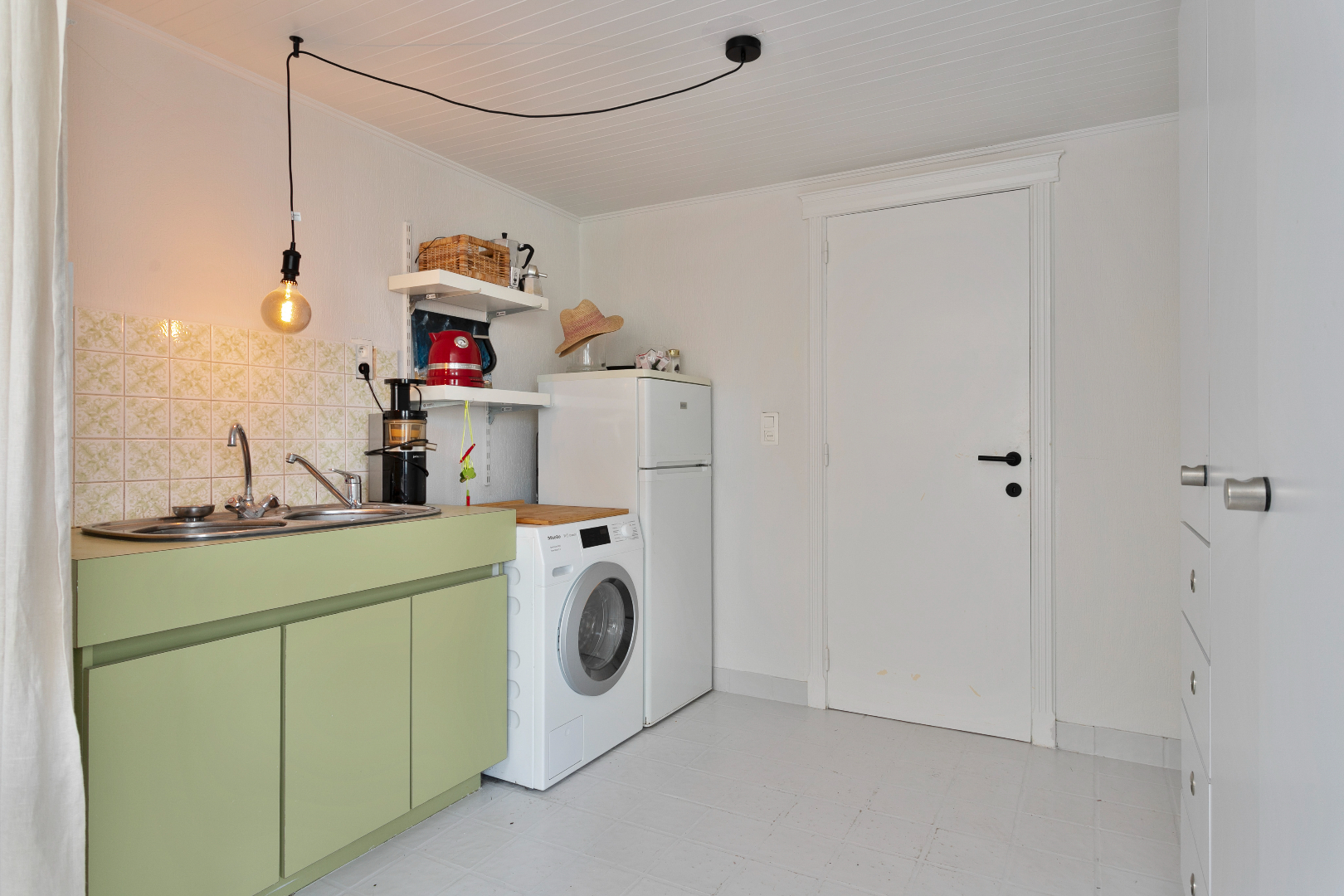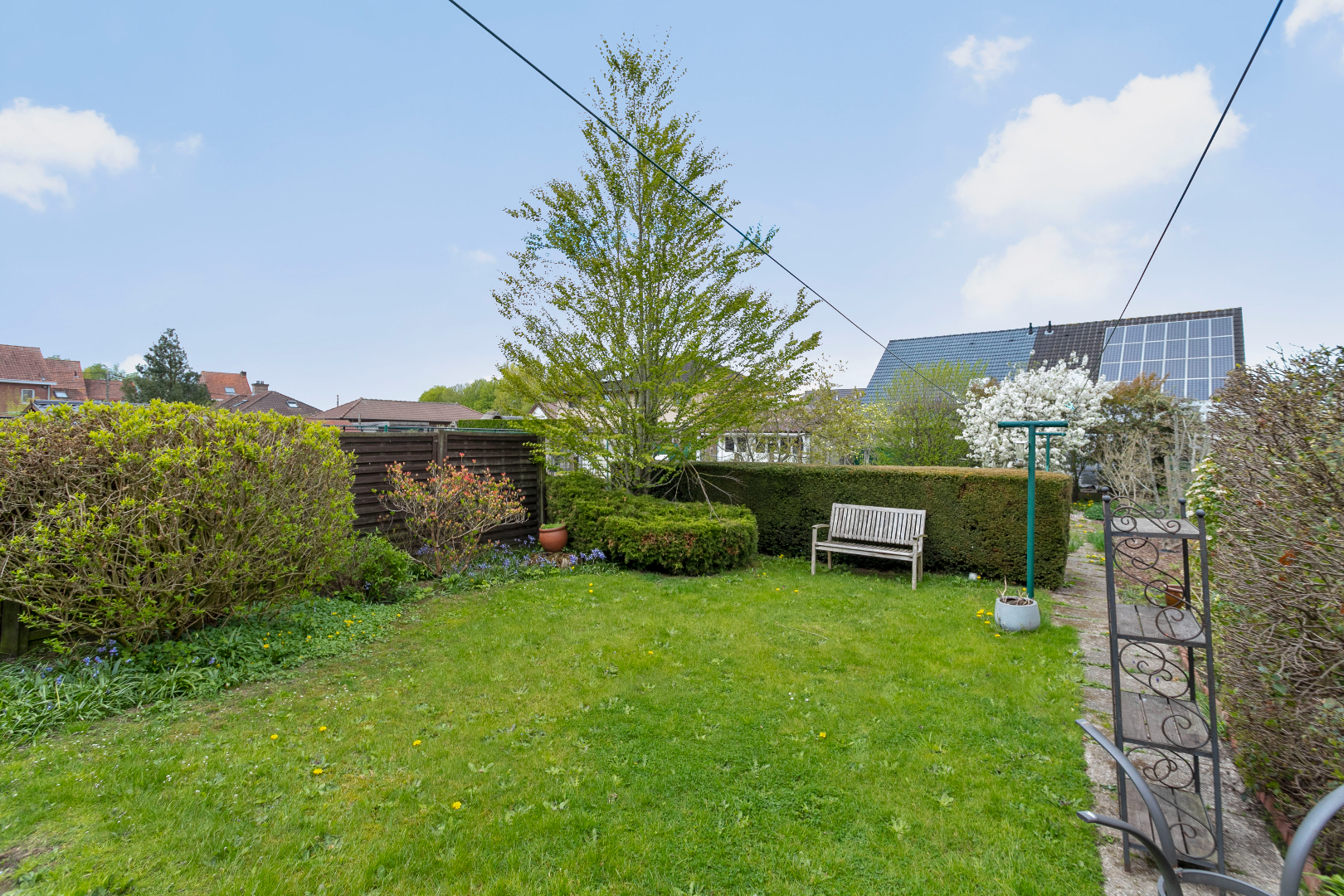 Via de voortuin met oprit komen we de woning binnen in de hal. Deze beschikt over een apart toilet en een vestiaire. De living is lichtrijk en heel gezellig. We hebben van hieruit ook een schitterend zicht op de grote tuin. Aansluitend treffen we de keuken met aansluitend een bijkeuken met voldoende plaats voor een wasmachine en droogkast. Deze bijkeuken gaat over in een aangename extra zitruimte. Dit kan bijvoorbeeld de ideale plek zijn voor een bureau. Vanuit de bijkeuken is er ook rechtstreeks toegang tot de inpandige garage met elektrische poort. Er is hier ook nog een eerste handige bergzolder.